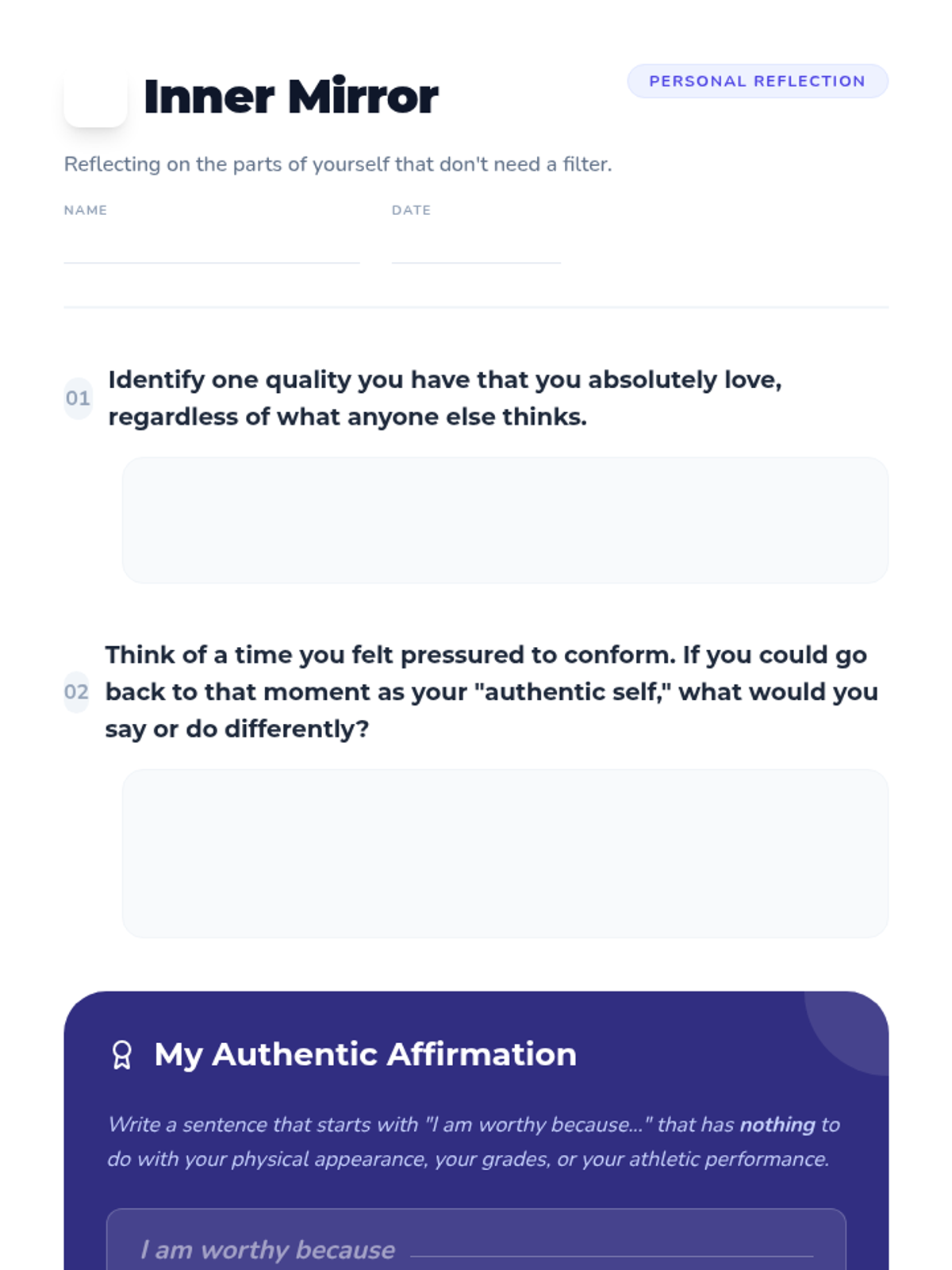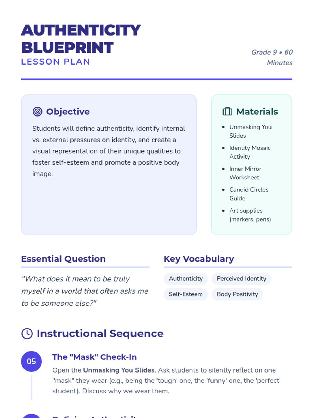 This lesson empowers 9th-grade students to explore and celebrate their individual identities, understanding that authenticity is a source of strength and connection. It focuses on fostering self-esteem, promoting positive body image, and encouraging students to live in alignment with their true selves through creative and reflective activities.