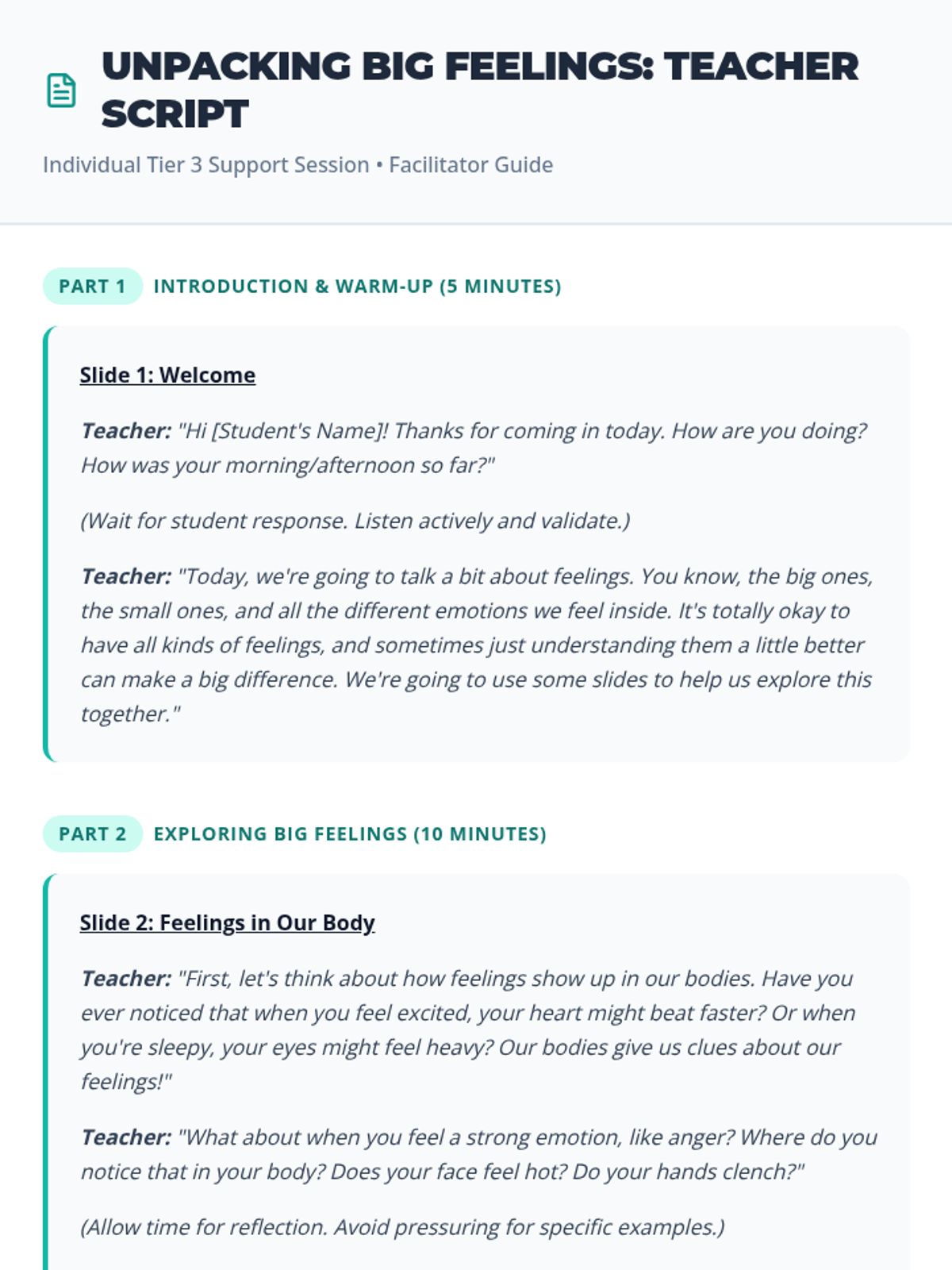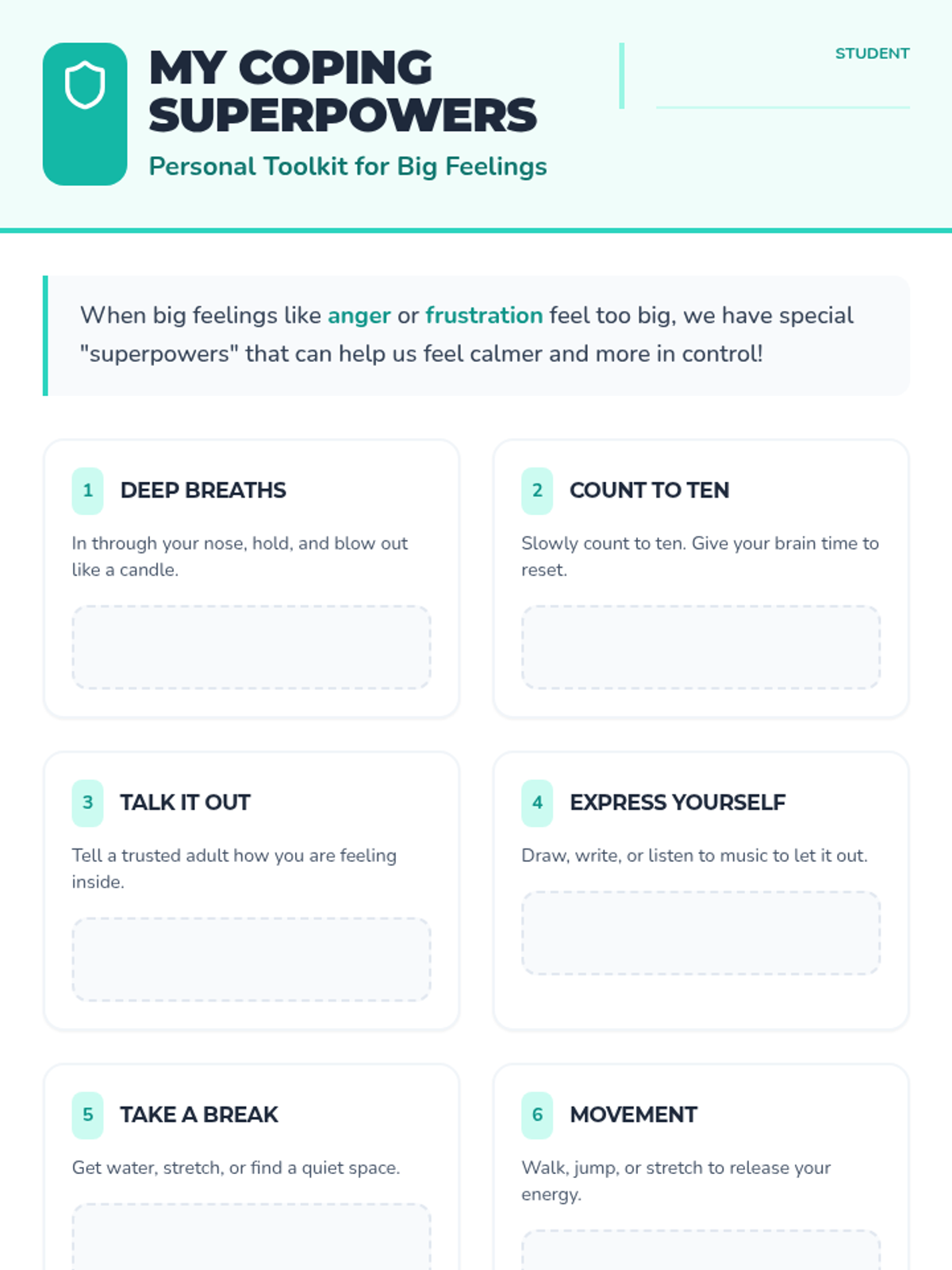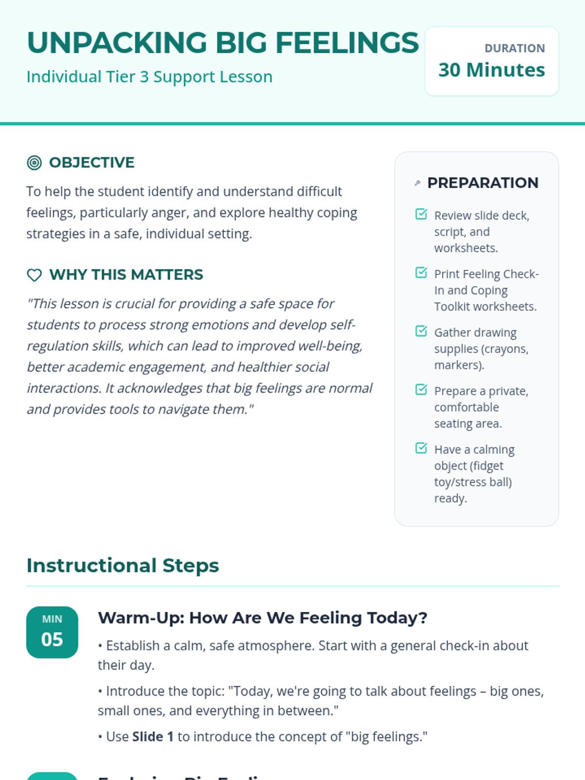 This individual Tier 3 lesson helps 4th-grade students explore and understand difficult emotions, especially anger, and learn healthy ways to cope through guided conversation and reflective activities.