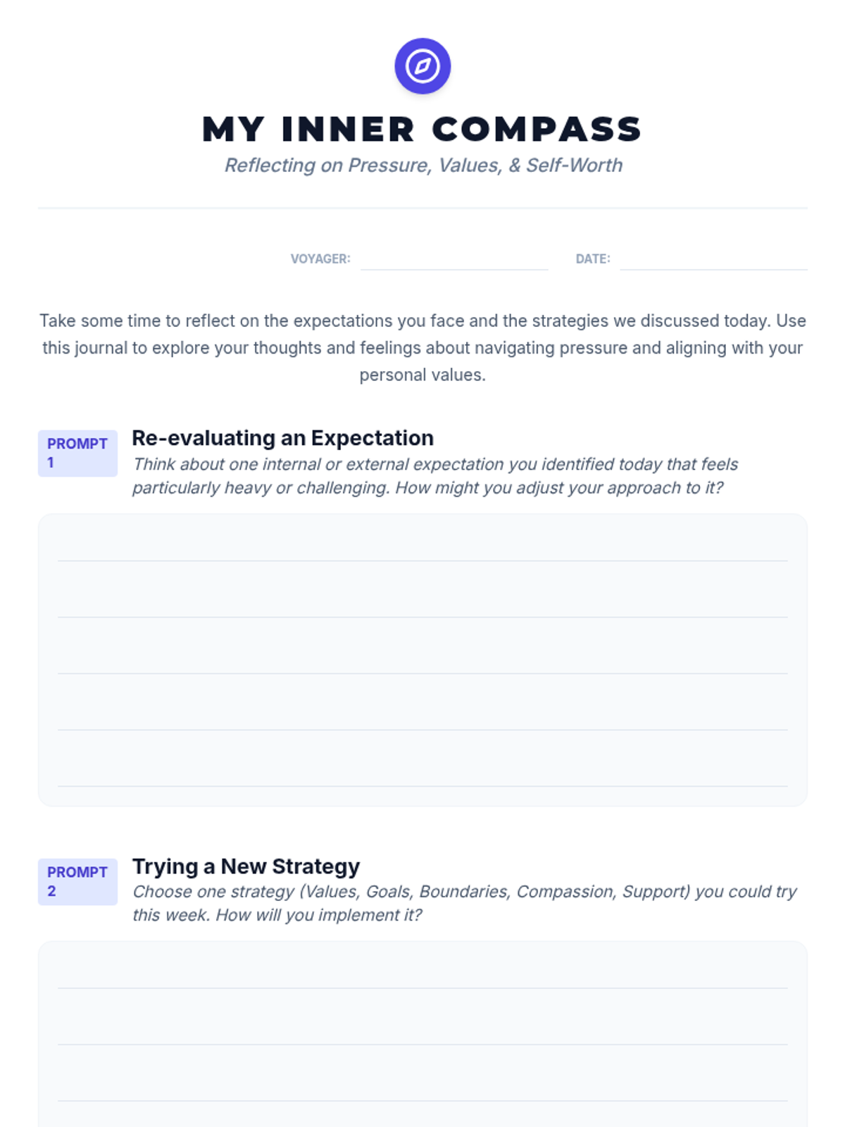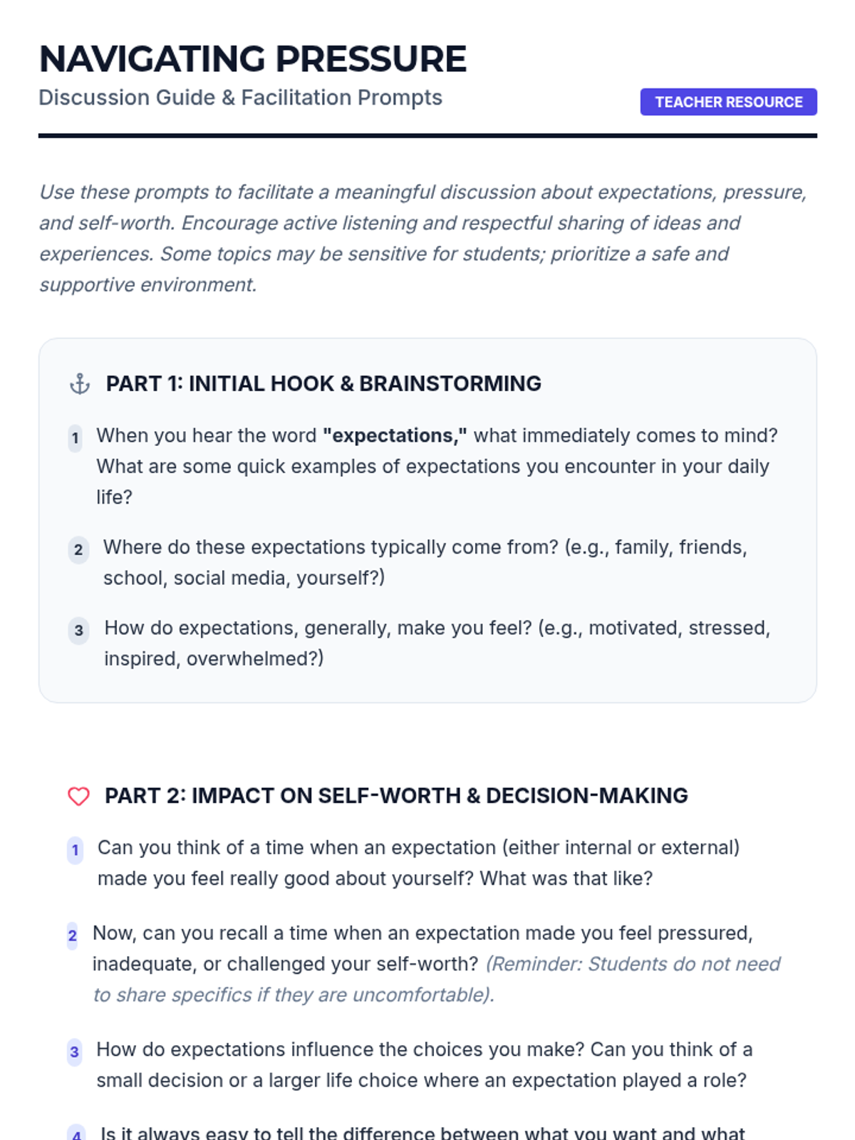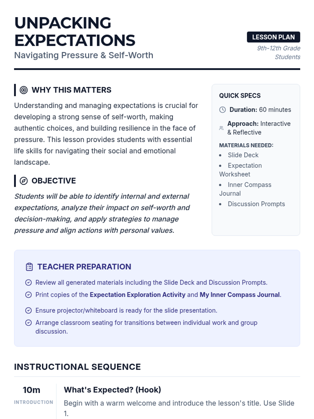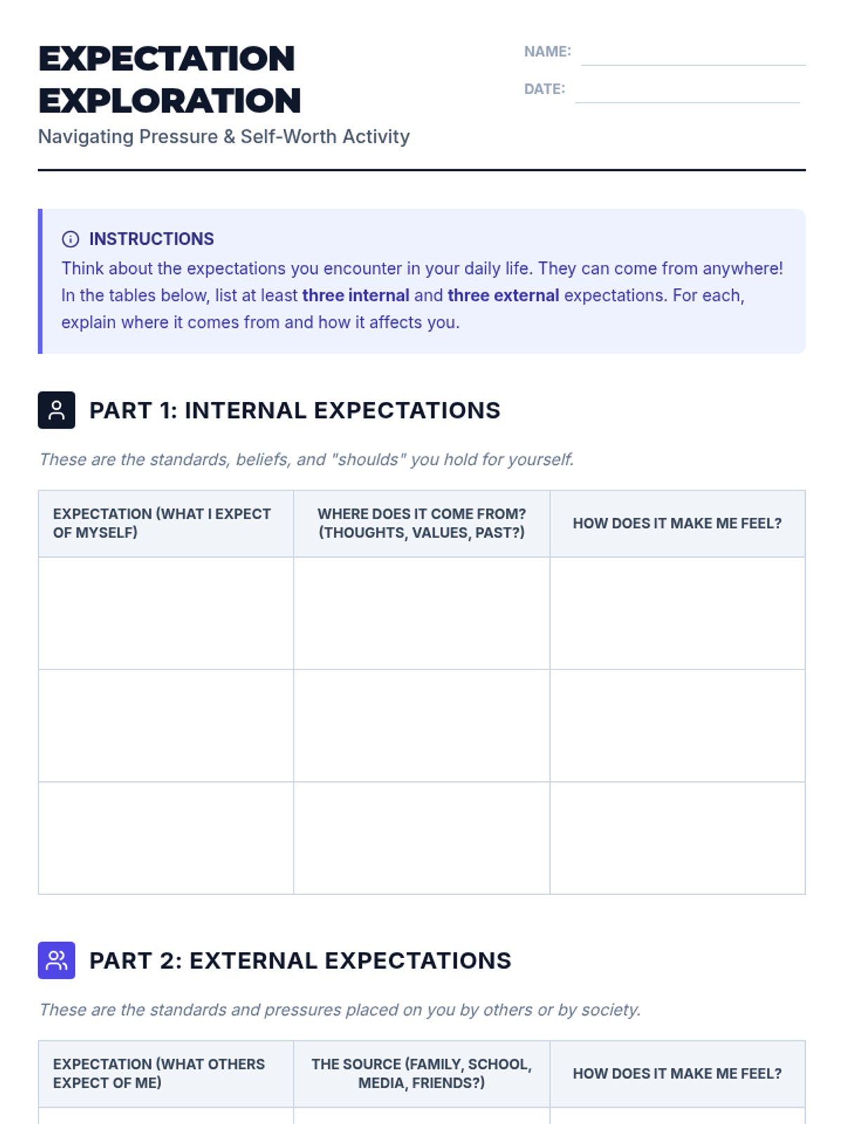 A 60-minute lesson for 9th-12th grade students focusing on identifying internal and external expectations, managing pressure, and aligning actions with personal values for better self-worth.