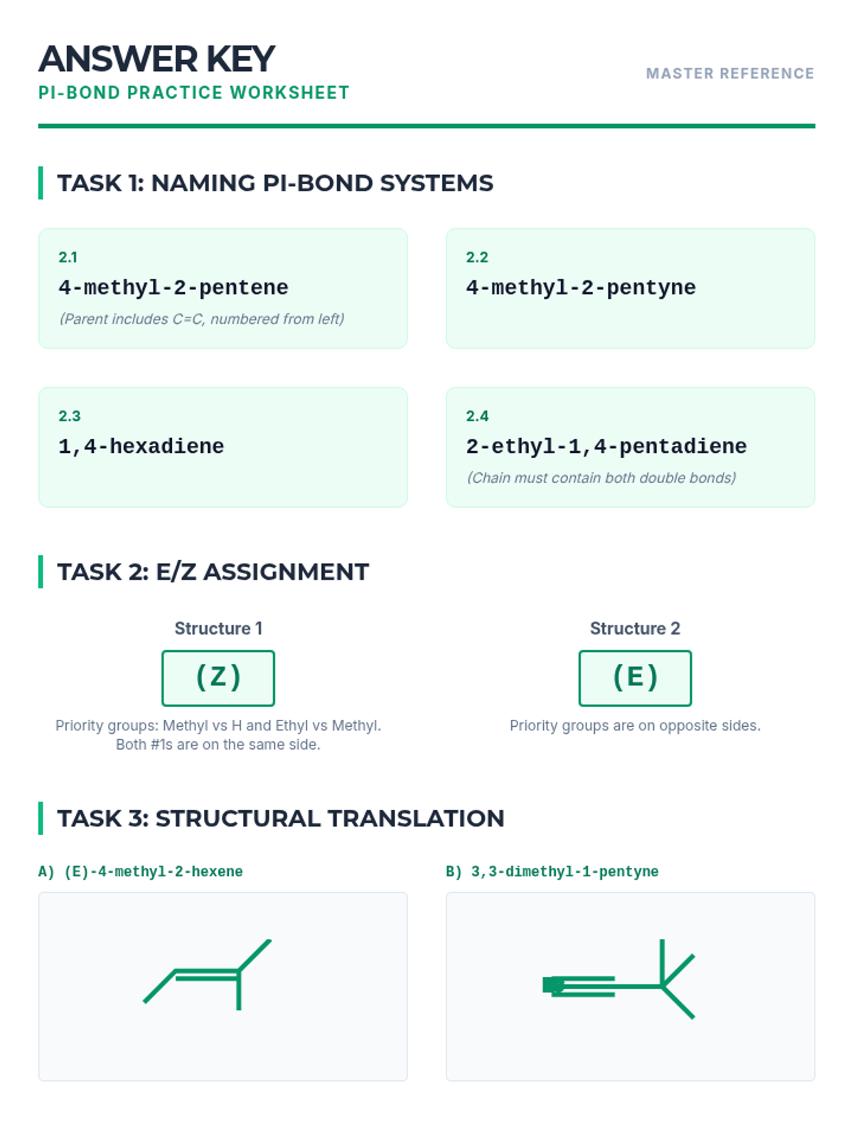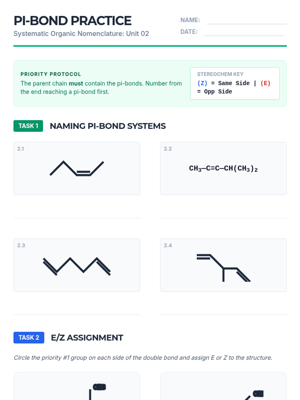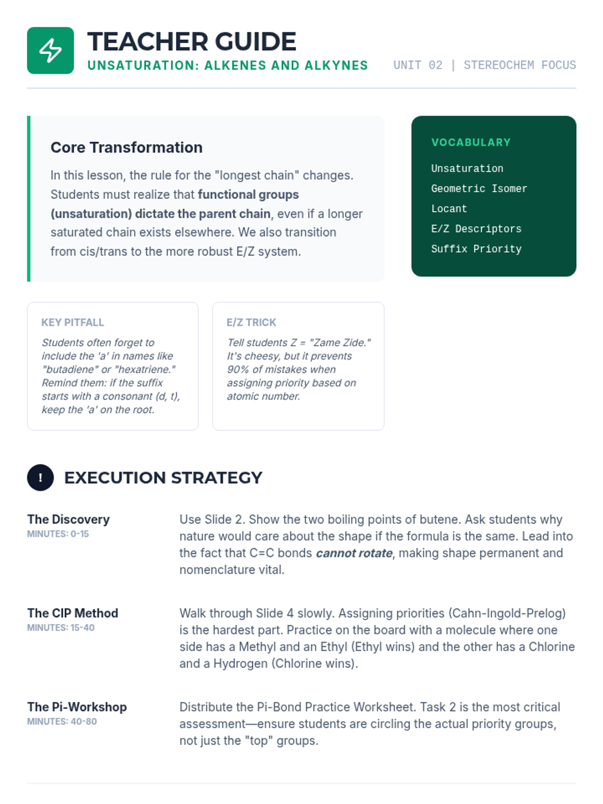 Introduce double and triple bonds, teaching students how prioritizing unsaturation alters the numbering of the parent chain and assigning stereochemistry descriptors.