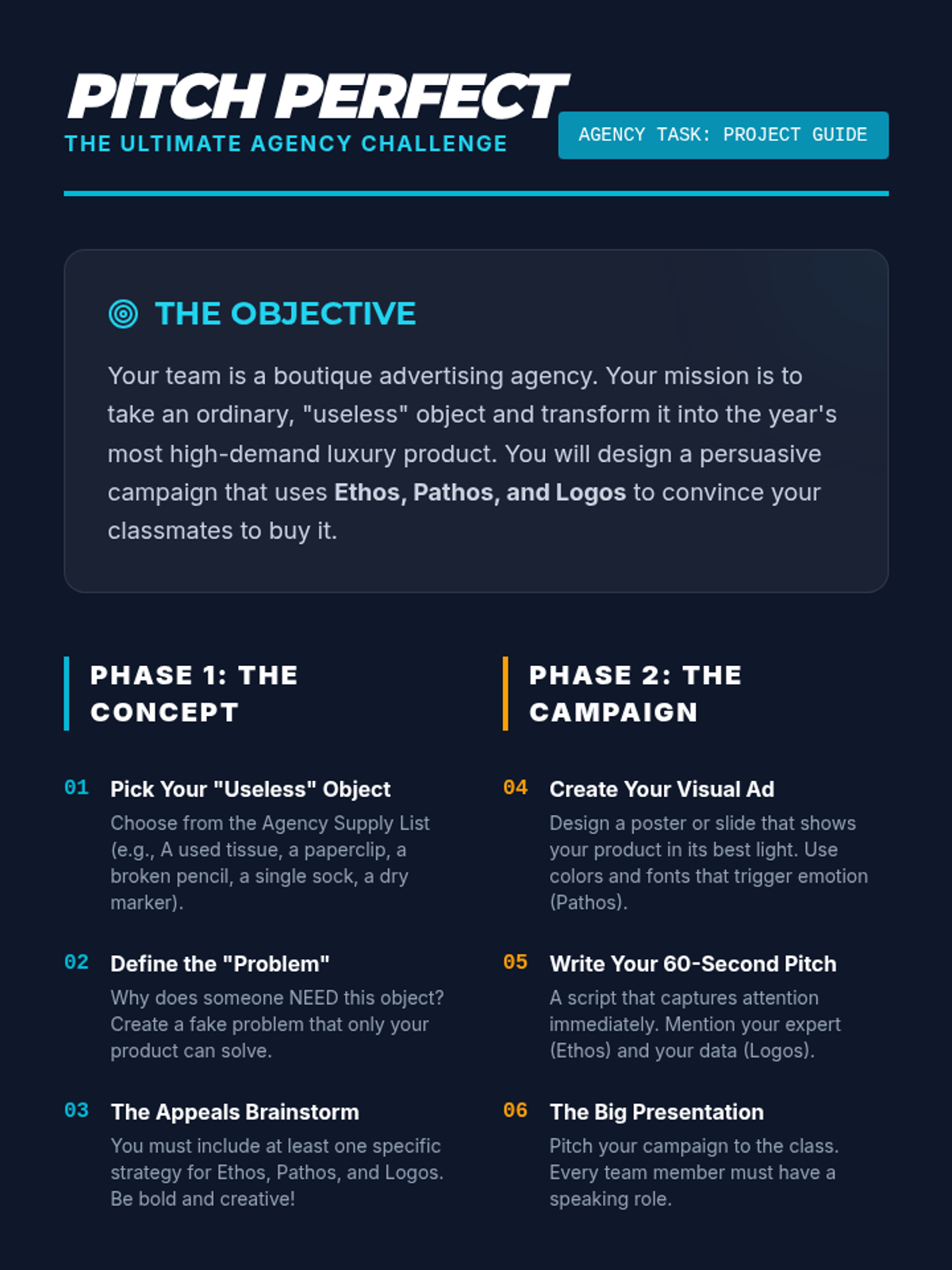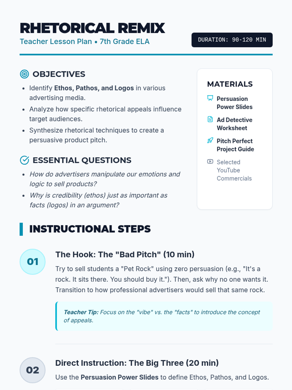 A dynamic 7th-grade ELA lesson where students deconstruct advertising techniques (Ethos, Pathos, Logos) and apply them to create their own persuasive product campaigns.