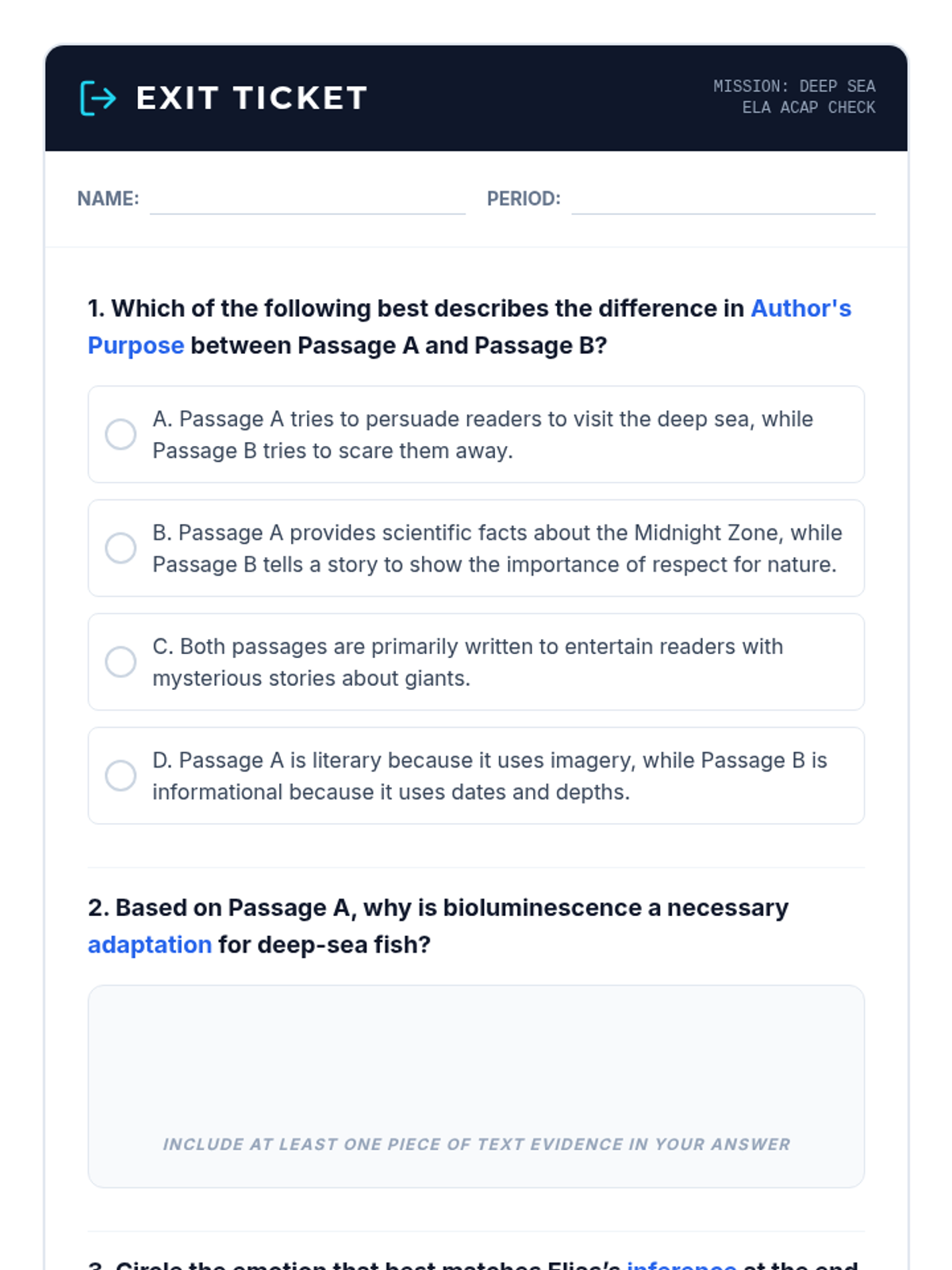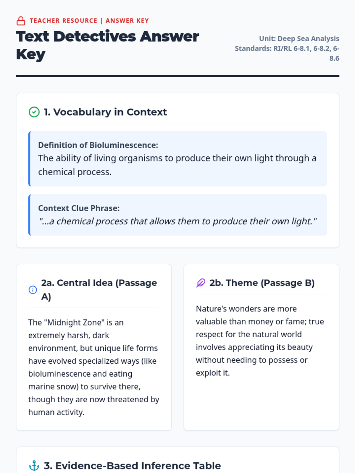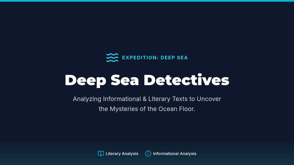 A 45-minute middle school ELA lesson focused on comparing informational and literary texts through the lens of deep-sea exploration. Students analyze author's purpose, determine central ideas, and cite evidence to support inferences using Alabama ACAP-aligned strategies.