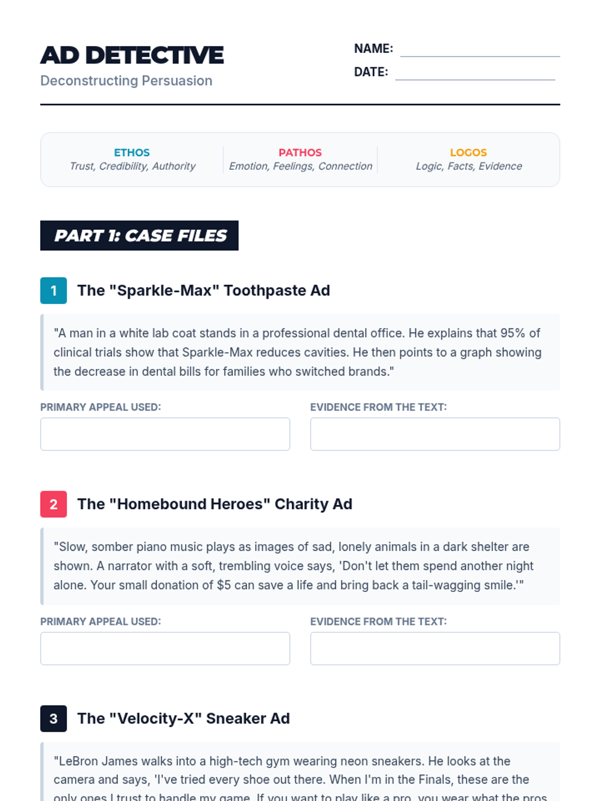 Students explore the core pillars of persuasion (Ethos, Pathos, Logos) and how they are used in modern advertising to influence consumer behavior.