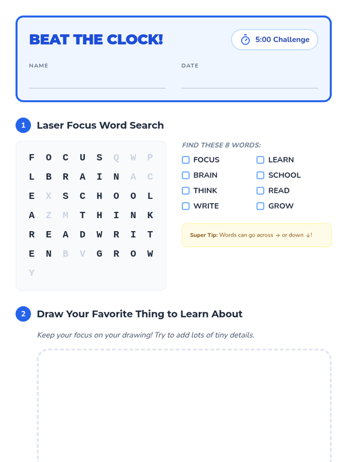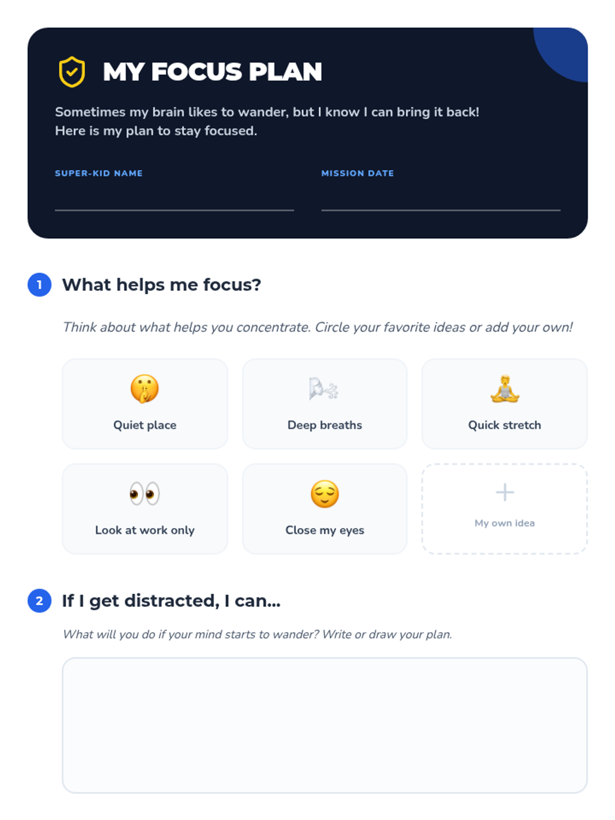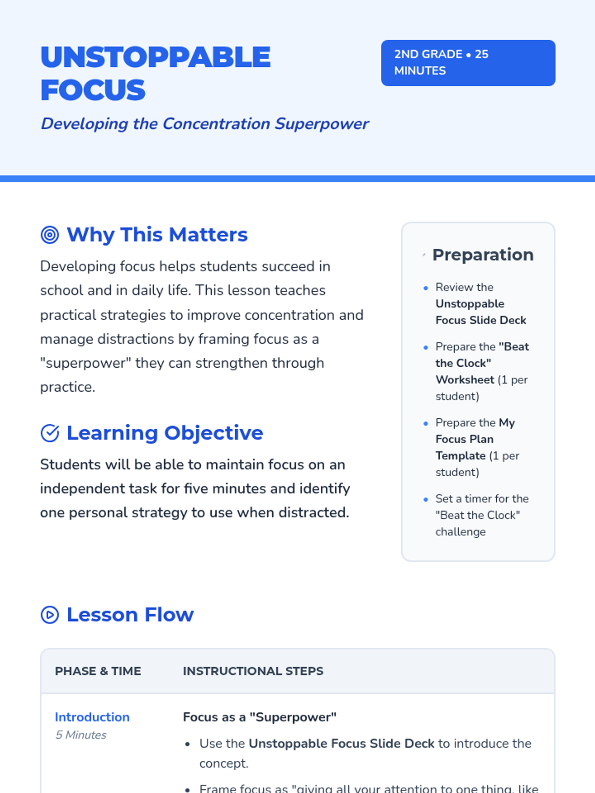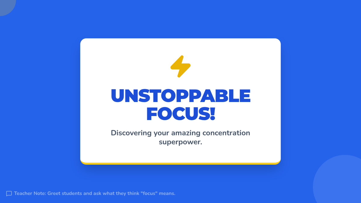 A 25-minute lesson for 2nd graders to discover their 'focus superpower' through mindful exercises, an independent concentration challenge, and personal strategy planning.