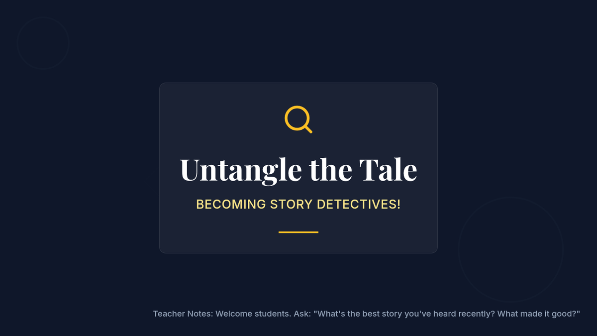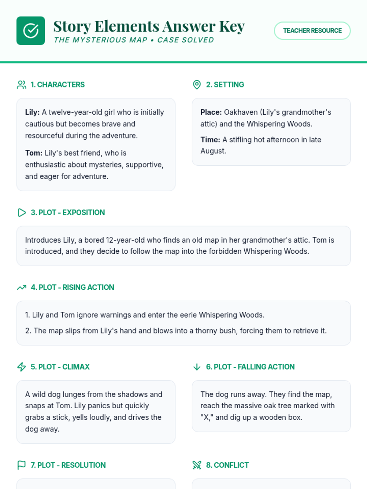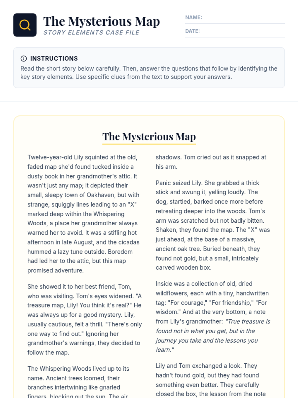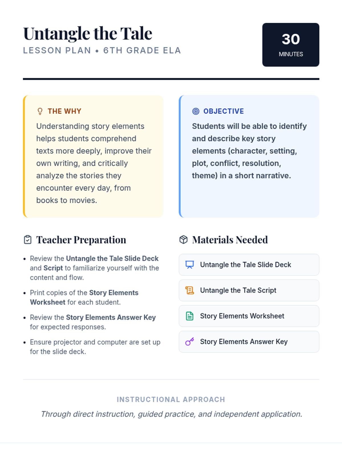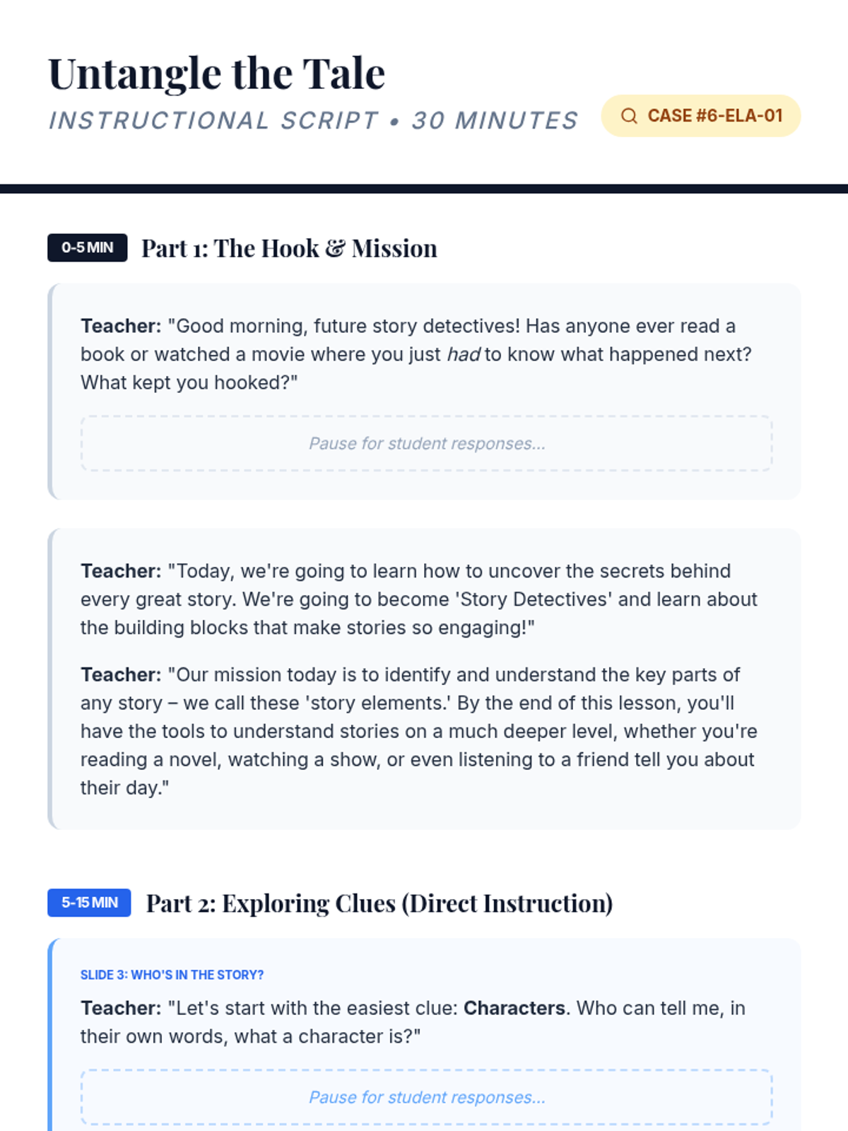 A comprehensive 30-minute lesson for 6th-grade students to master identifying key story elements like characters, setting, plot, conflict, resolution, and theme using a 'Story Detective' framework.