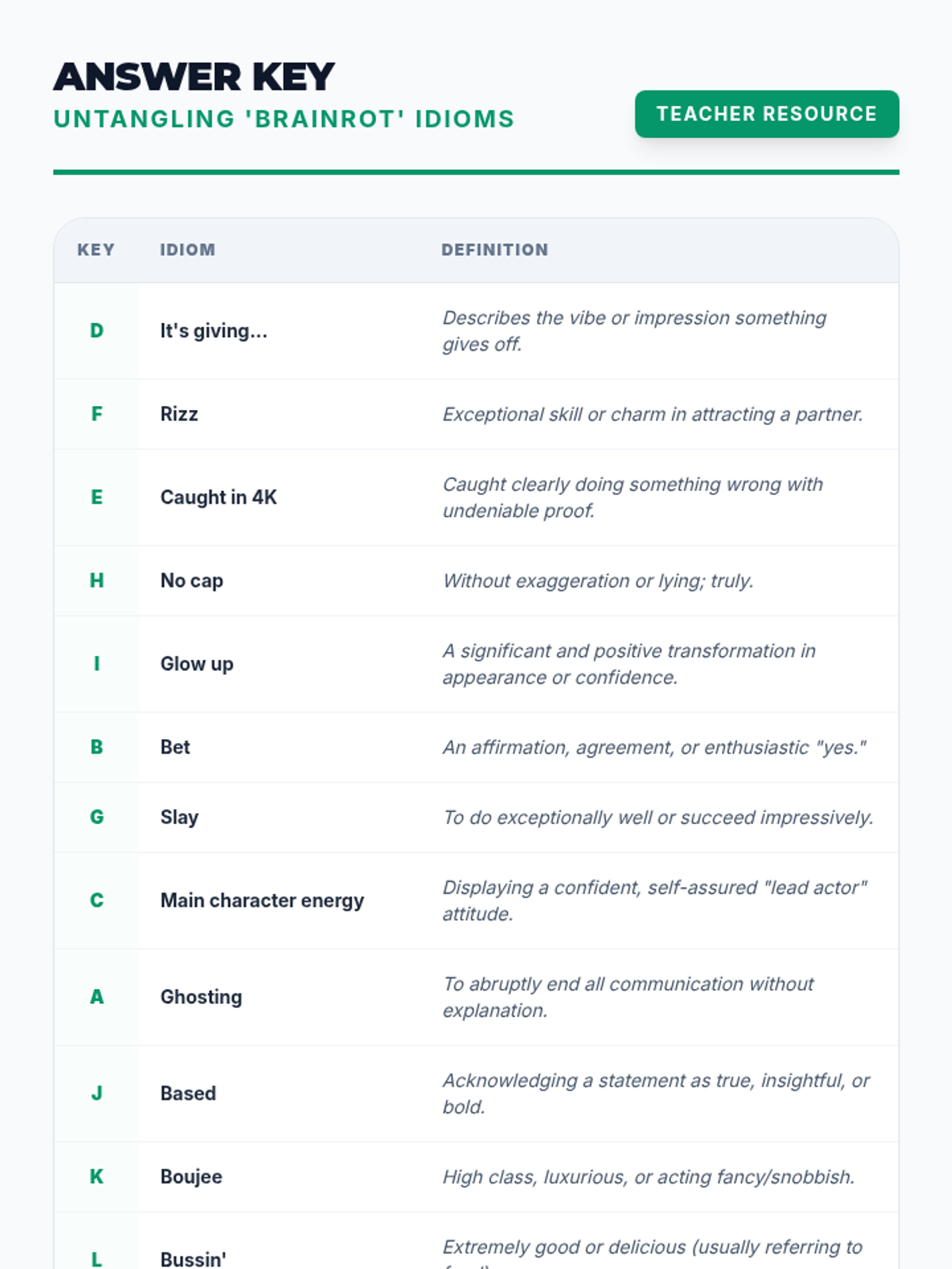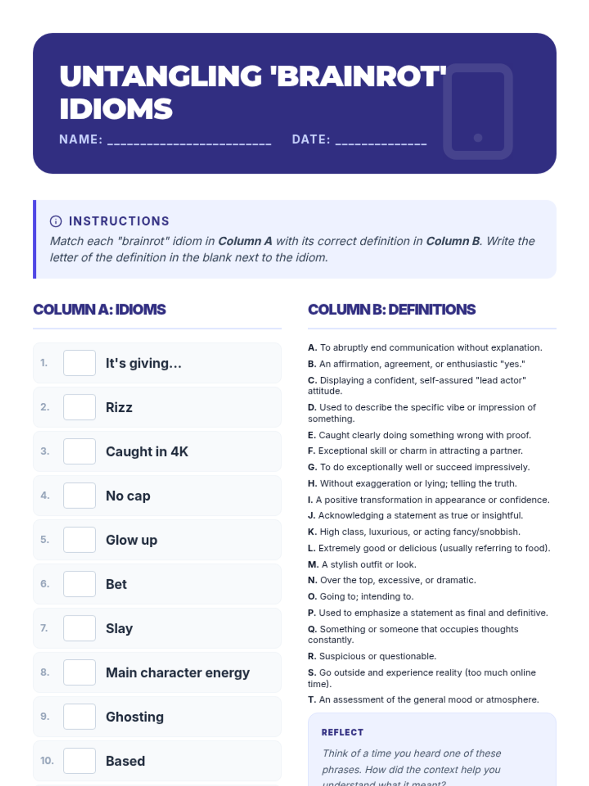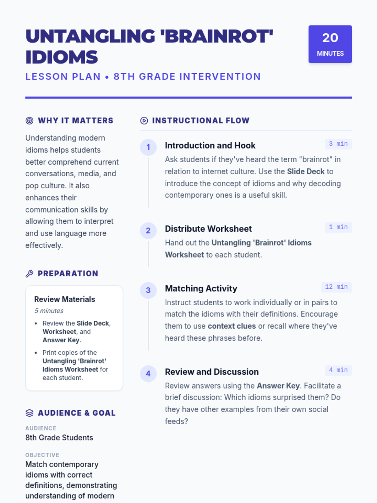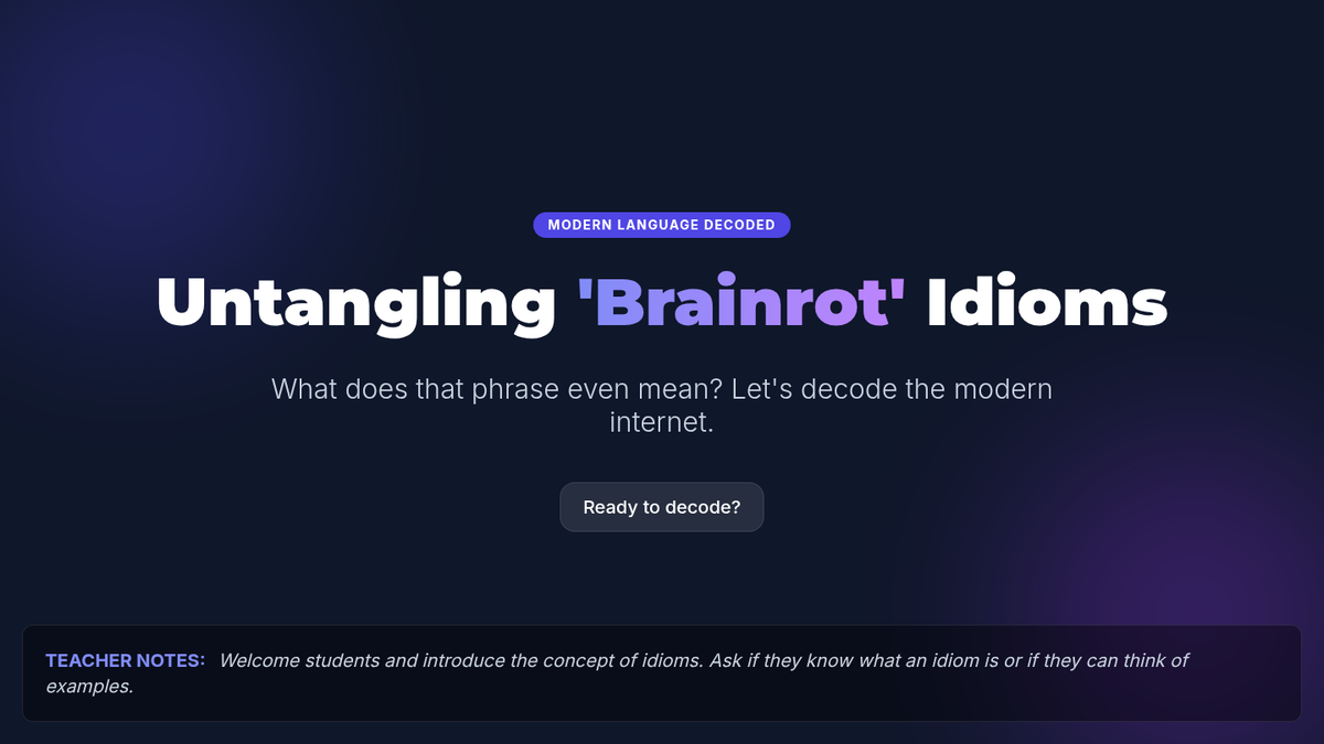 A 20-minute Tier 2 intervention lesson designed for 8th-grade students to decode and understand modern internet idioms, often called 'brainrot' phrases, through matching and discussion.