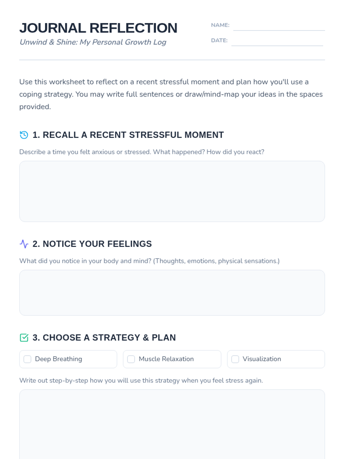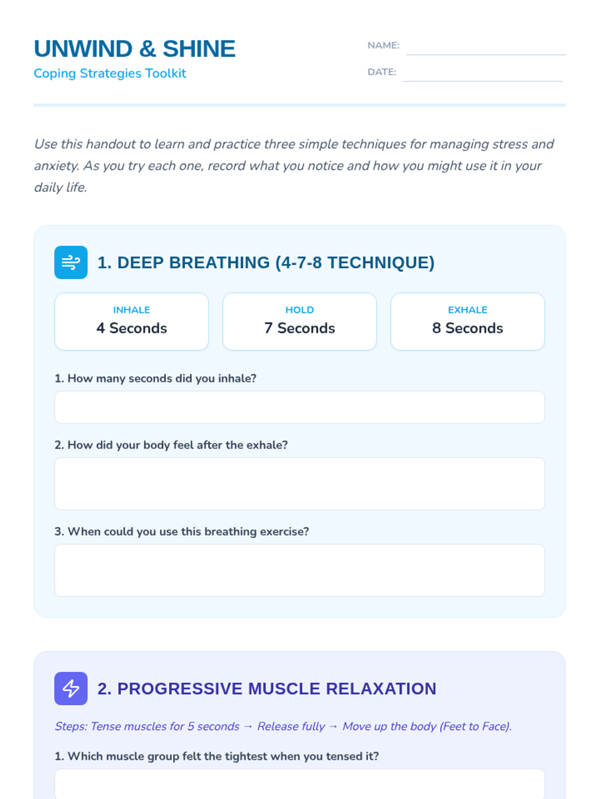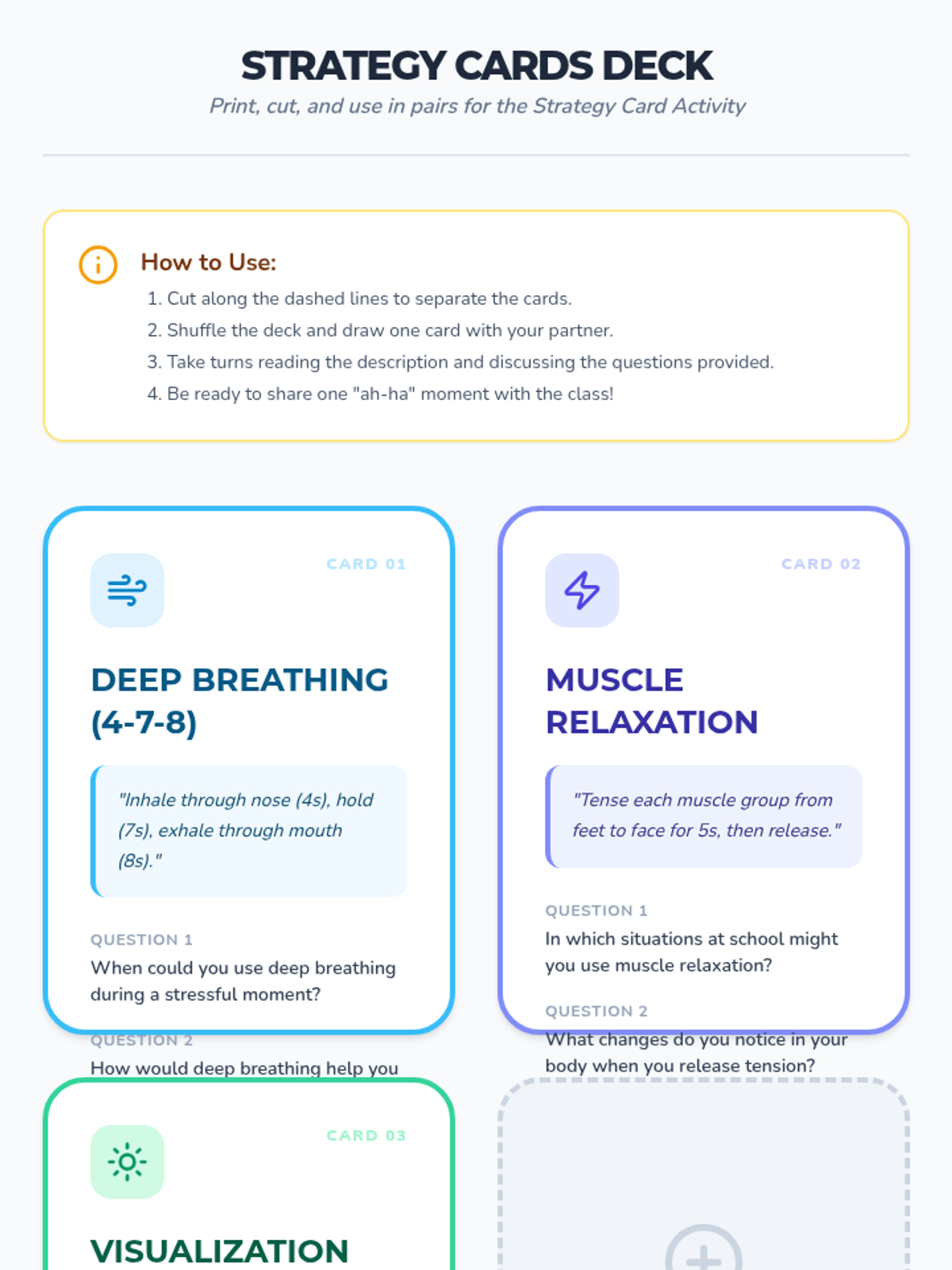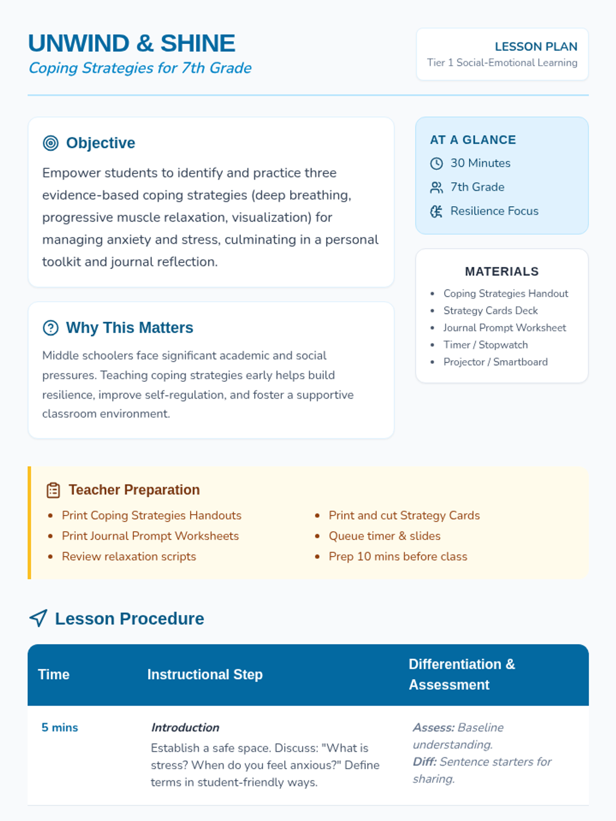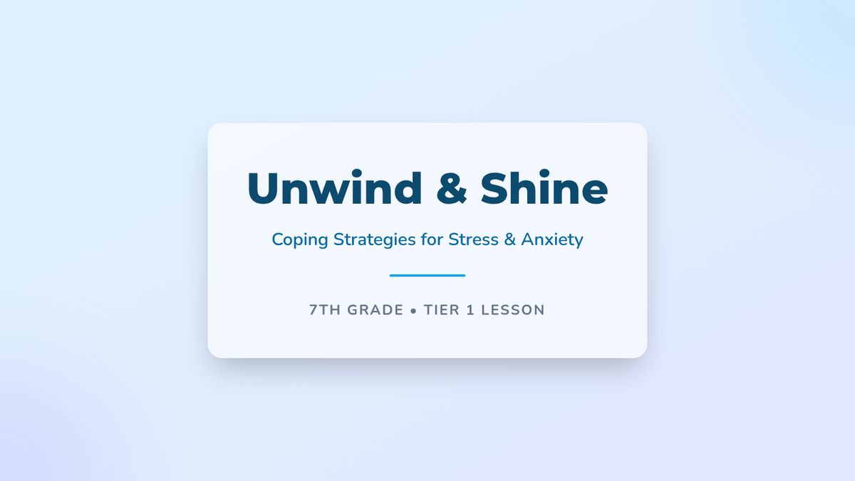 A 30-minute Tier 1 lesson for 7th graders to learn and practice evidence-based coping strategies (deep breathing, muscle relaxation, visualization) to manage stress and anxiety.