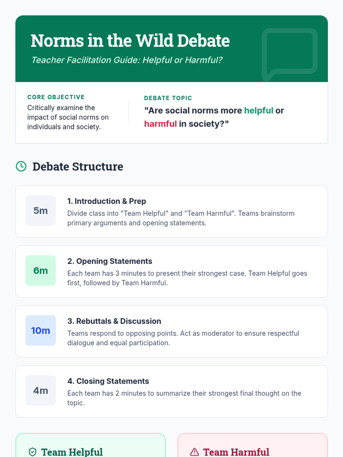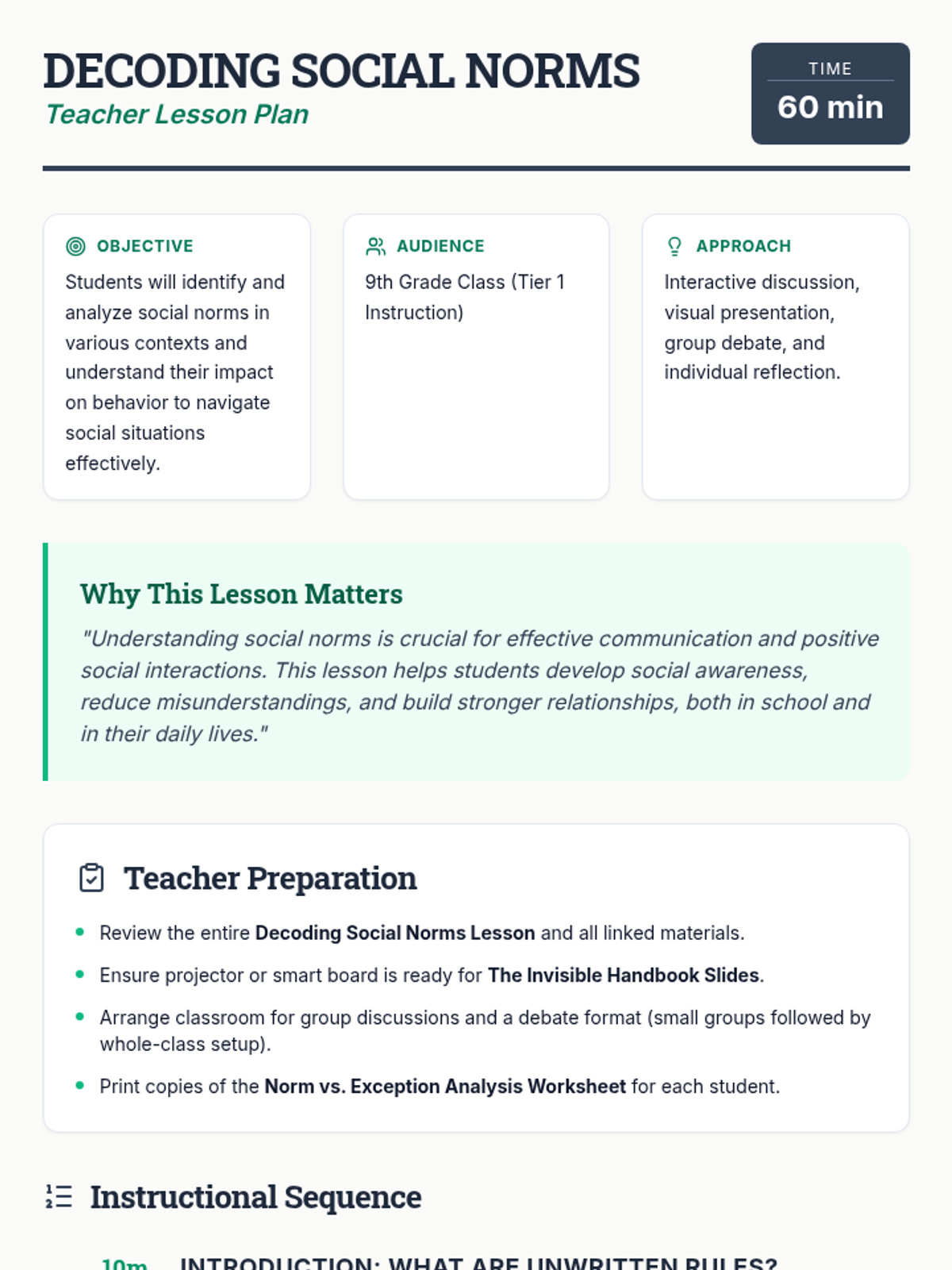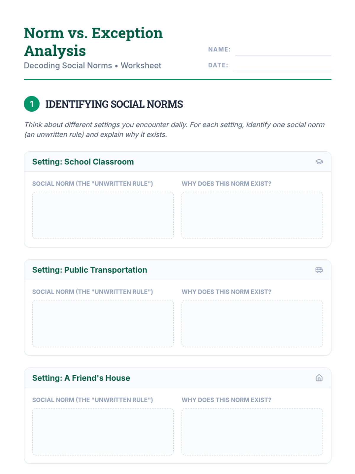 This resource explores the concept of social norms and how they influence behavior in different settings. Understanding these unwritten rules helps 9th-grade students navigate social situations more effectively and respectfully.