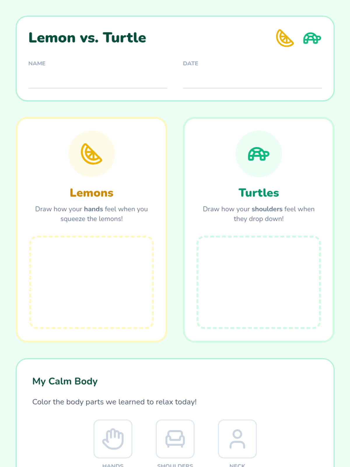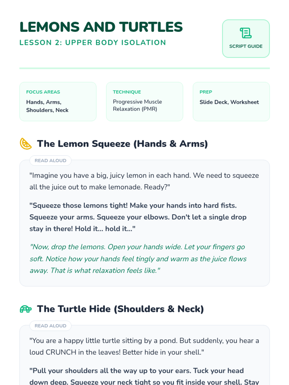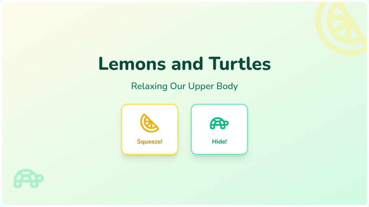 Focusing on the hands, arms, and shoulders, students use imagery like squeezing lemons and hiding in a turtle shell to practice releasing upper body tension.
