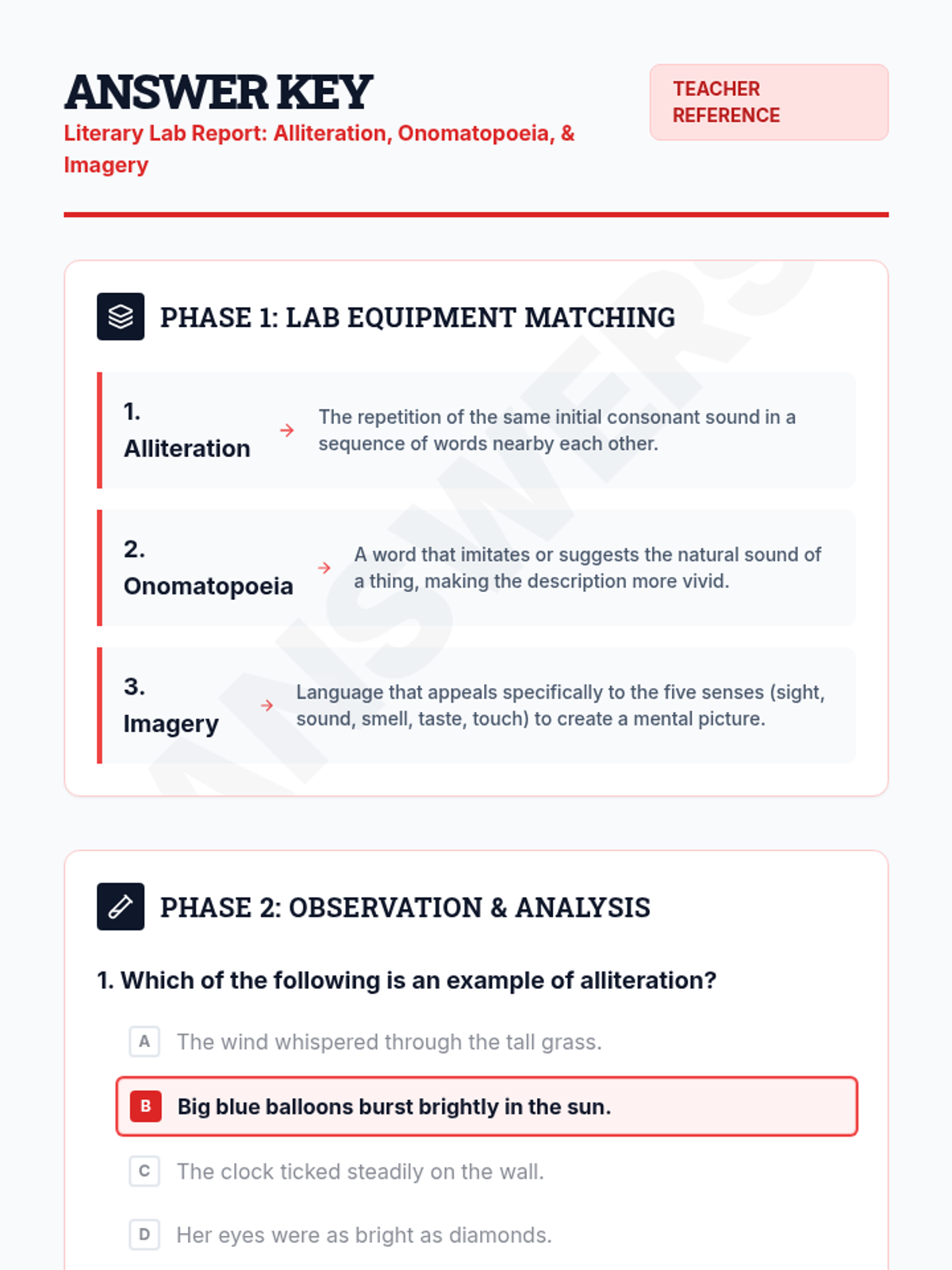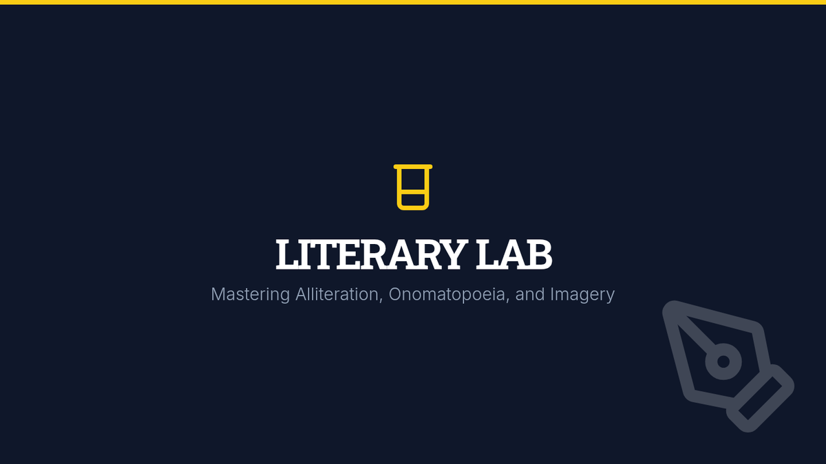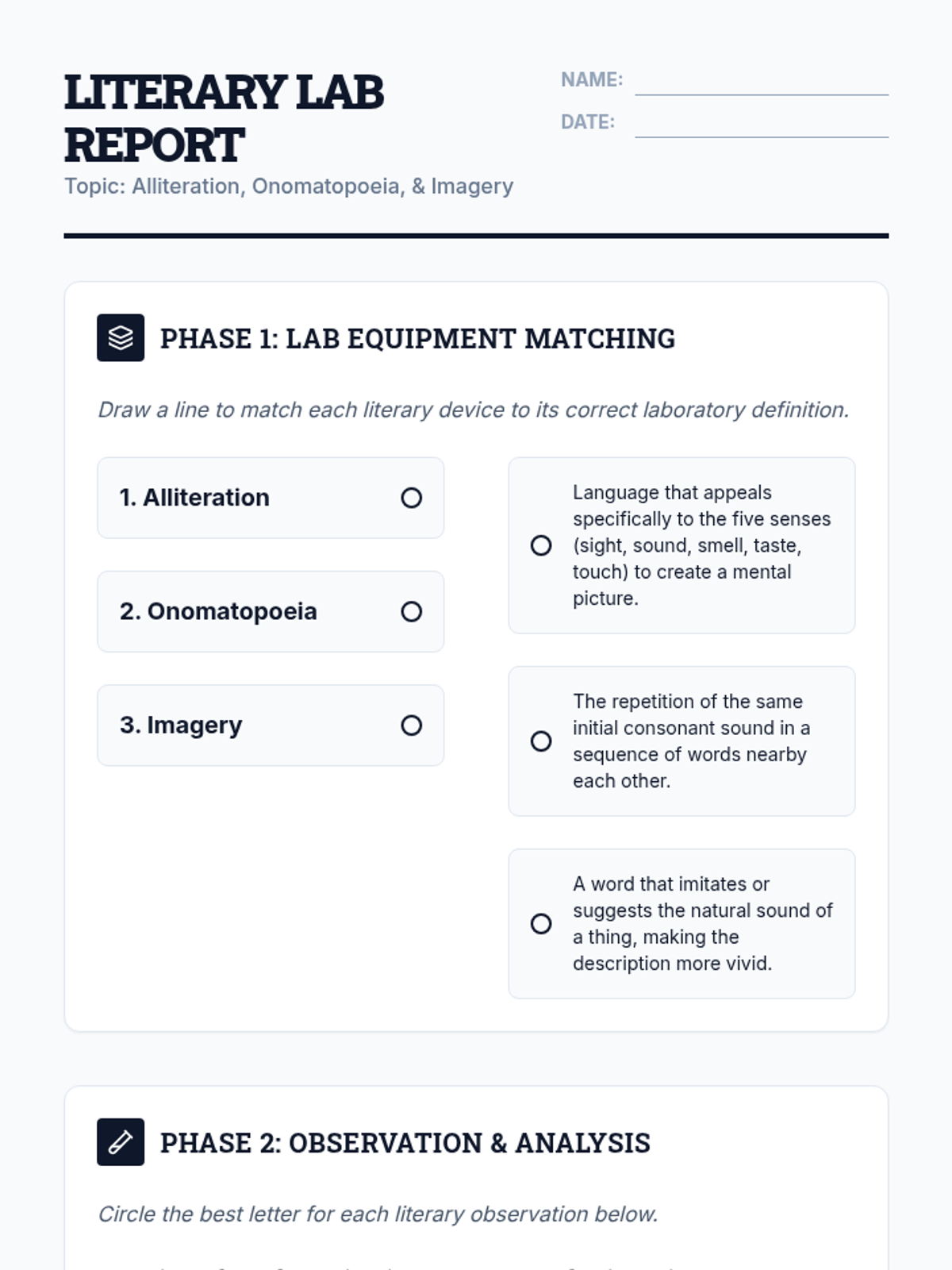 A focused exploration of three key literary devices: alliteration, onomatopoeia, and imagery. Students will learn to identify these tools in text and understand how they enhance sensory writing.