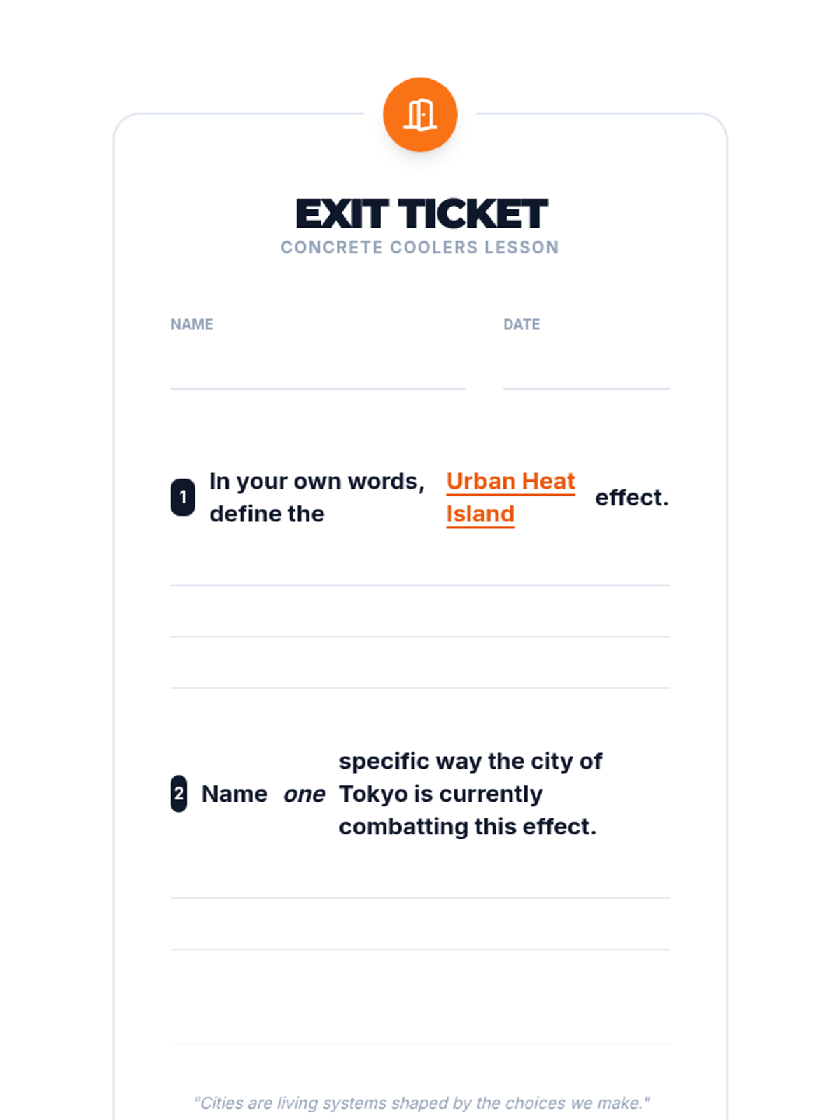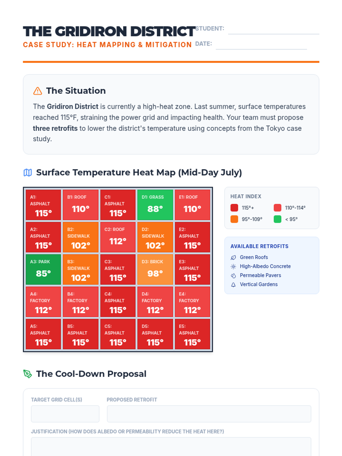 Students explore the Urban Heat Island effect by analyzing a fictional city's heat map and proposing sustainable architectural solutions inspired by Tokyo's urban planning.