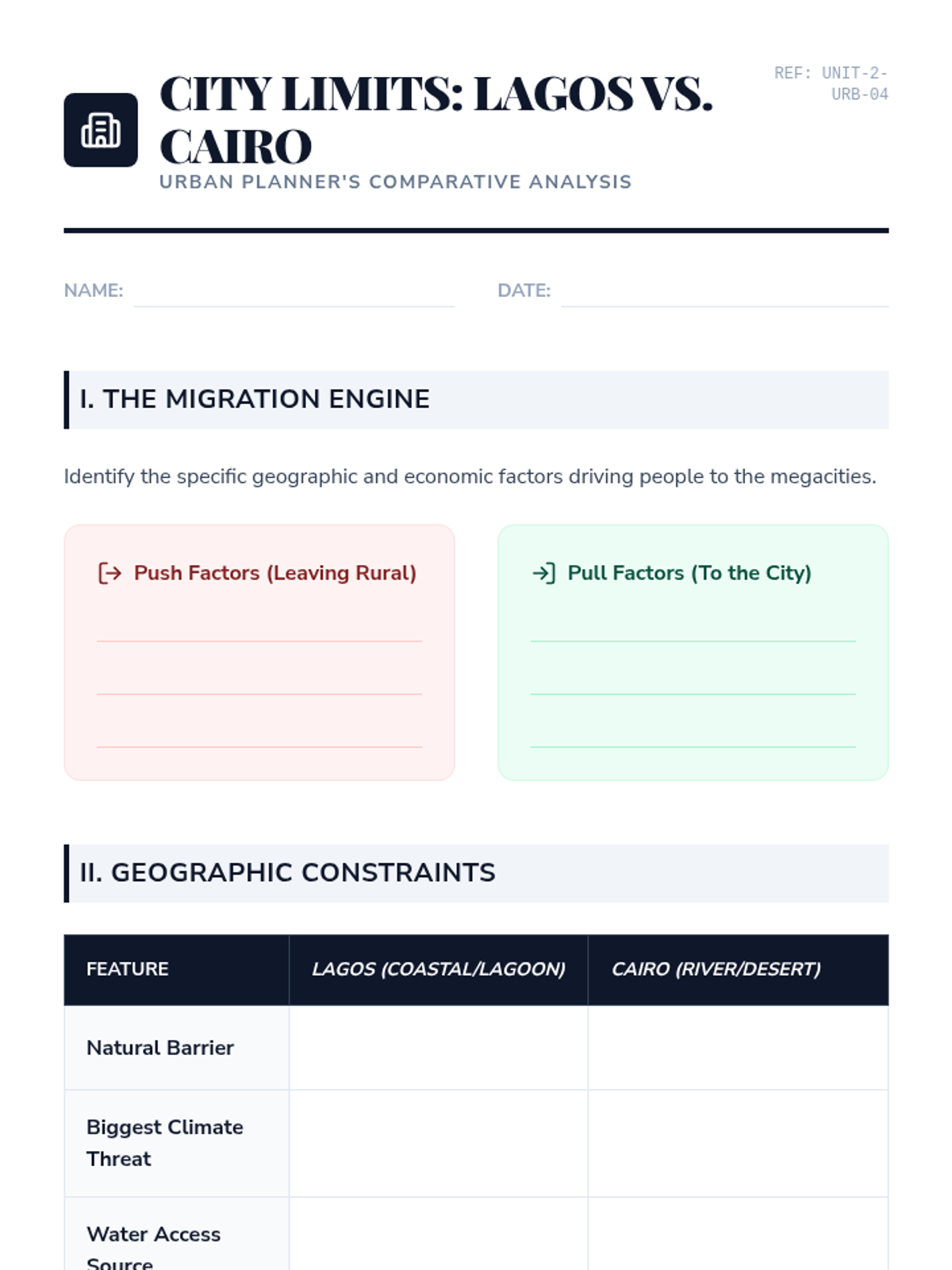 Students compare the rapid urbanization of Lagos and Cairo, analyzing how geography constrains or enables city growth and looking at infrastructure challenges in coastal vs. river-based megacities.