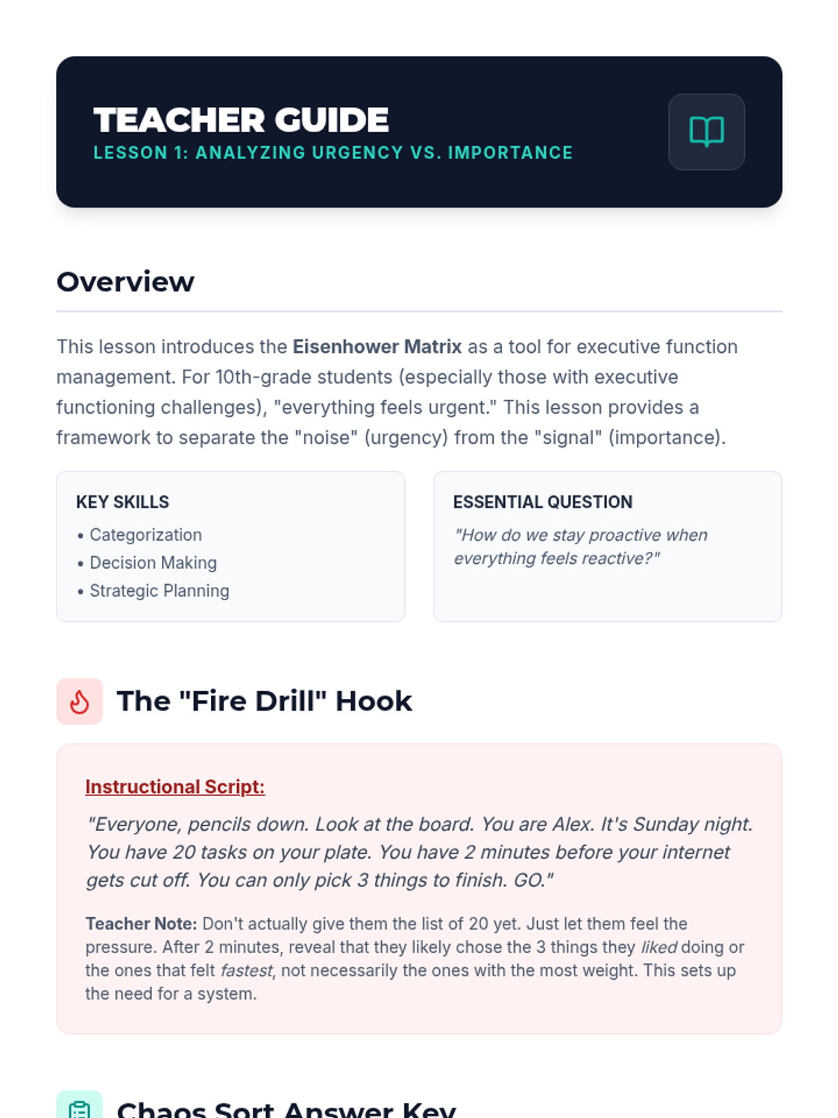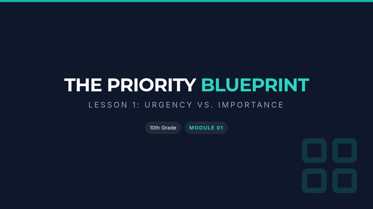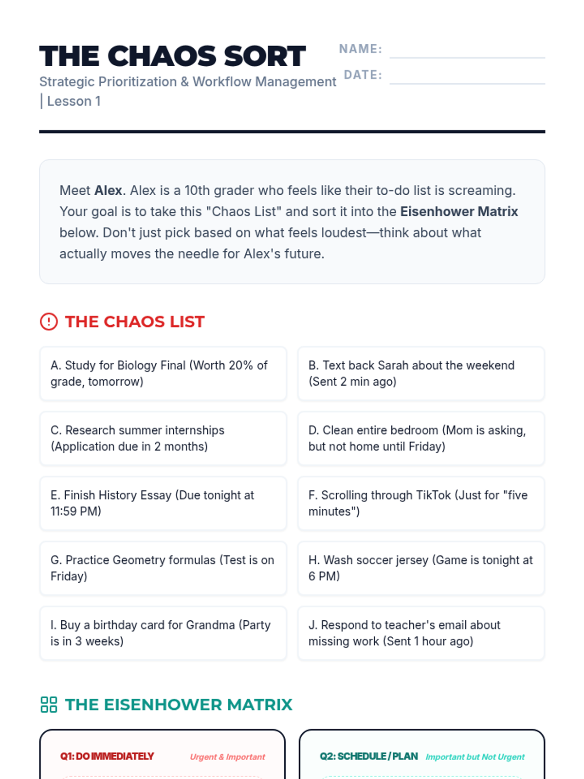 Students learn to distinguish between urgent and important tasks using the Eisenhower Matrix through a high-stakes 'fire drill' simulation and case study analysis.