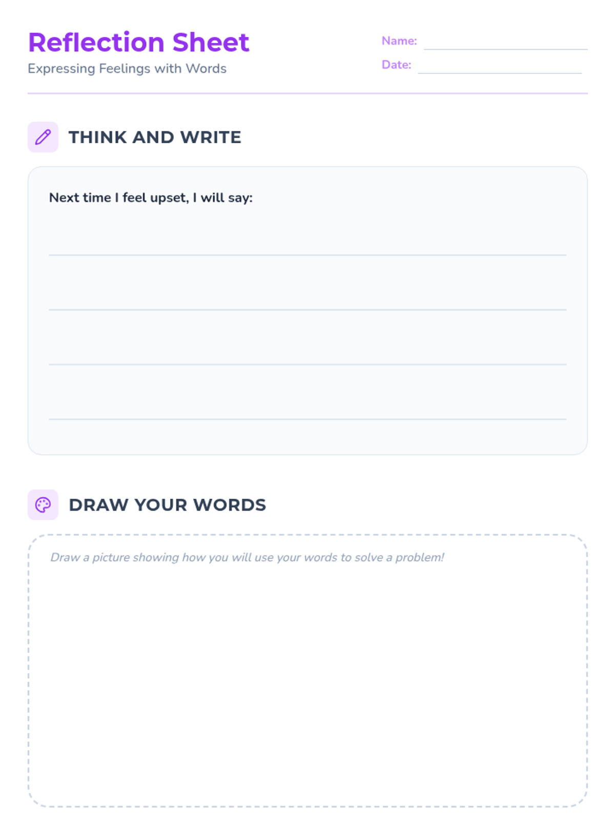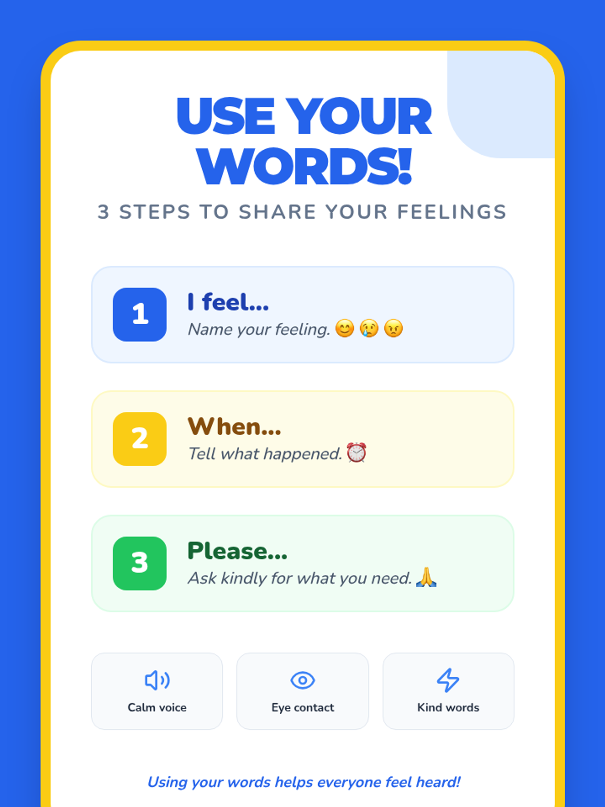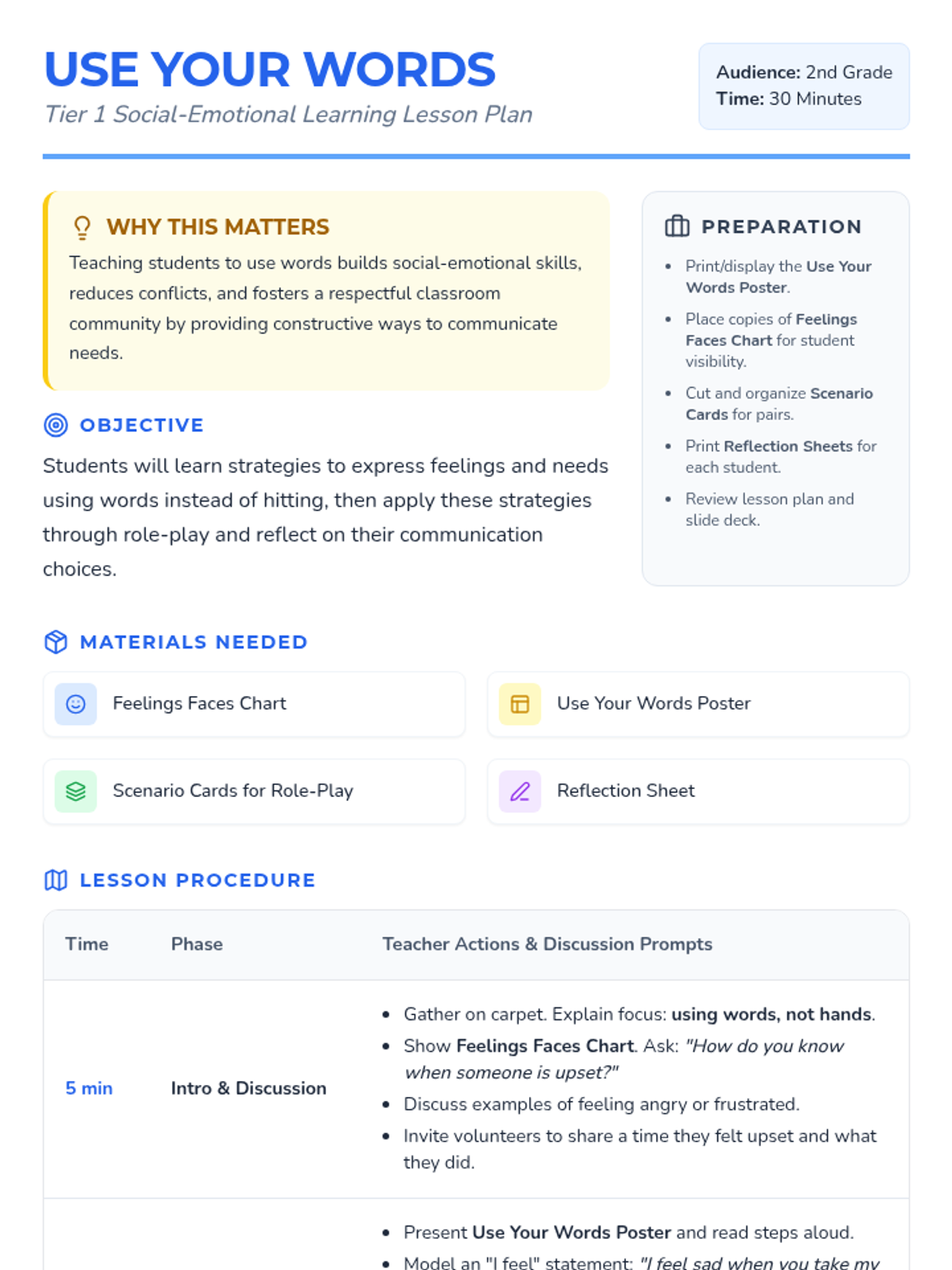 A 30-minute Tier 1 SEL lesson for 2nd graders focusing on expressing feelings and needs through verbal communication rather than physical actions. Students practice 'I feel...' statements and engage in role-play scenarios.