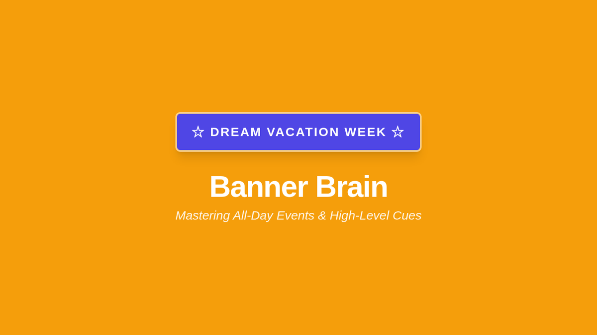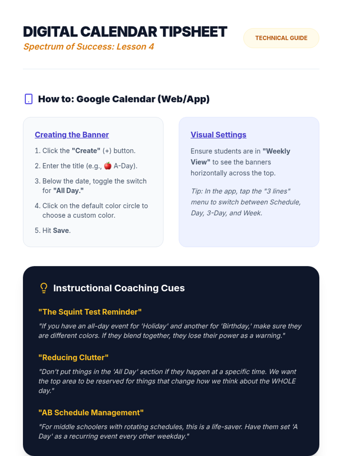 This lesson introduces 'All-Day' events as visual banners for irregular schedules (like A/B days) or special holidays. Students learn to use these features as high-level visual cues that sit at the top of their calendar view.