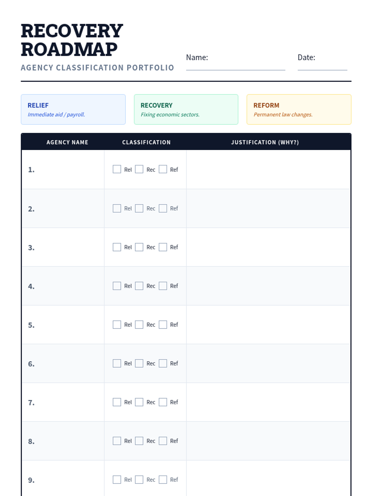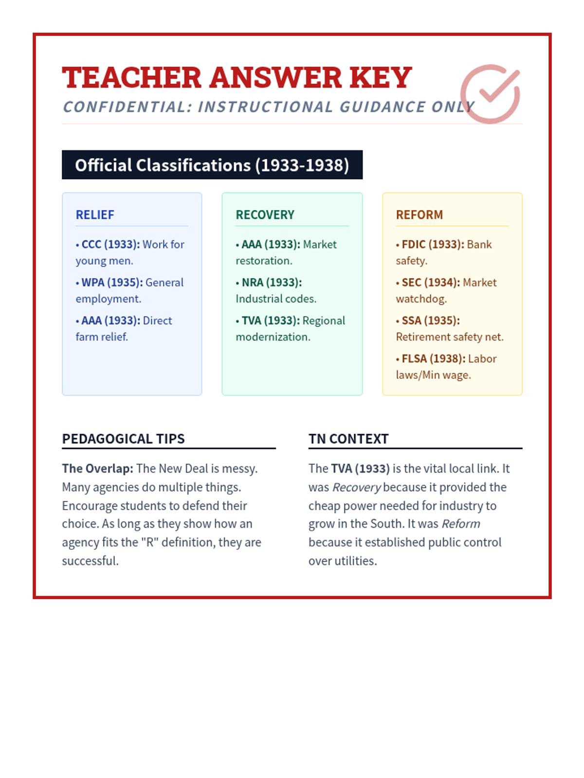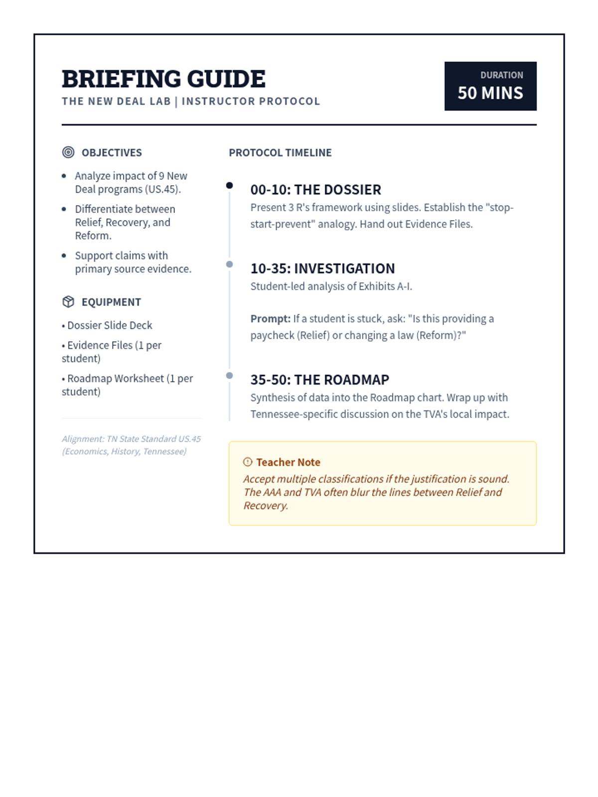 A 50-minute deep dive into FDR's New Deal programs through primary source analysis, categorizing the 'alphabet soup' of agencies into Relief, Recovery, and Reform. Students will examine original posters, photographs, and legislation snippets to understand the massive scale of government intervention during the Great Depression.