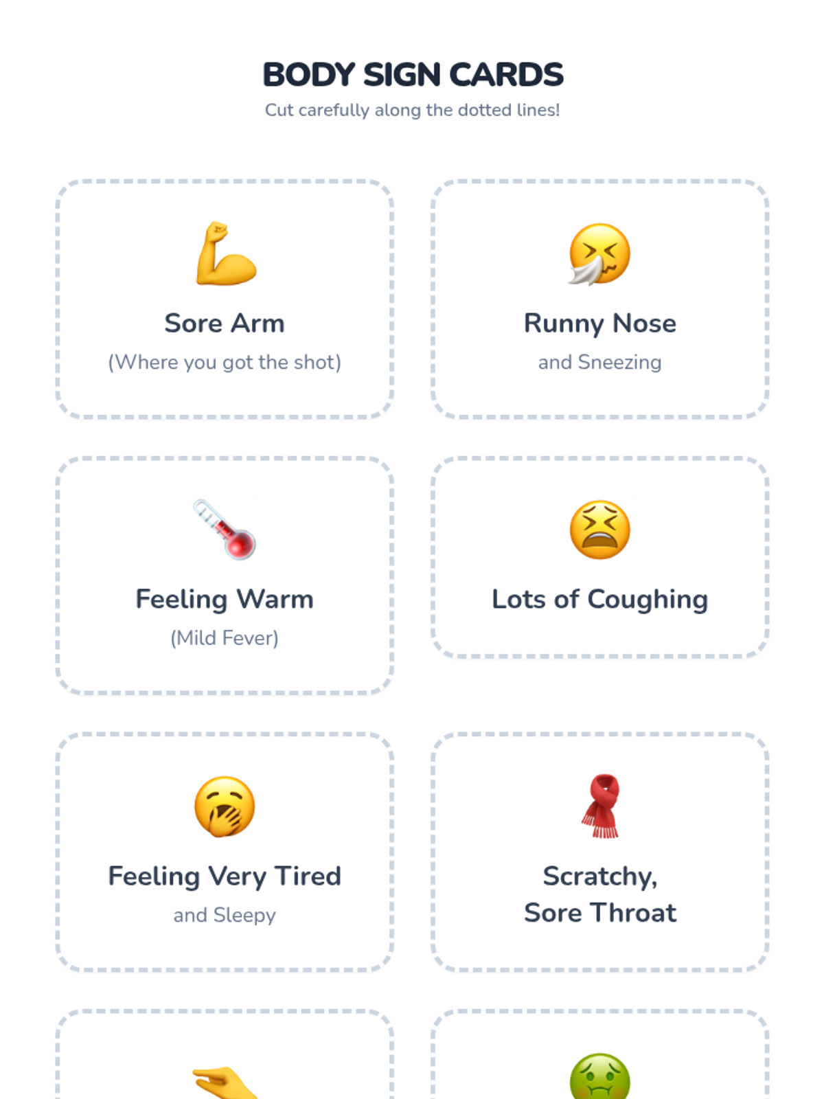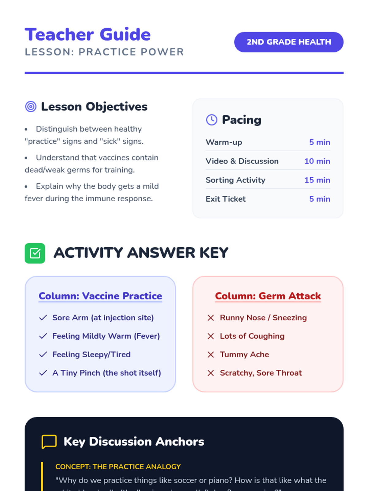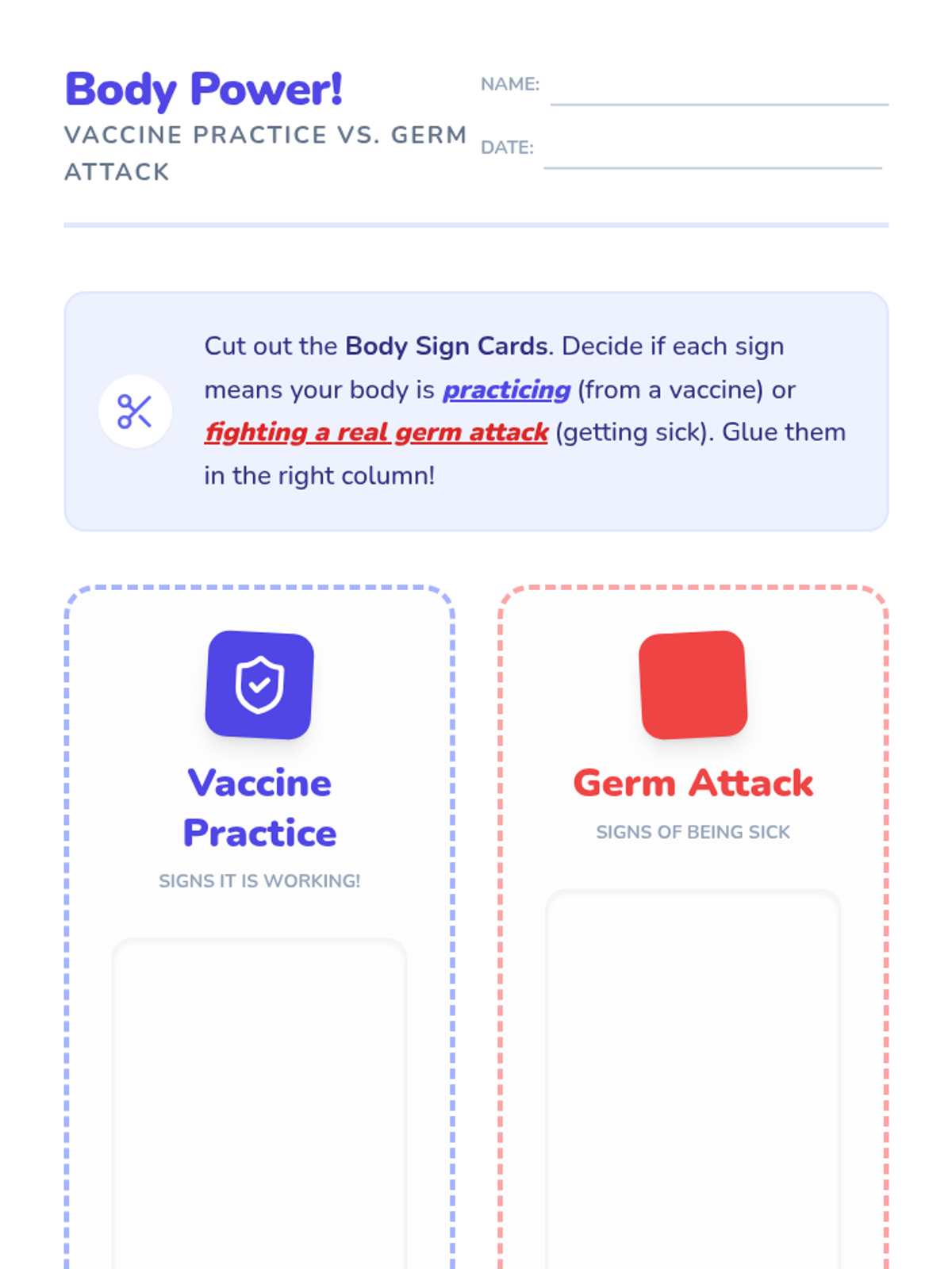 Students will learn how vaccines act as 'practice' for the immune system, distinguishing between normal post-vaccination side effects and signs of actual illness.