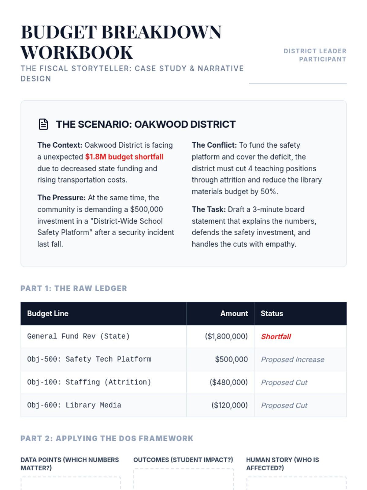 A professional development workshop for district leaders to master the art of fiscal storytelling, transforming complex budget data into transparent, trust-building narratives that link financial requests to student outcomes.