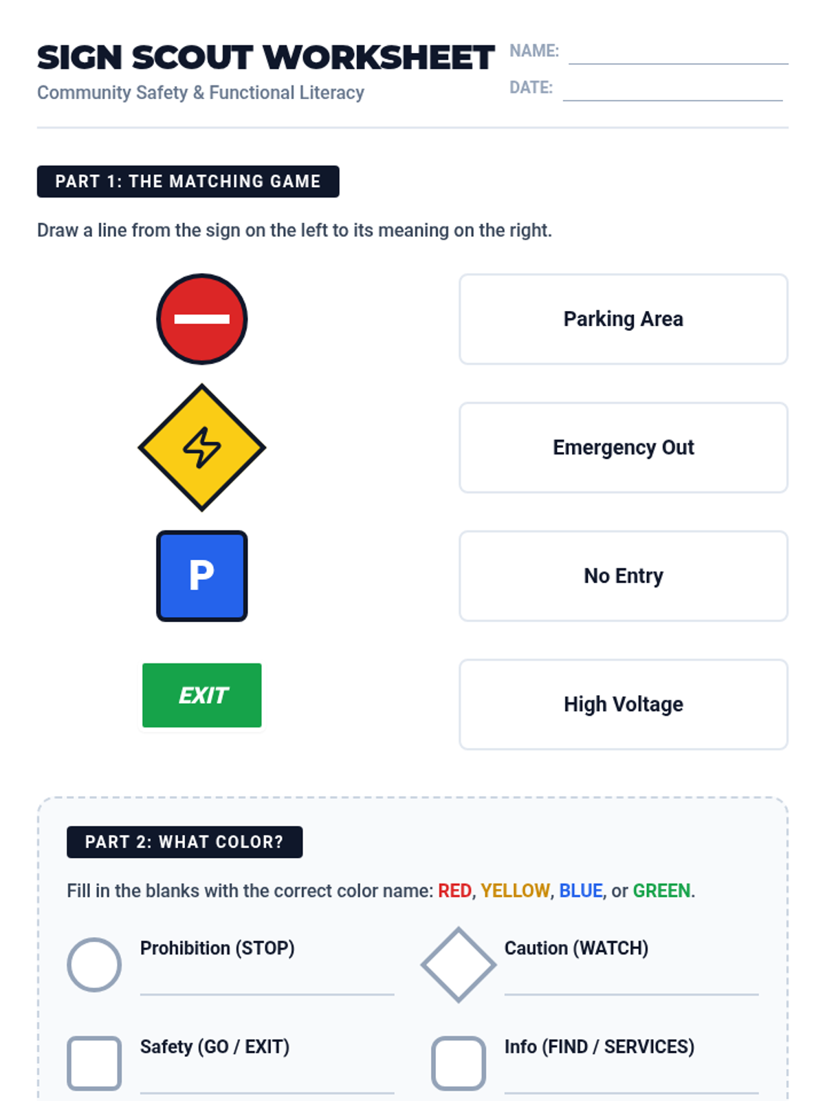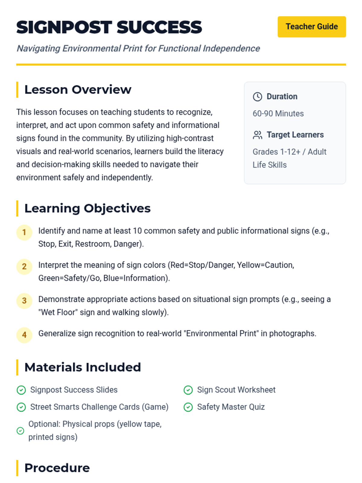 A comprehensive lesson focused on identifying and interpreting common community signs and symbols to promote functional independence and safety. Students will explore high-contrast visuals and apply their knowledge to real-world situational scenarios.
