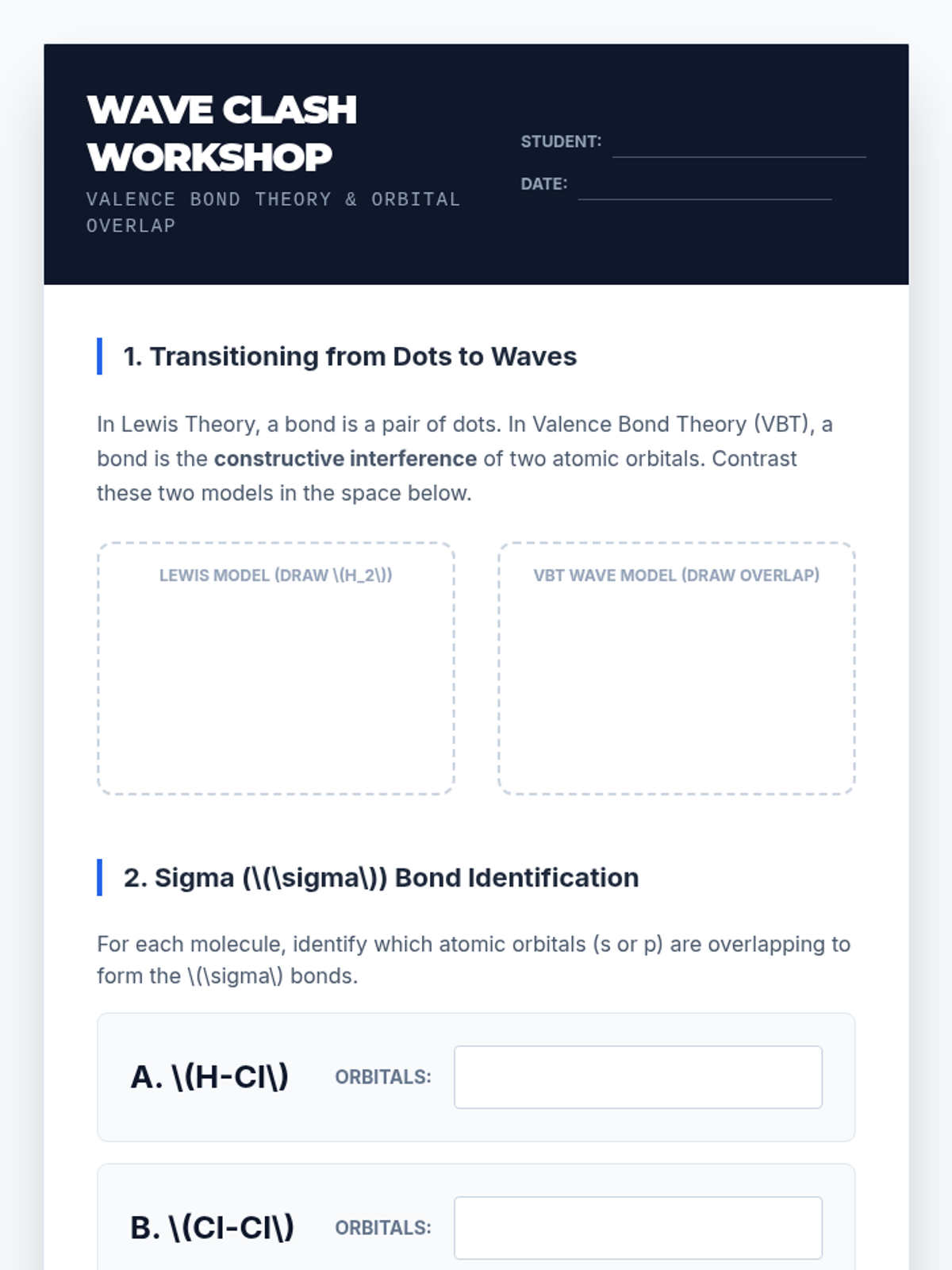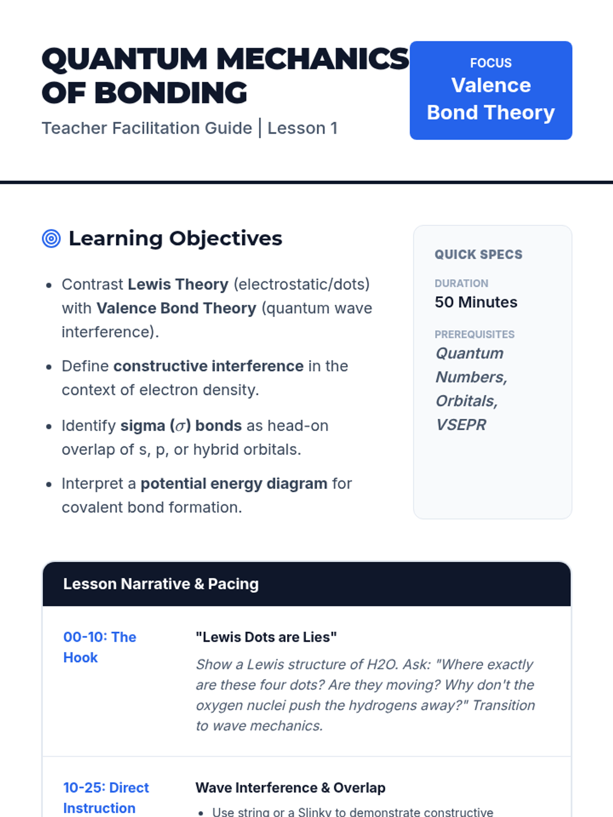 Introduction to Valence Bond Theory (VBT) as a quantum mechanical model where bonding occurs via the constructive interference of atomic wave functions. Topics include head-on orbital overlap and the formation of sigma bonds.