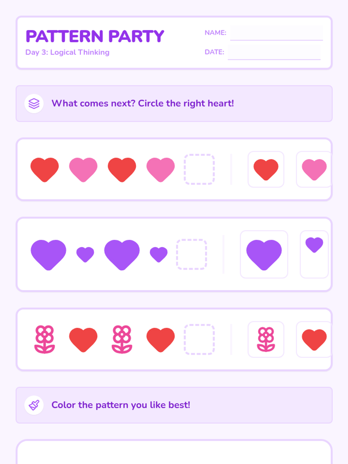 Focuses on logical reasoning and visual discrimination through heart-themed pattern completion.