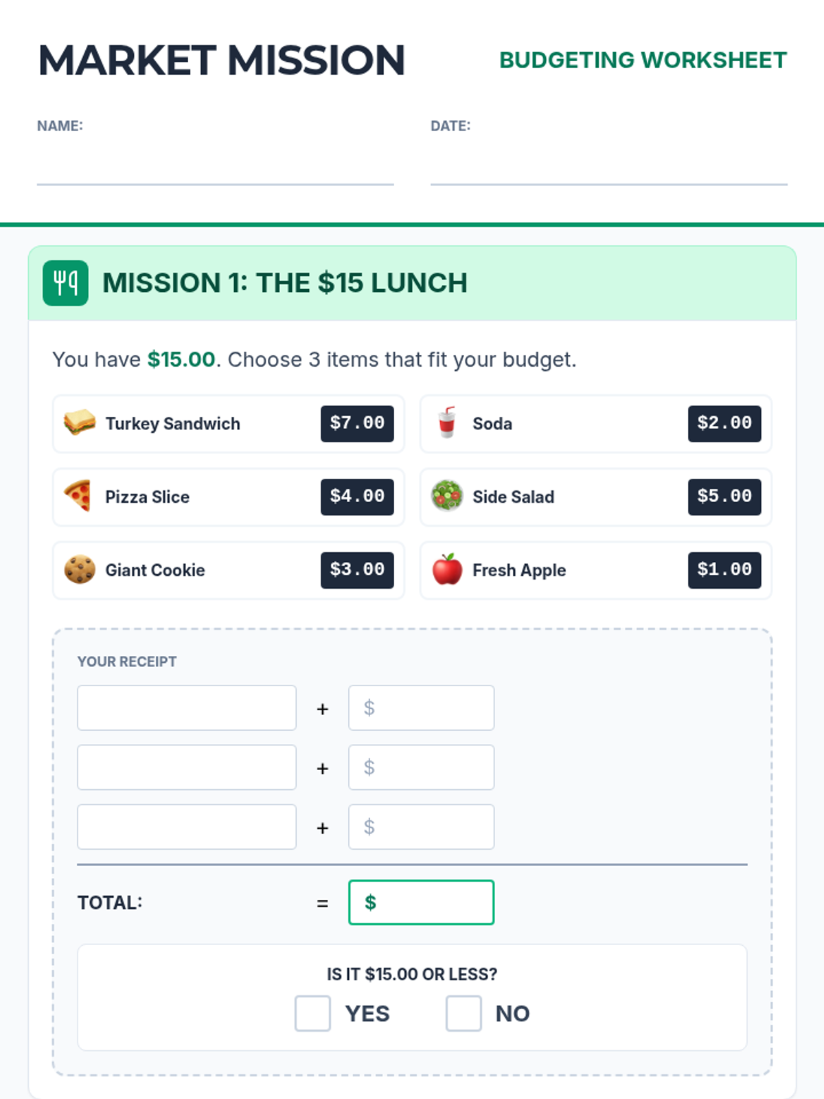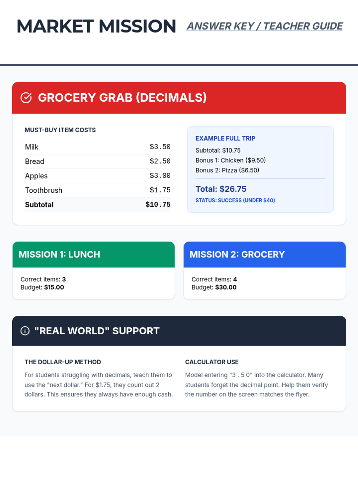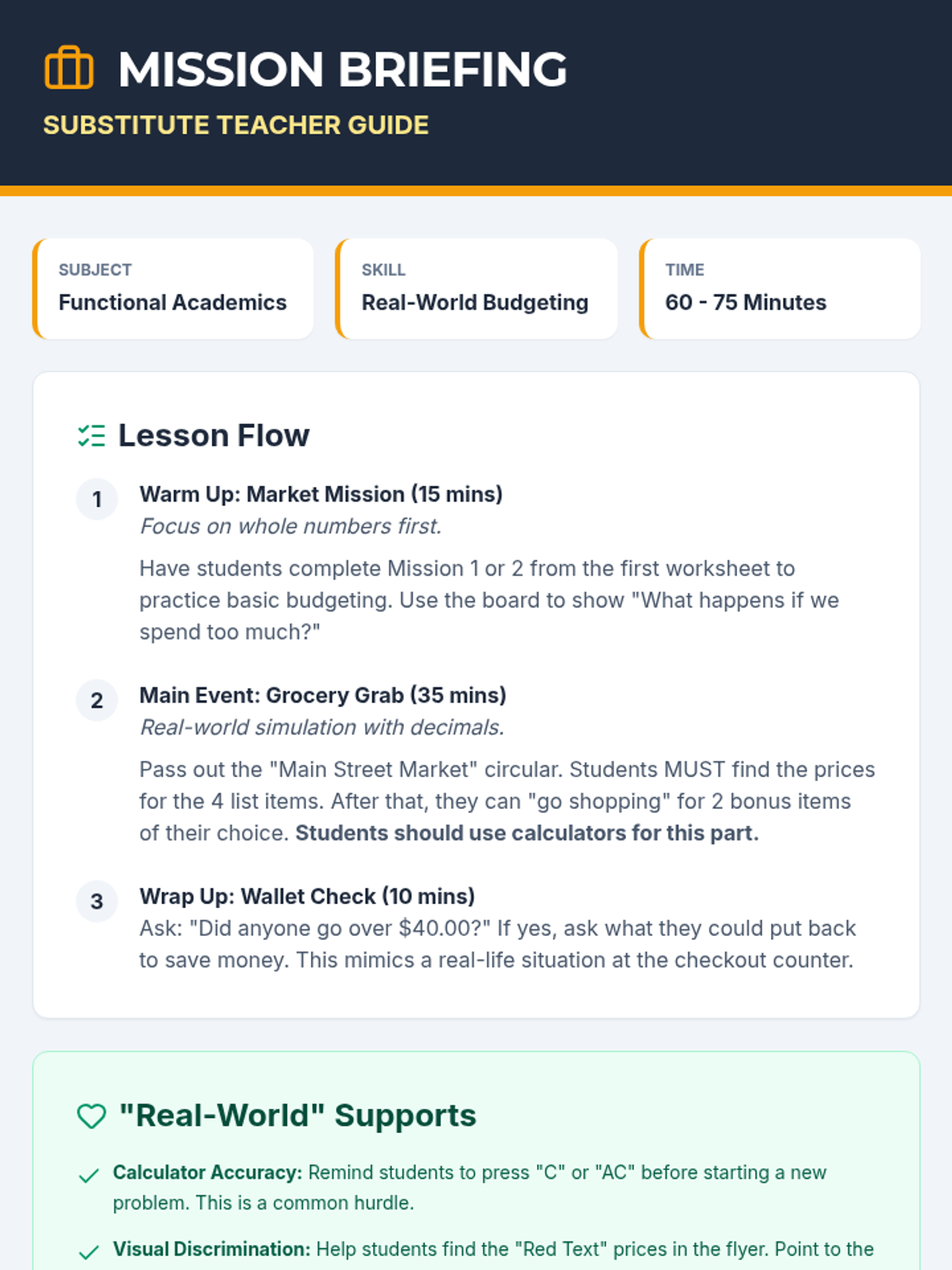 A functional budgeting lesson designed for young adults with intellectual disabilities and autism, focusing on making choices within a fixed budget. Includes a visual shopping worksheet, an answer key, and a guide for substitute teachers.