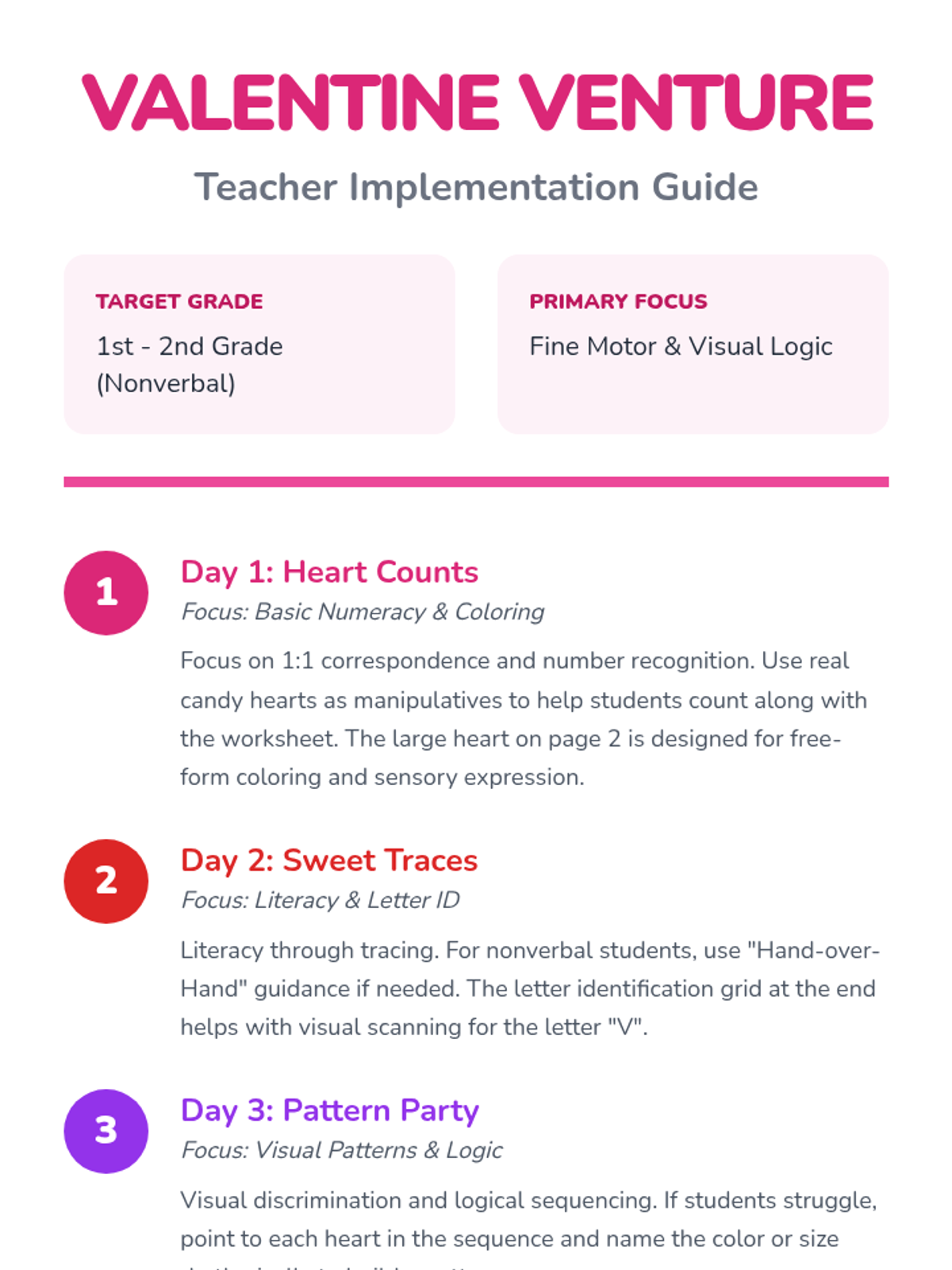 Teacher implementation guide and sequence overview for the Valentine Venture activities.