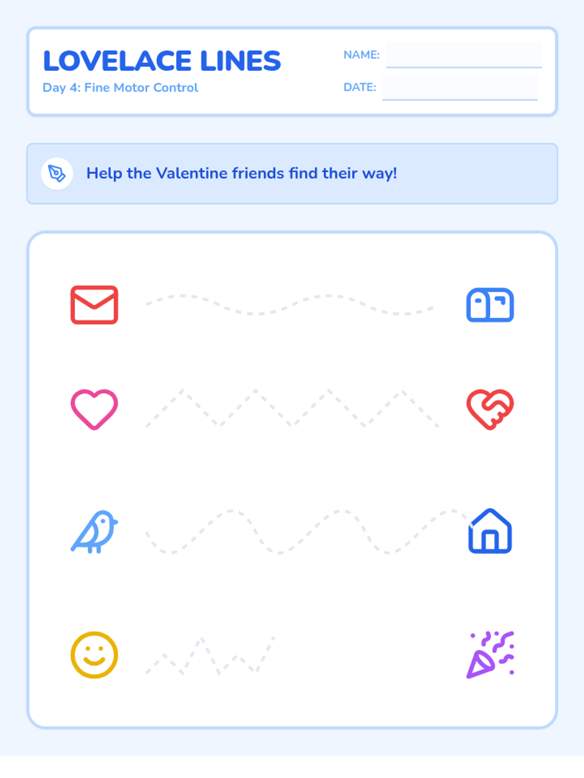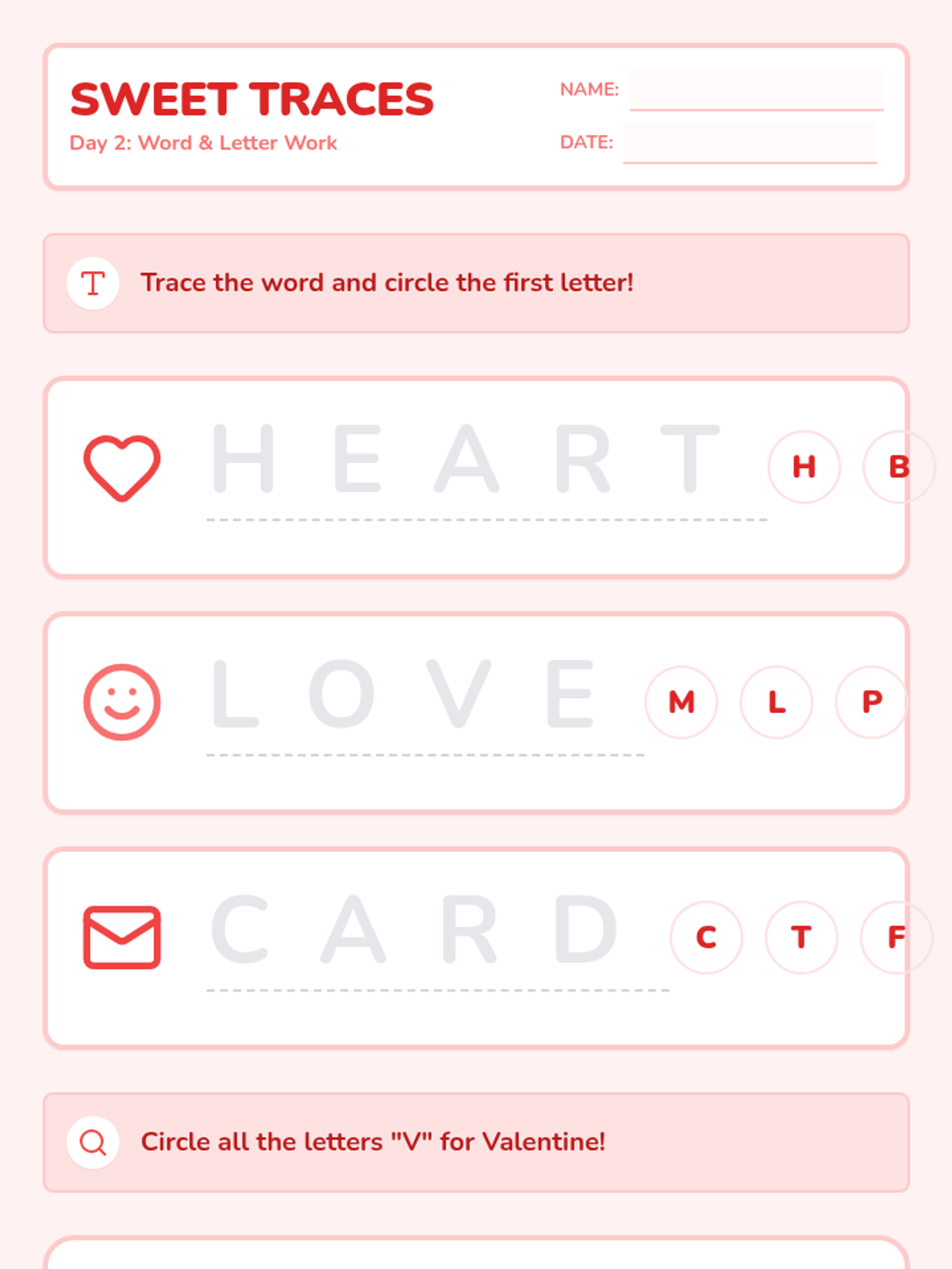 Focuses on fine motor literacy skills through tracing Valentine-themed words and identifying letters.