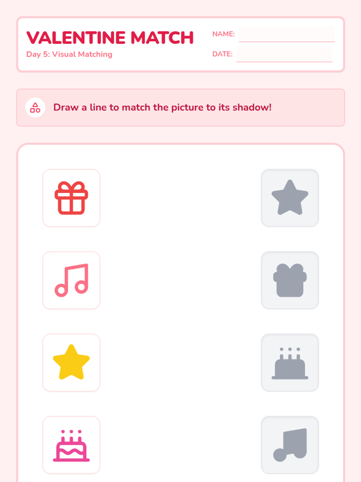 Focuses on visual matching skills and object recognition with a Valentine's shadow match activity.