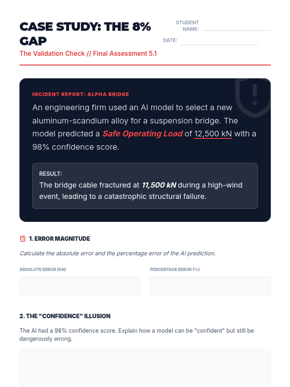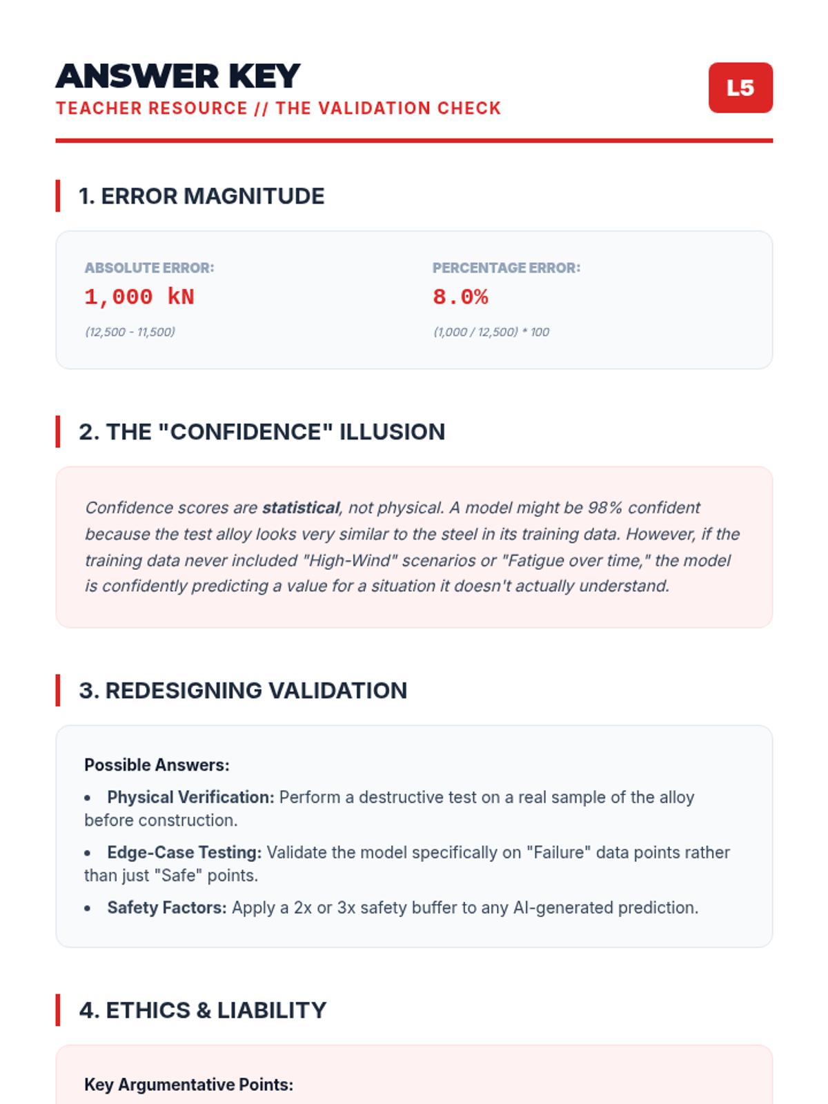 Students test their model's predictions against real-world data to measure error rates and discuss the ethics of AI in safety-critical engineering.