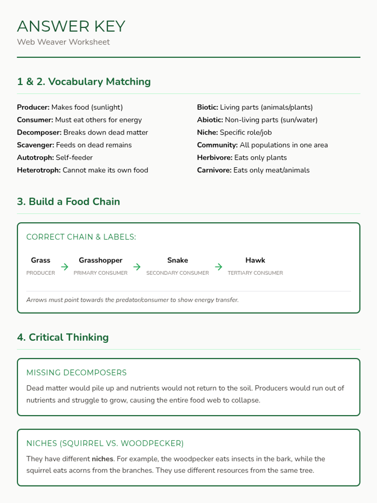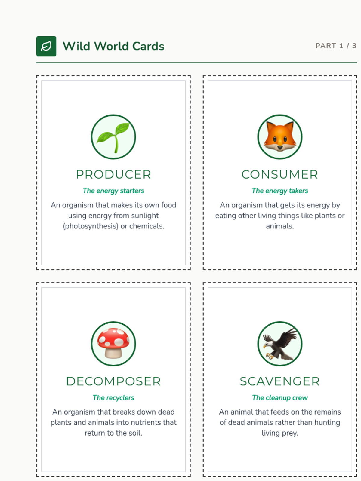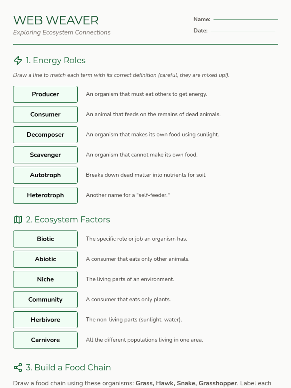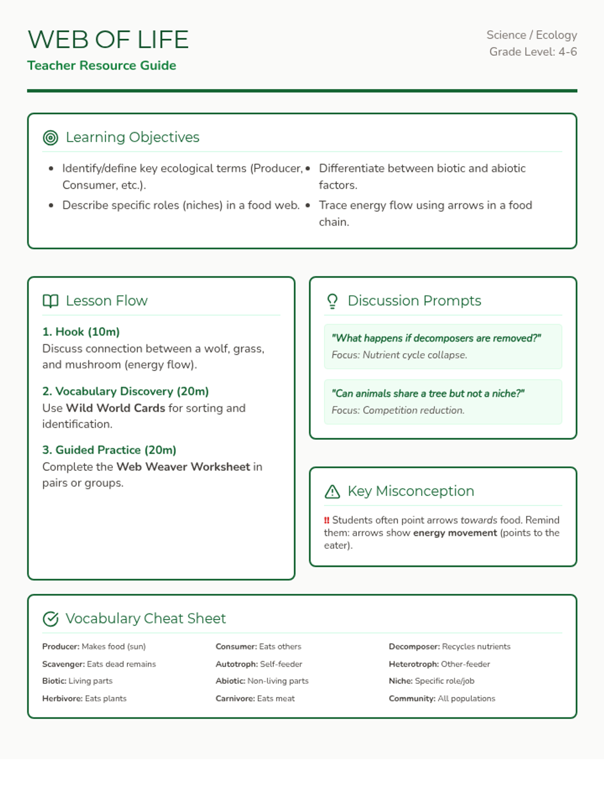 A lesson exploring how energy flows through an ecosystem using food webs. Students learn key vocabulary and identify roles of different organisms within their environment.