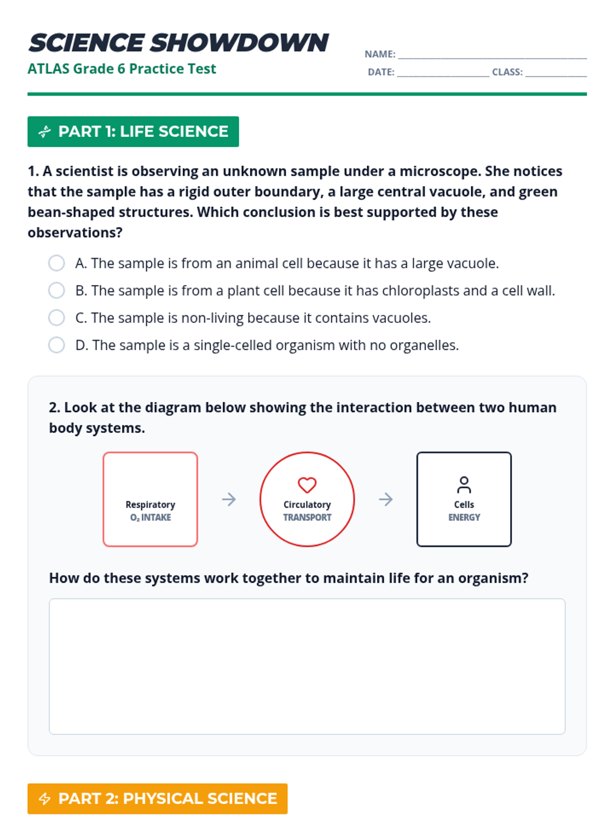 A comprehensive Grade 6 Science review lesson covering cells, body systems, energy, Earth's history, and weather patterns, specifically designed for Arkansas ATLAS test preparation.