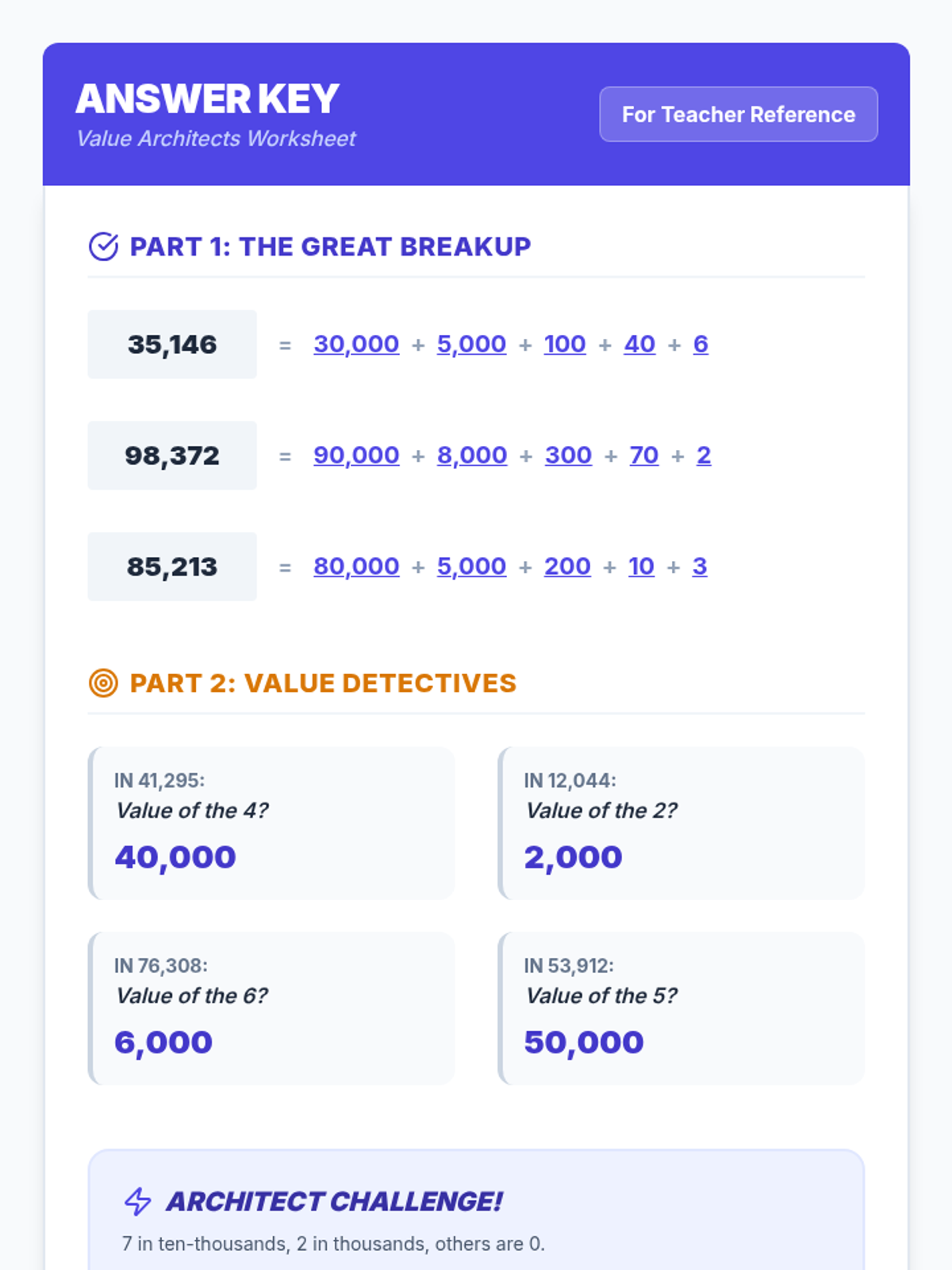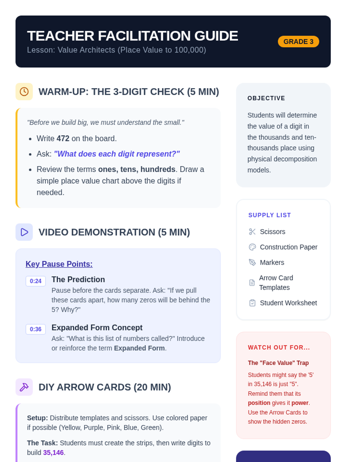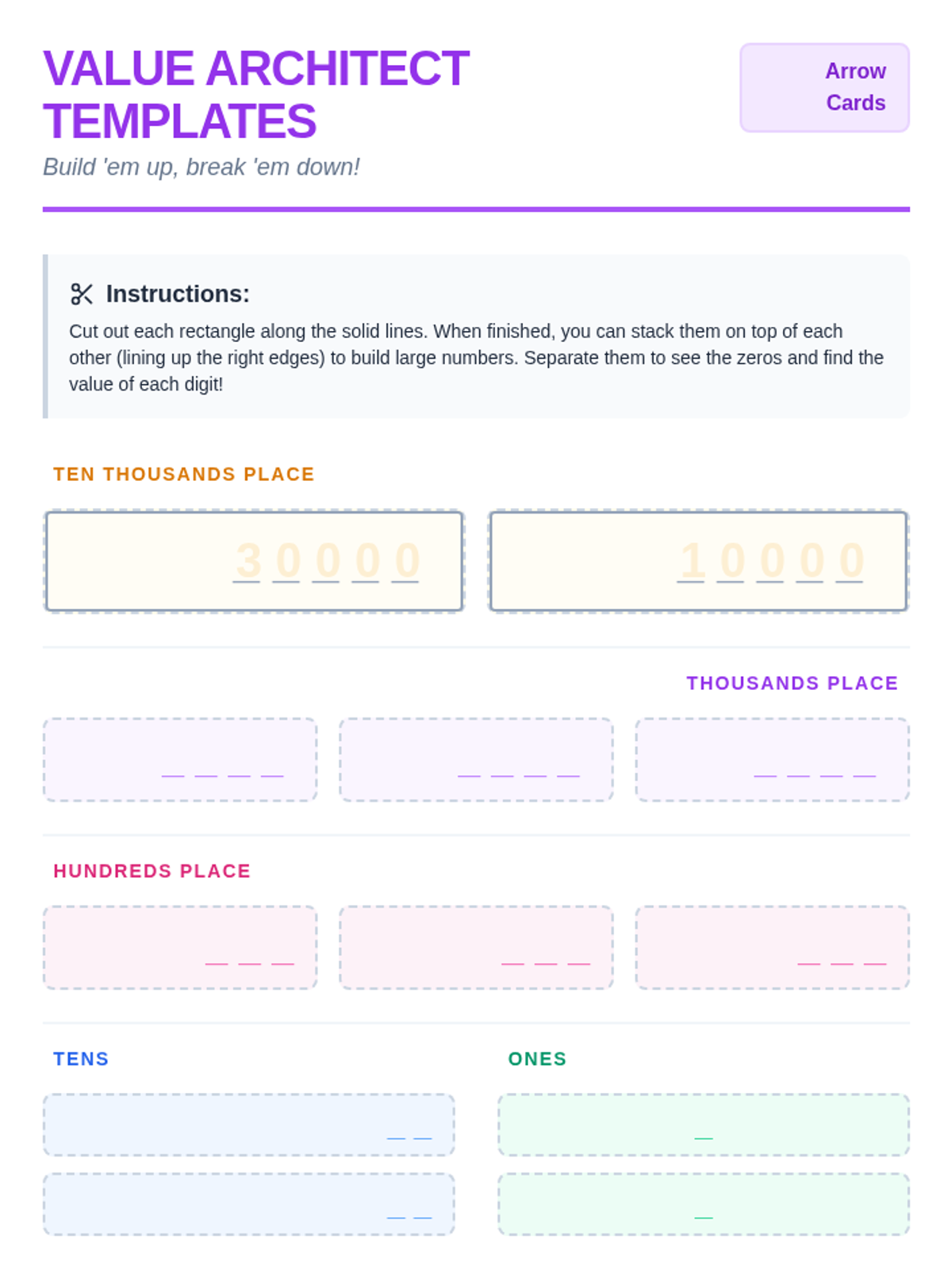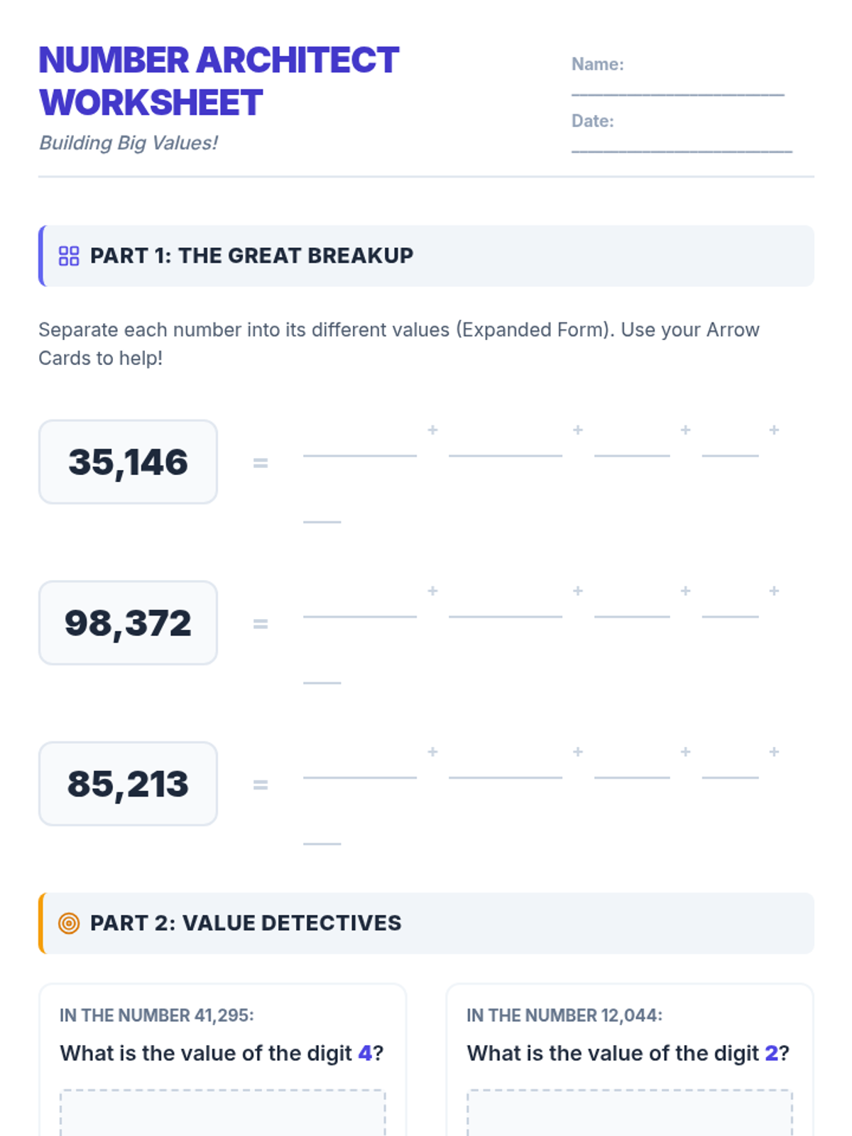 Students explore place value up to the ten-thousands place by watching a demonstration of decomposing numbers and building their own set of interactive 'Arrow Cards' to visualize the value of each digit.
