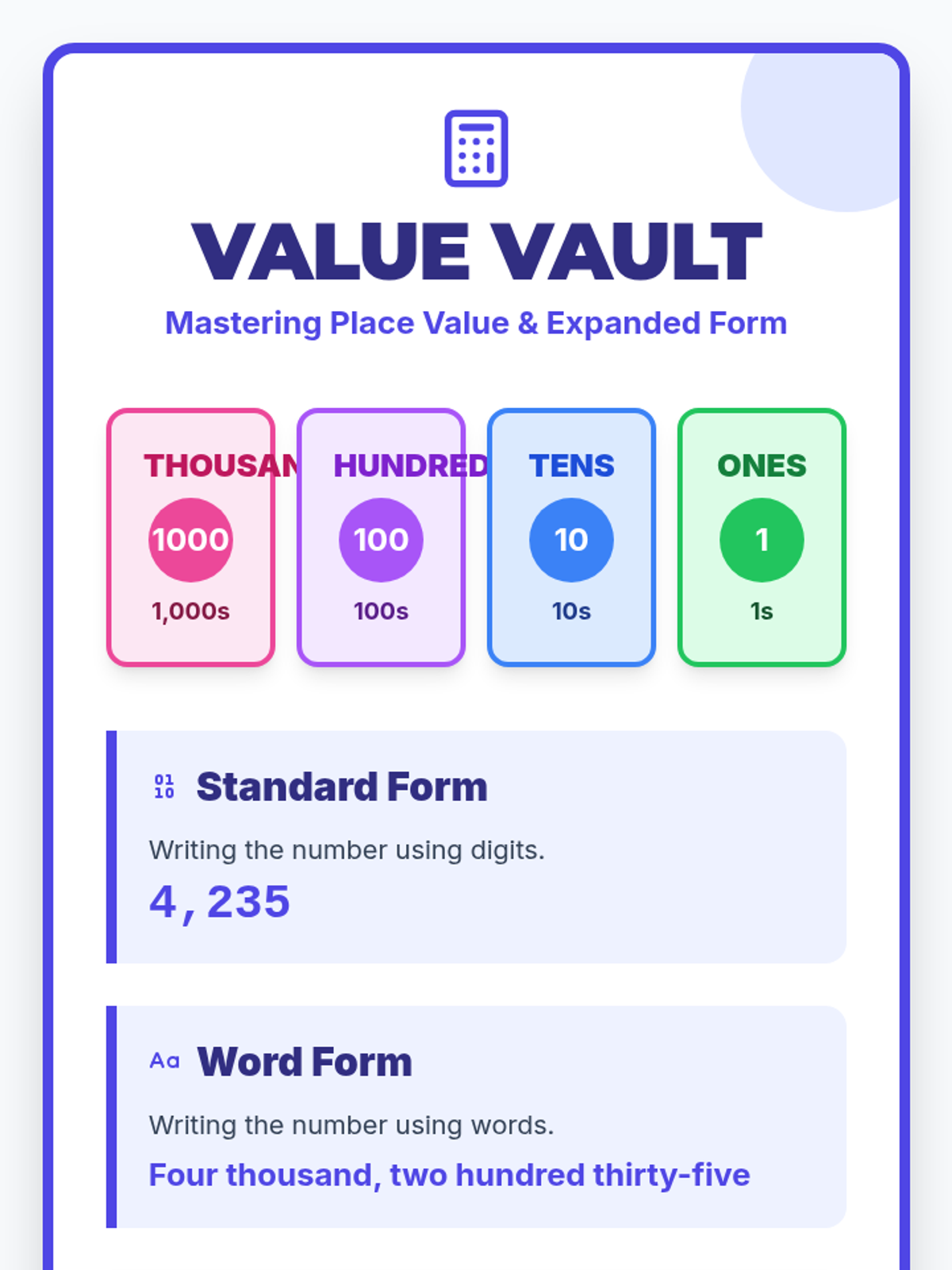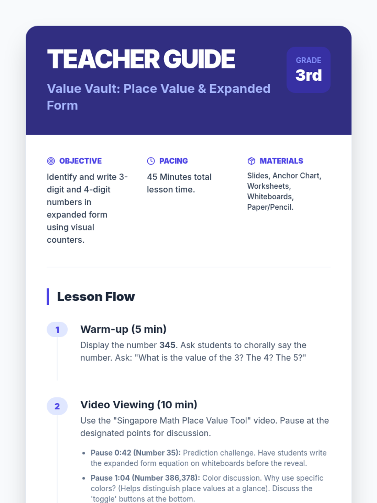 A comprehensive lesson for 3rd graders on identifying and writing 3-digit and 4-digit numbers in expanded form, featuring an interactive digital tool video.
