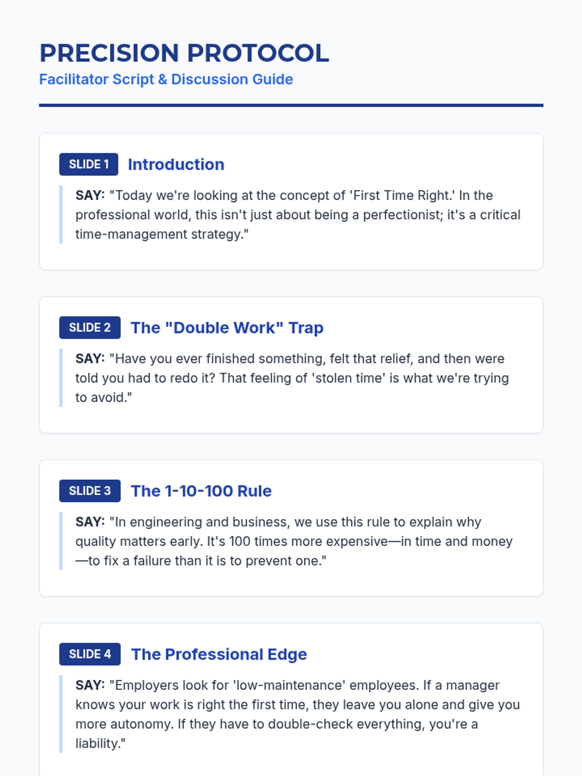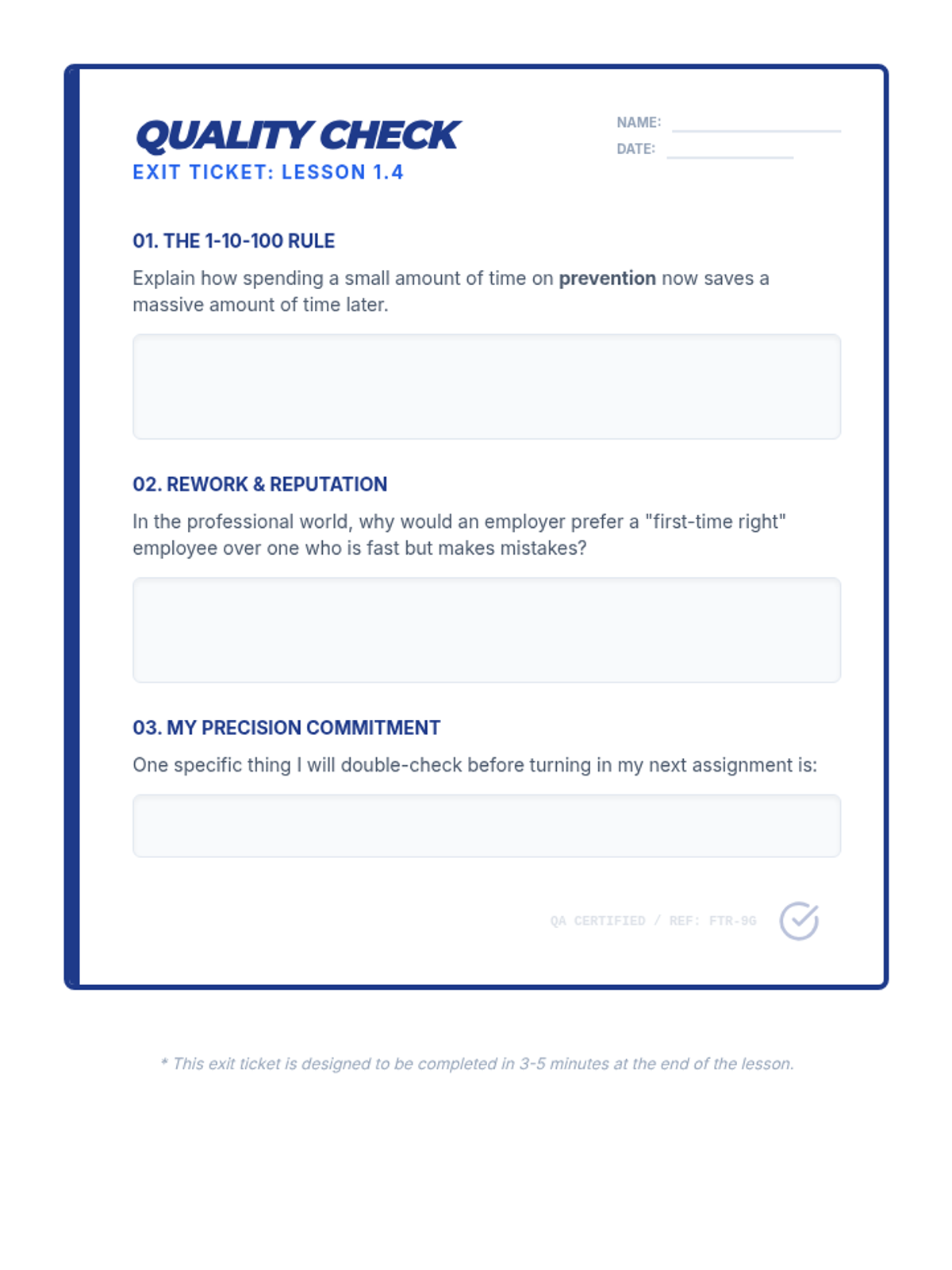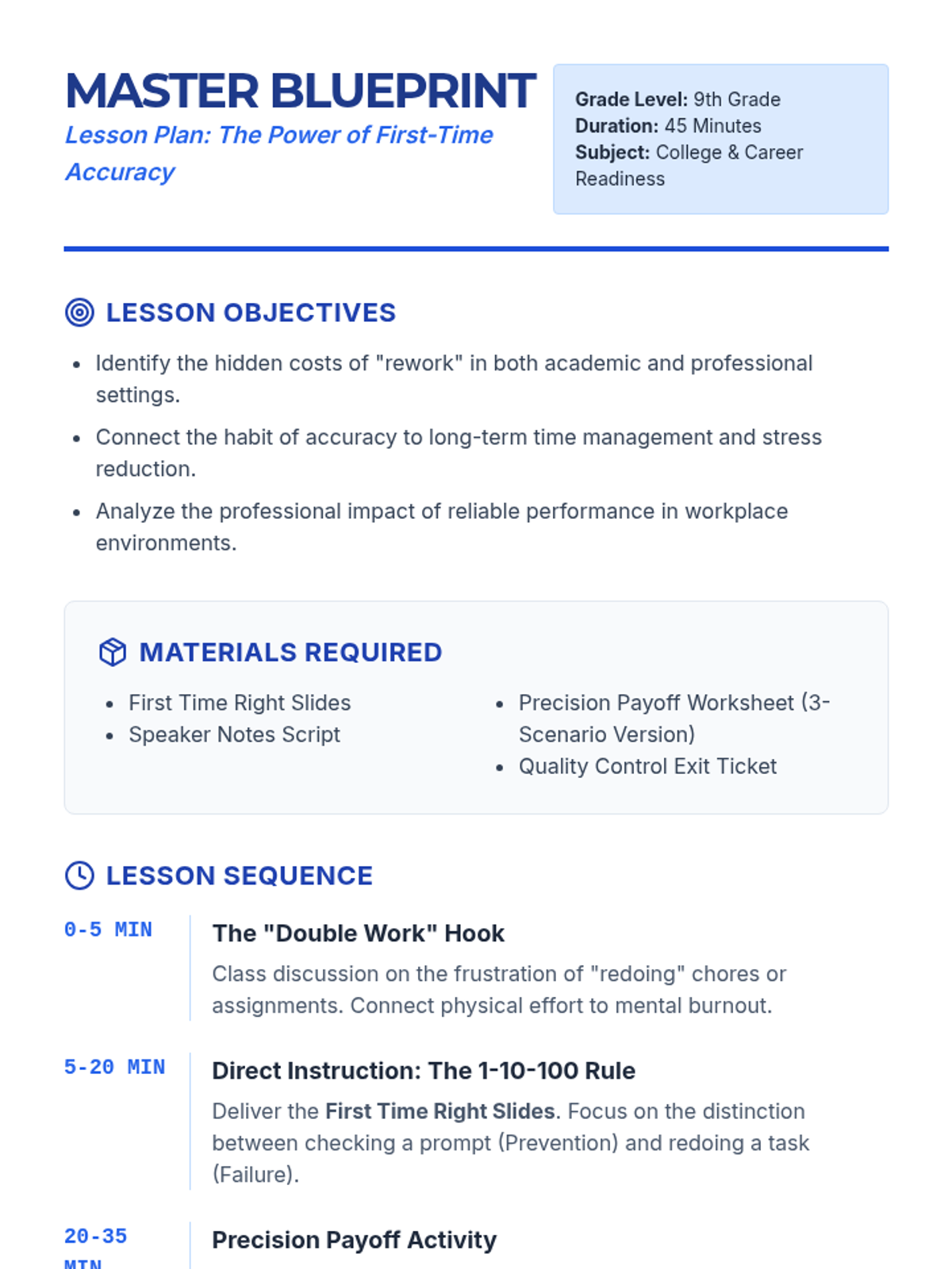 A 45-minute lesson for 9th graders on the academic and professional benefits of high-quality first attempts, focusing on time management and professional habits.