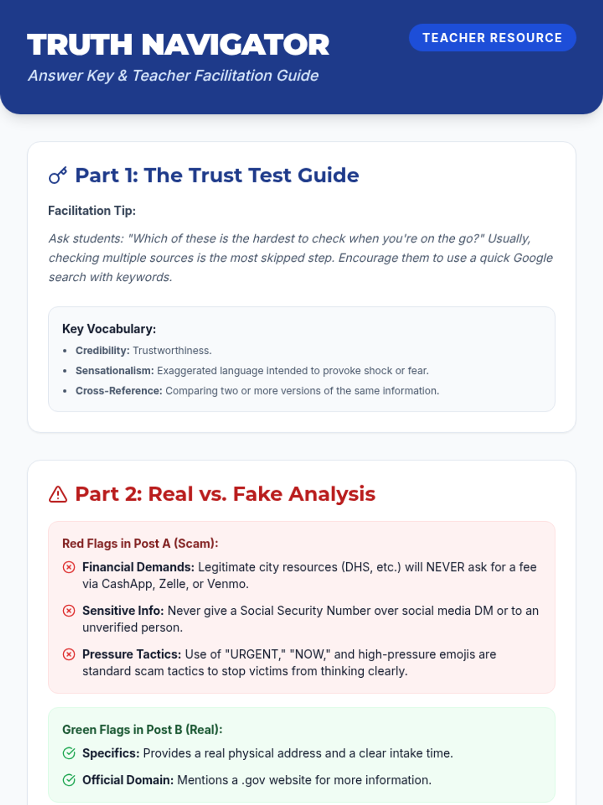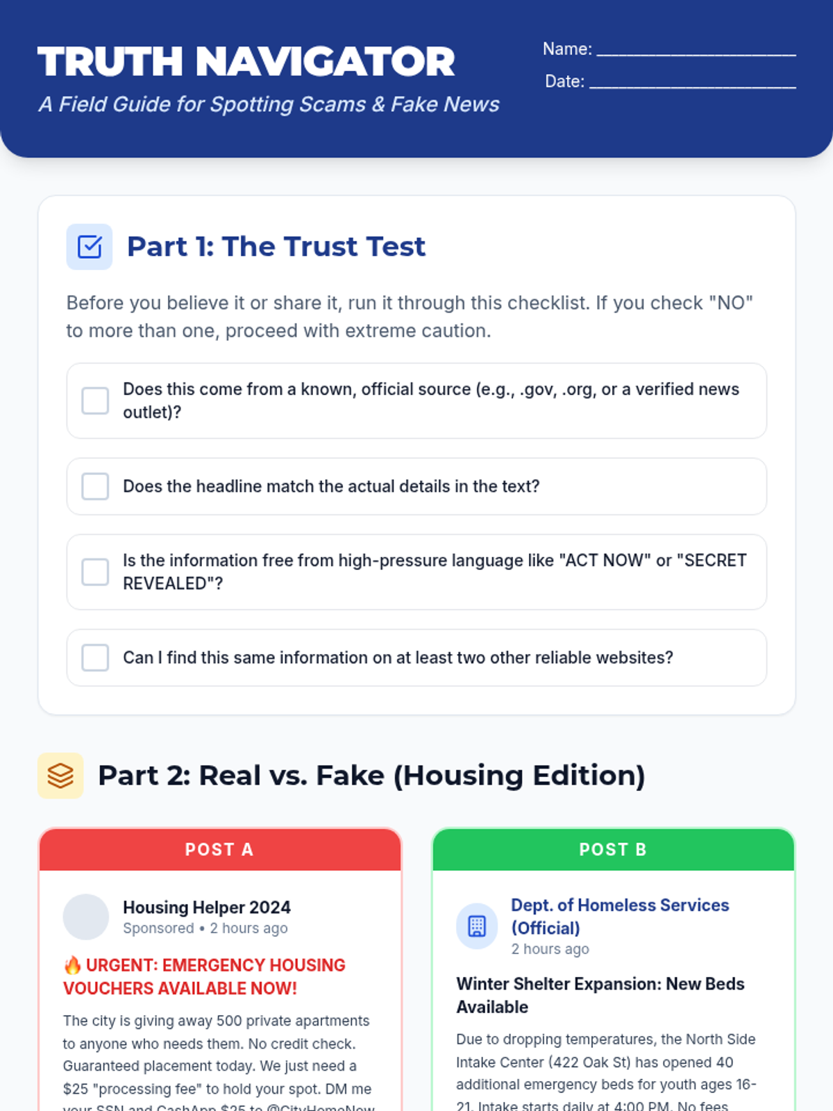 A practical guide for high school students to evaluate the credibility of political news and community resource leads, specifically housing and shelter availability.