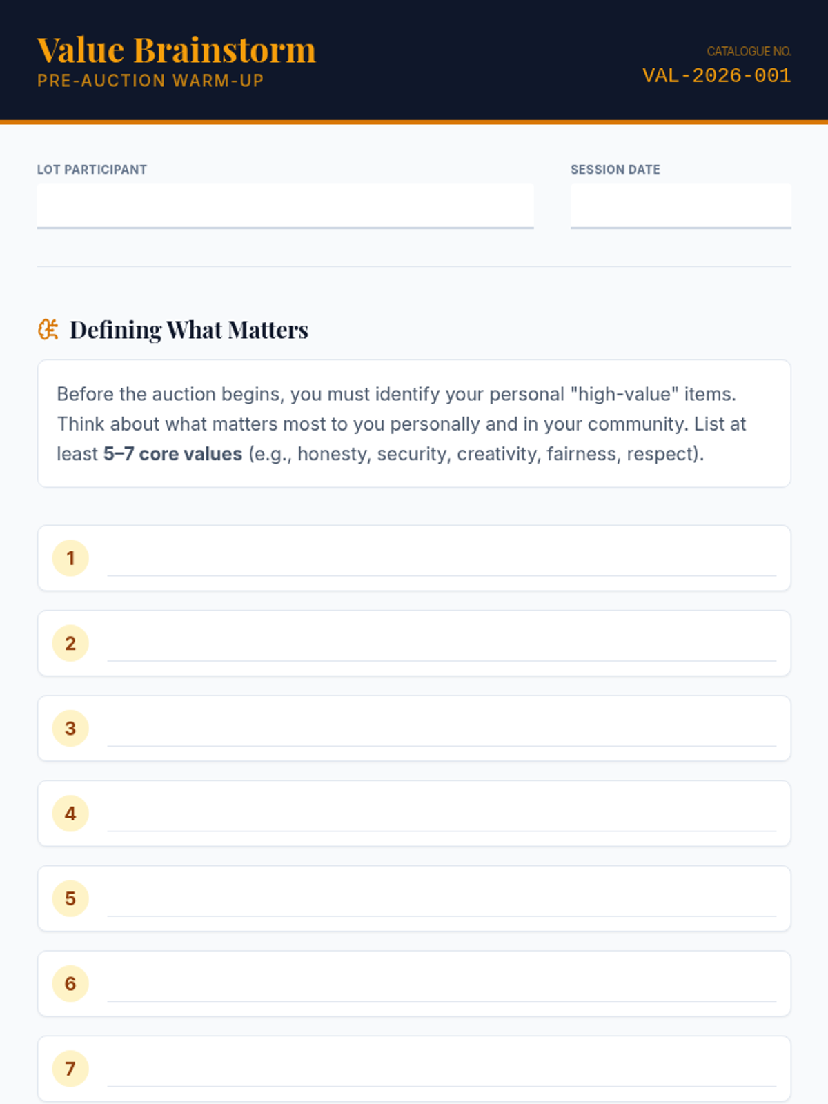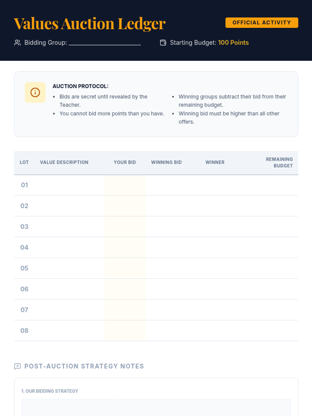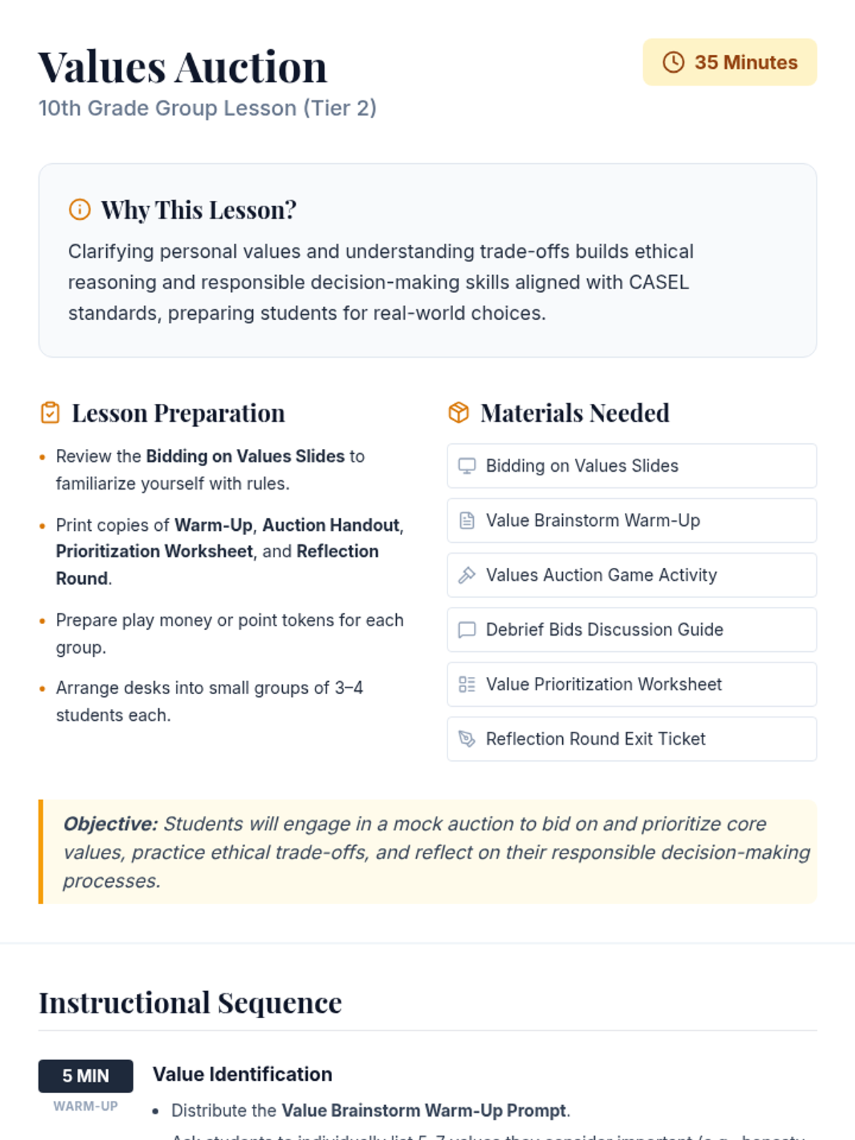 In this Tier 2 group lesson for 10th graders, students engage in a mock auction to bid on and prioritize core values, exploring trade-offs and ethical decision-making. This 35-minute session builds responsible decision-making skills aligned with CASEL.