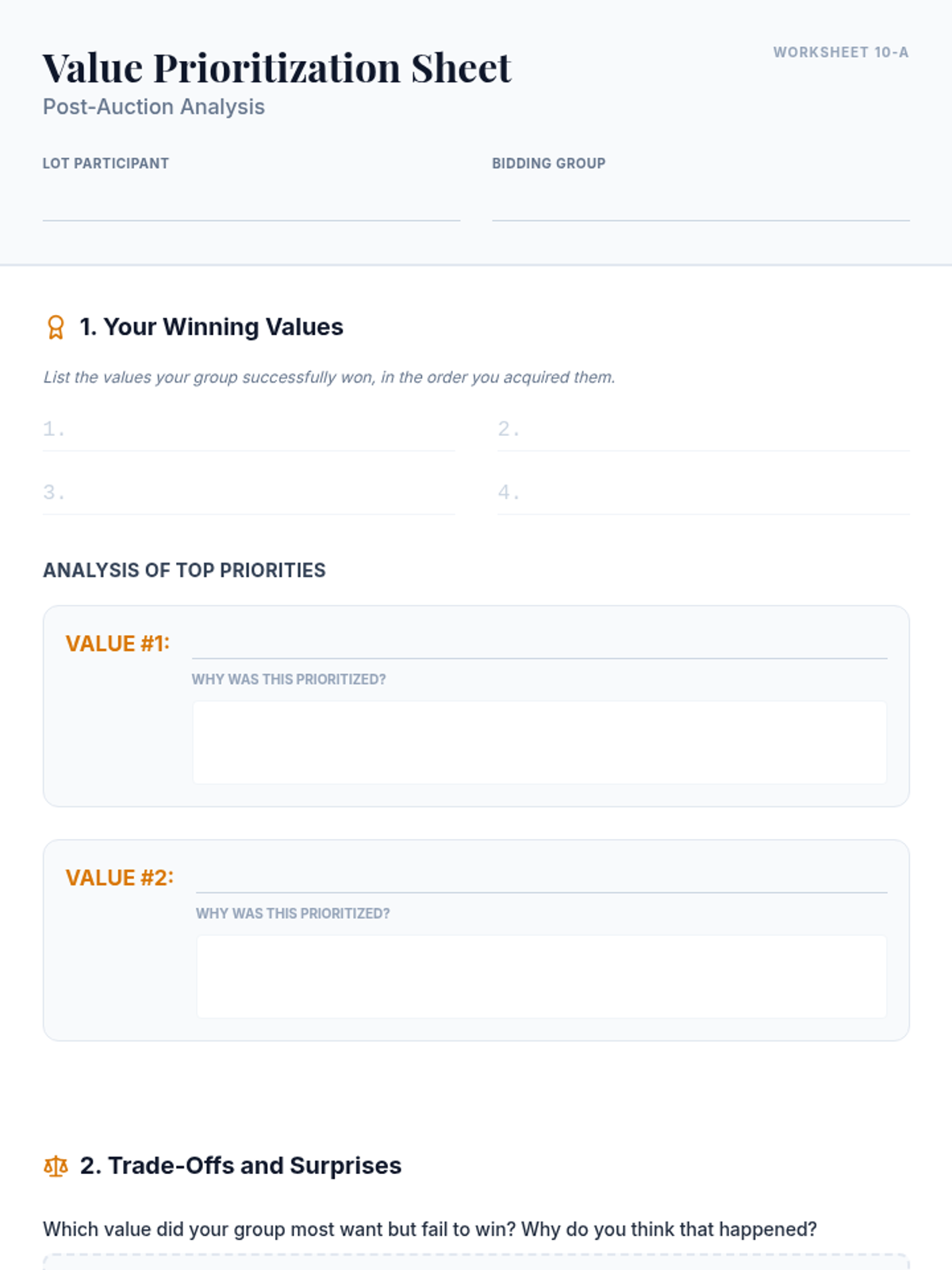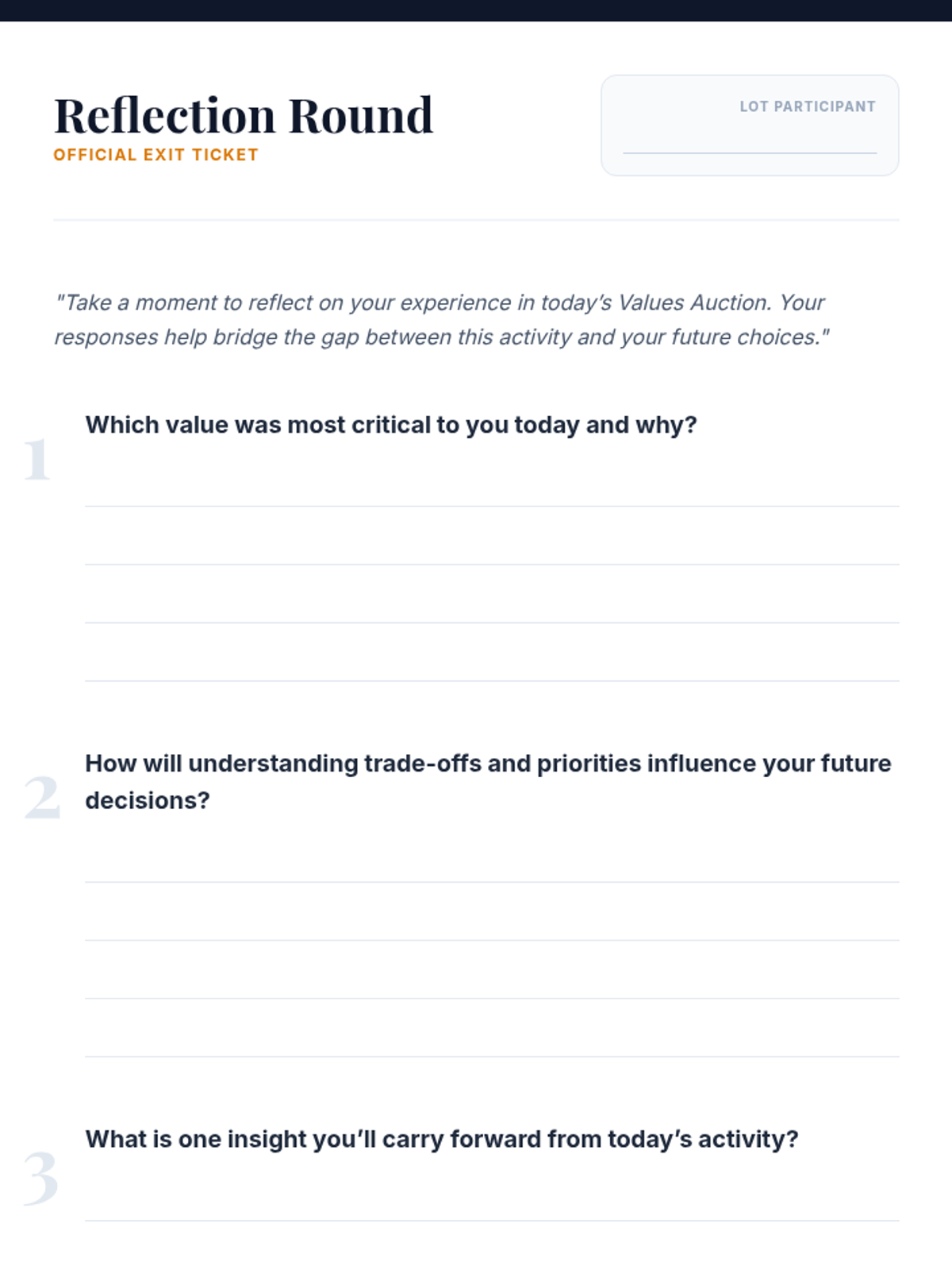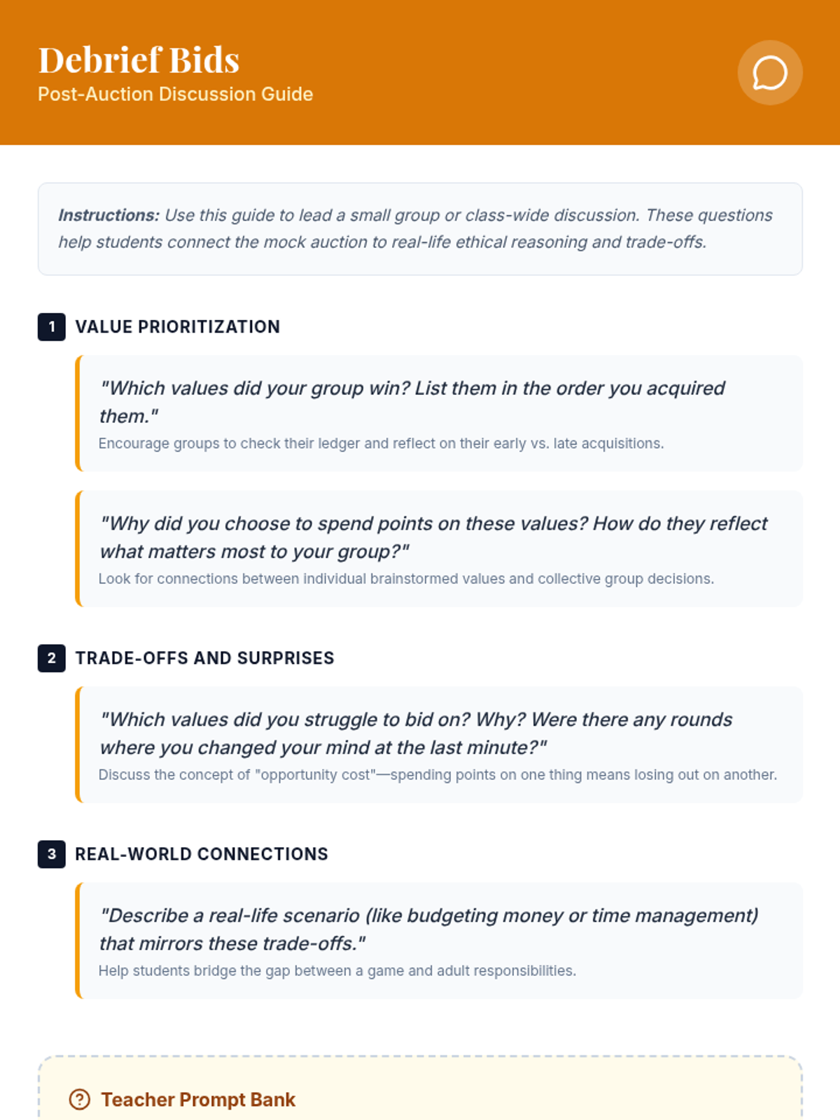 In this Tier 2 group lesson for 10th graders, students engage in a mock auction to bid on and prioritize core values, exploring trade-offs and ethical decision-making. This 35-minute session builds responsible decision-making skills aligned with CASEL.
