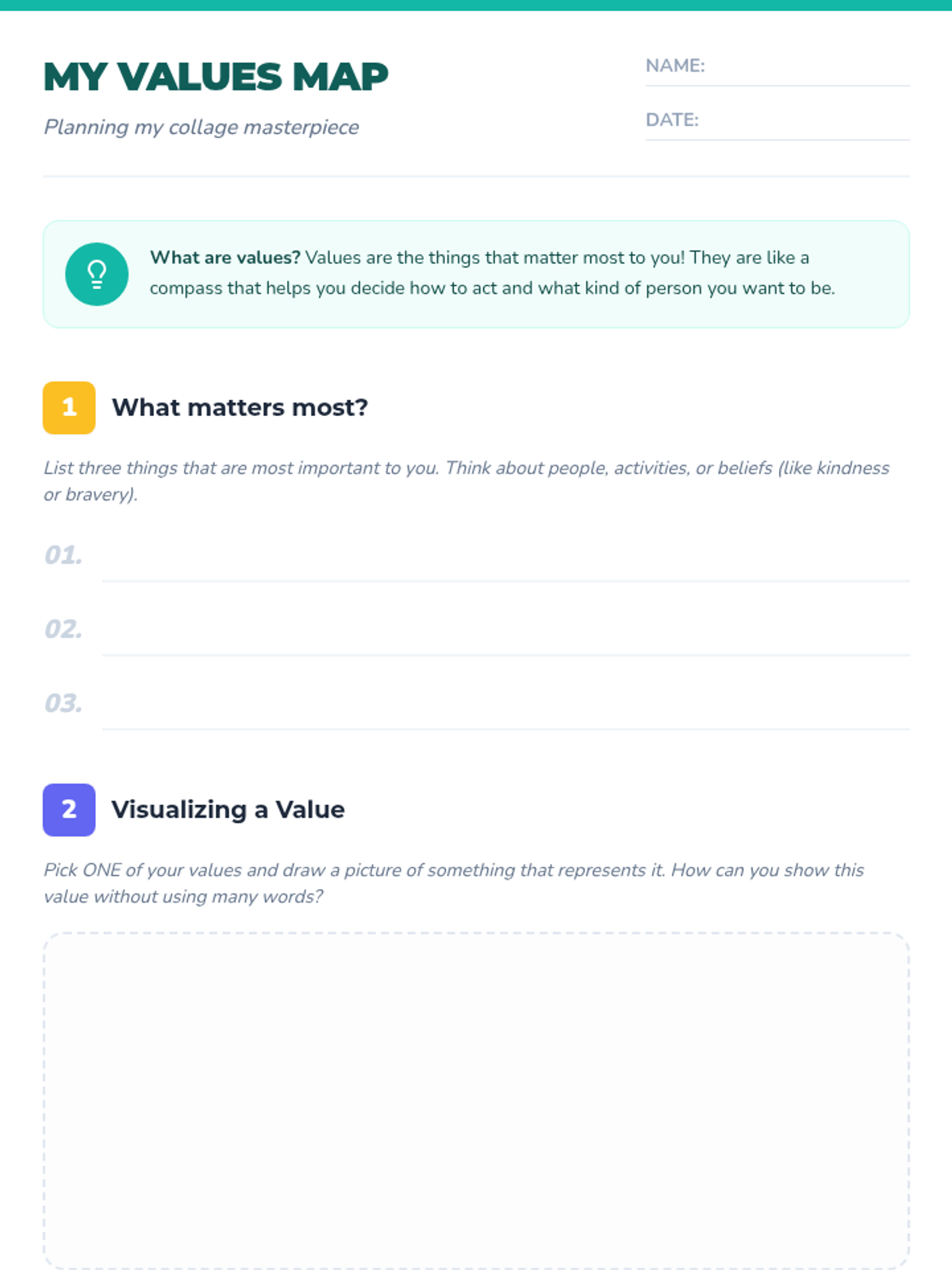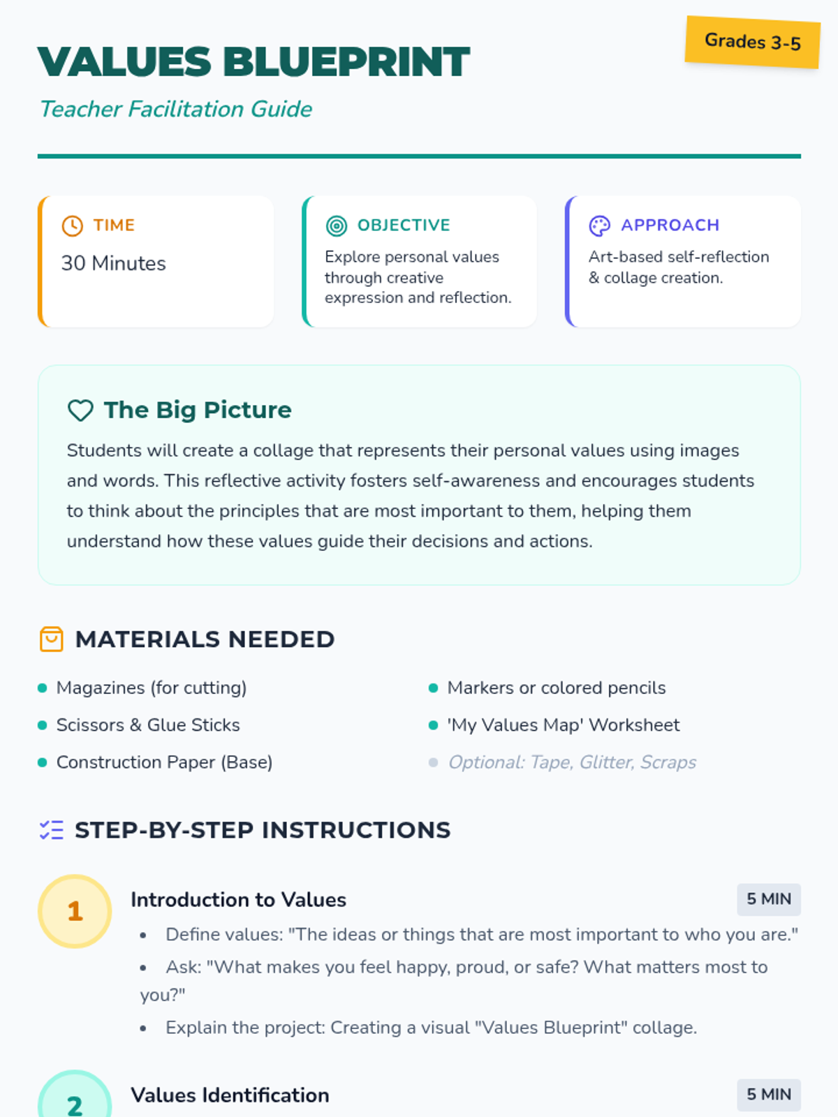 In this lesson, students will create a collage that represents their personal values using images and words from magazines or drawings. This reflective activity fosters self-awareness and encourages students to think about the principles that are most important to them.
