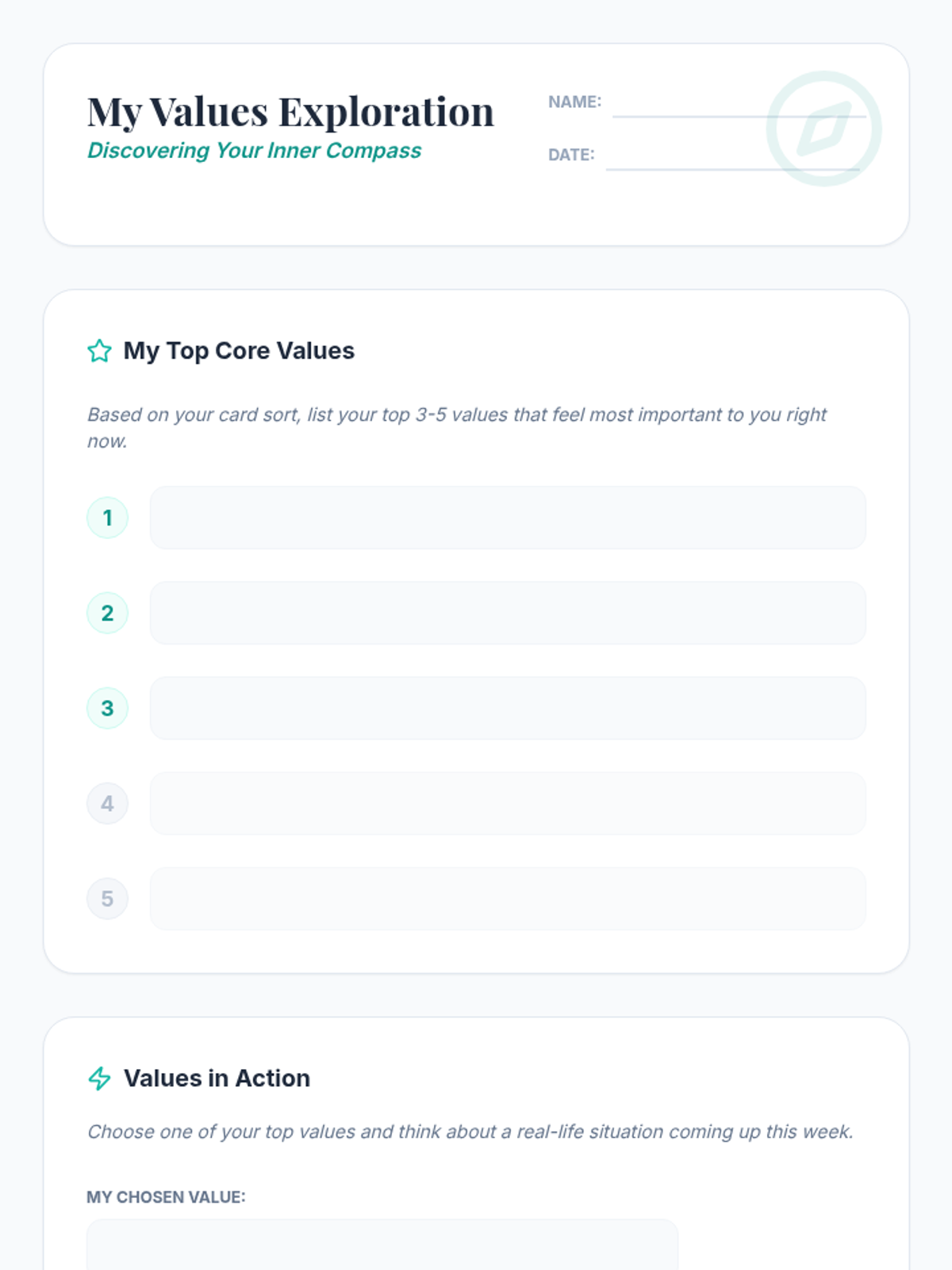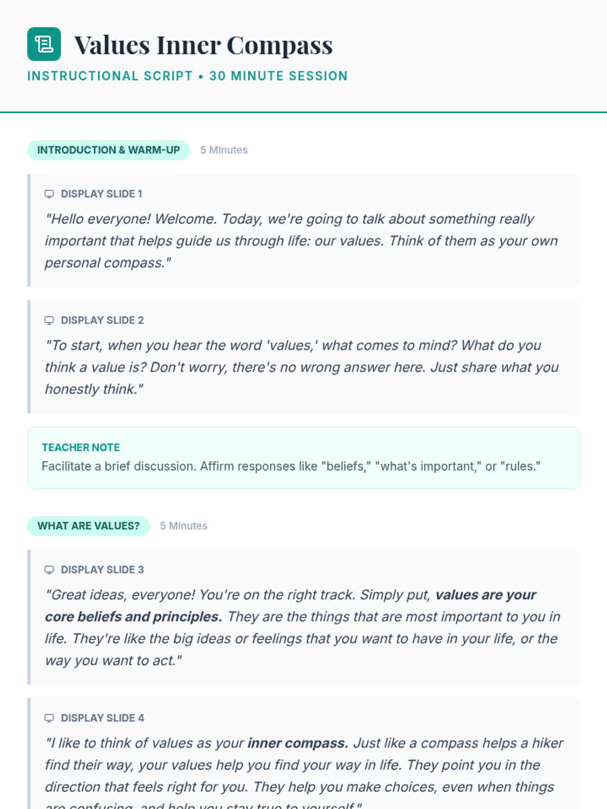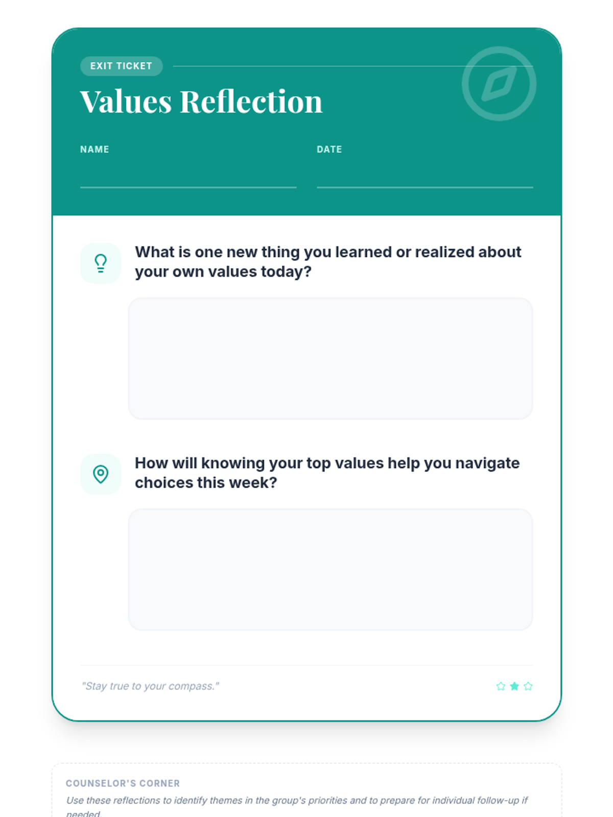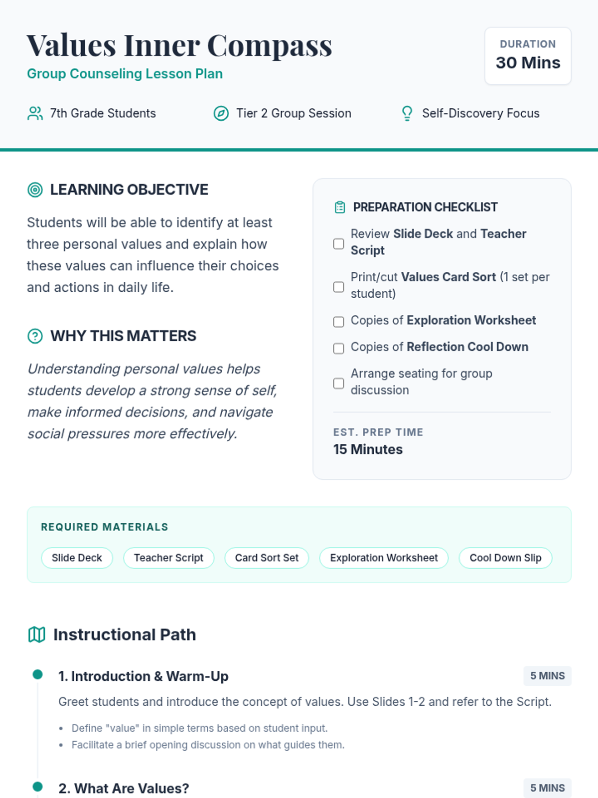 This 30-minute group counseling session helps 7th-grade students identify their personal values and understand how these values can guide their decisions and actions using an 'inner compass' metaphor.