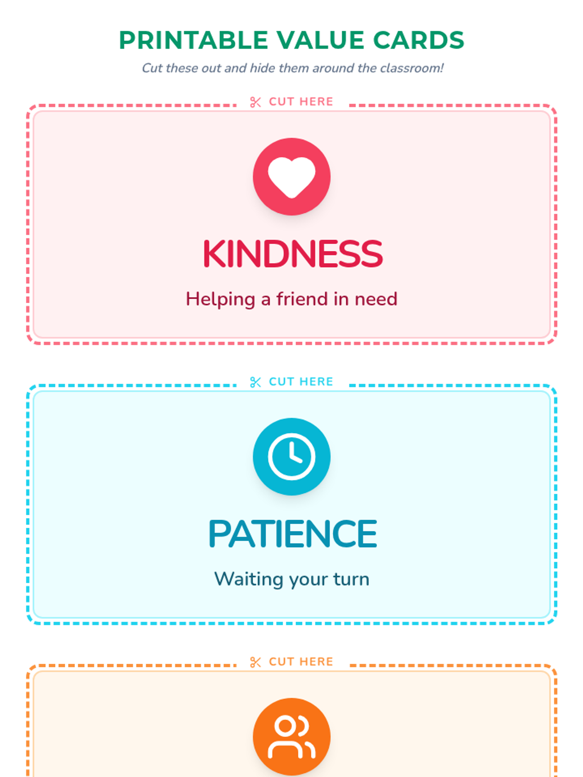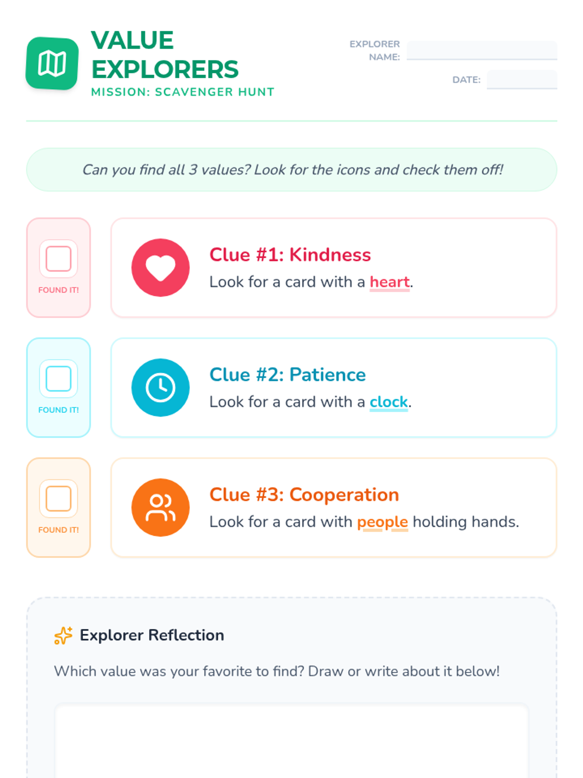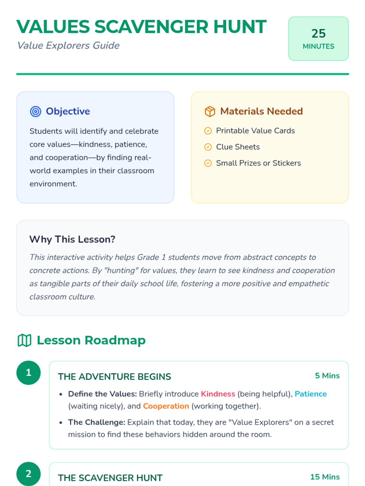 An interactive 25-minute lesson for Grade 1 students to discover and celebrate values like kindness, patience, and cooperation through a scavenger hunt.