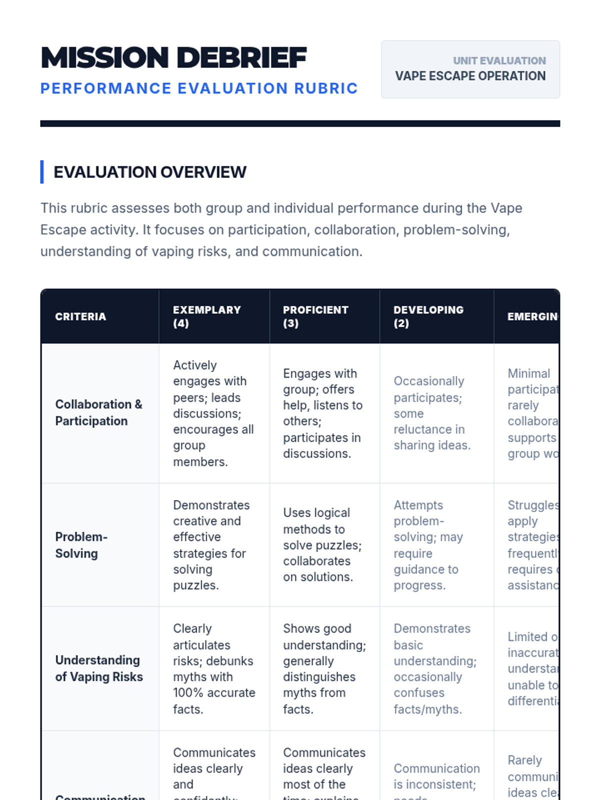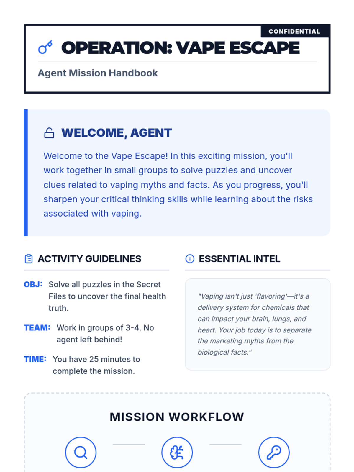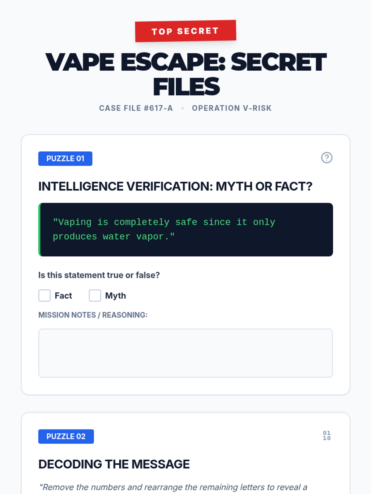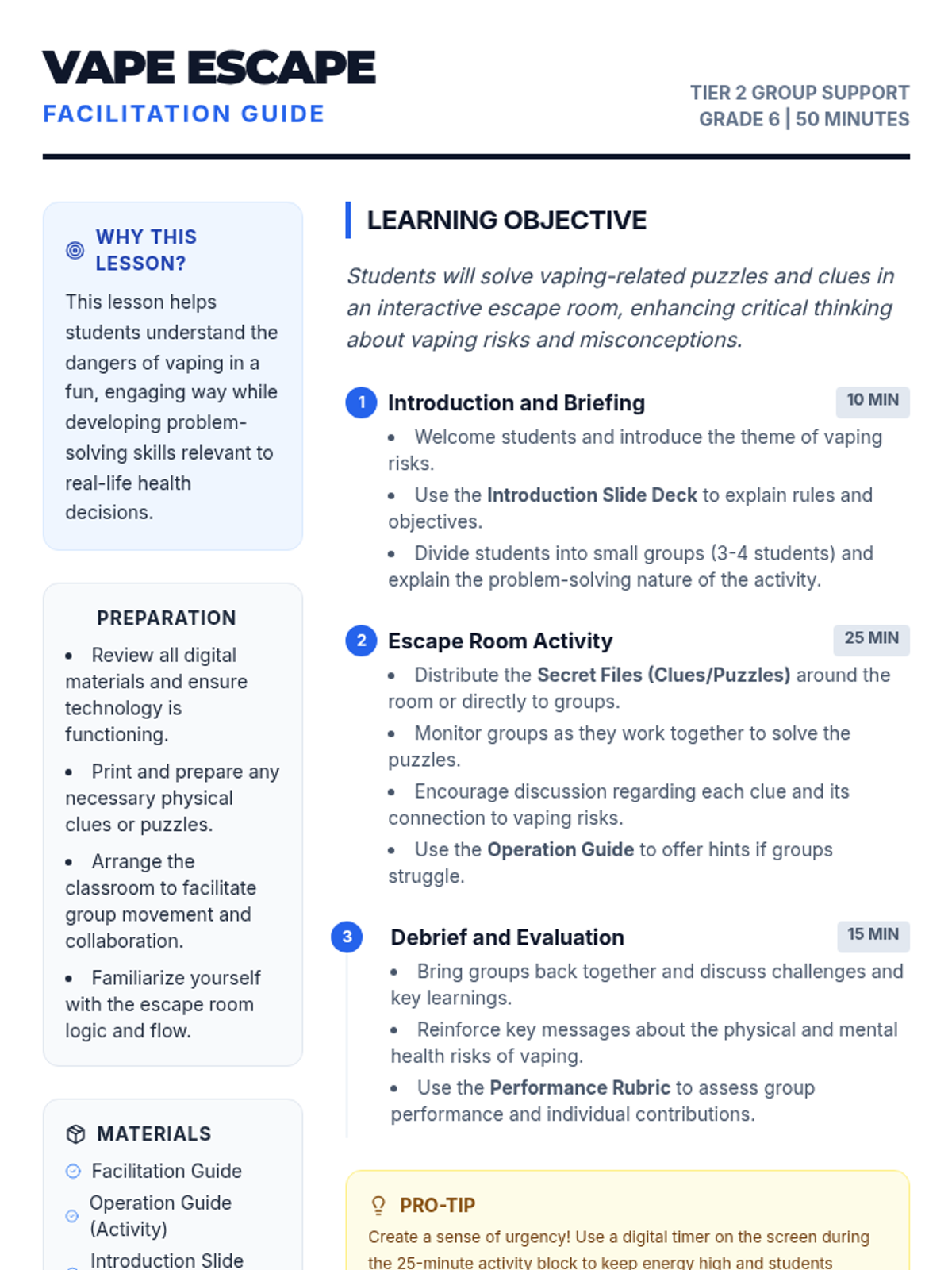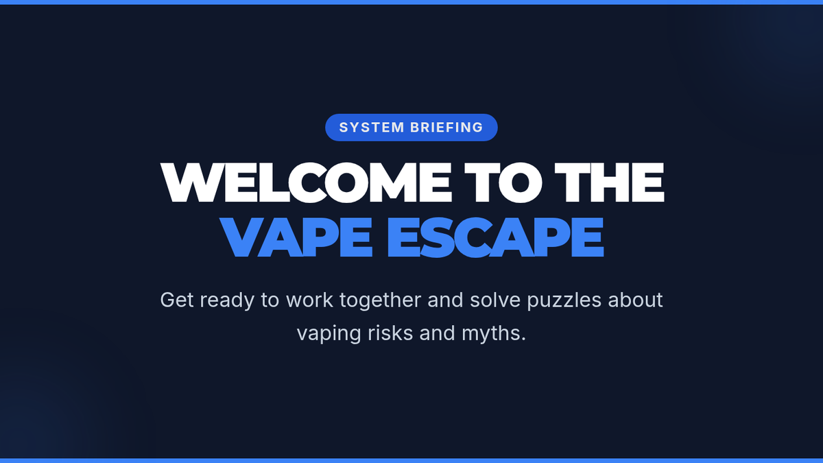 A 50-minute Tier 2 group lesson for 6th graders where they solve vaping-related puzzles in an escape room format to learn about health risks and debunk myths.