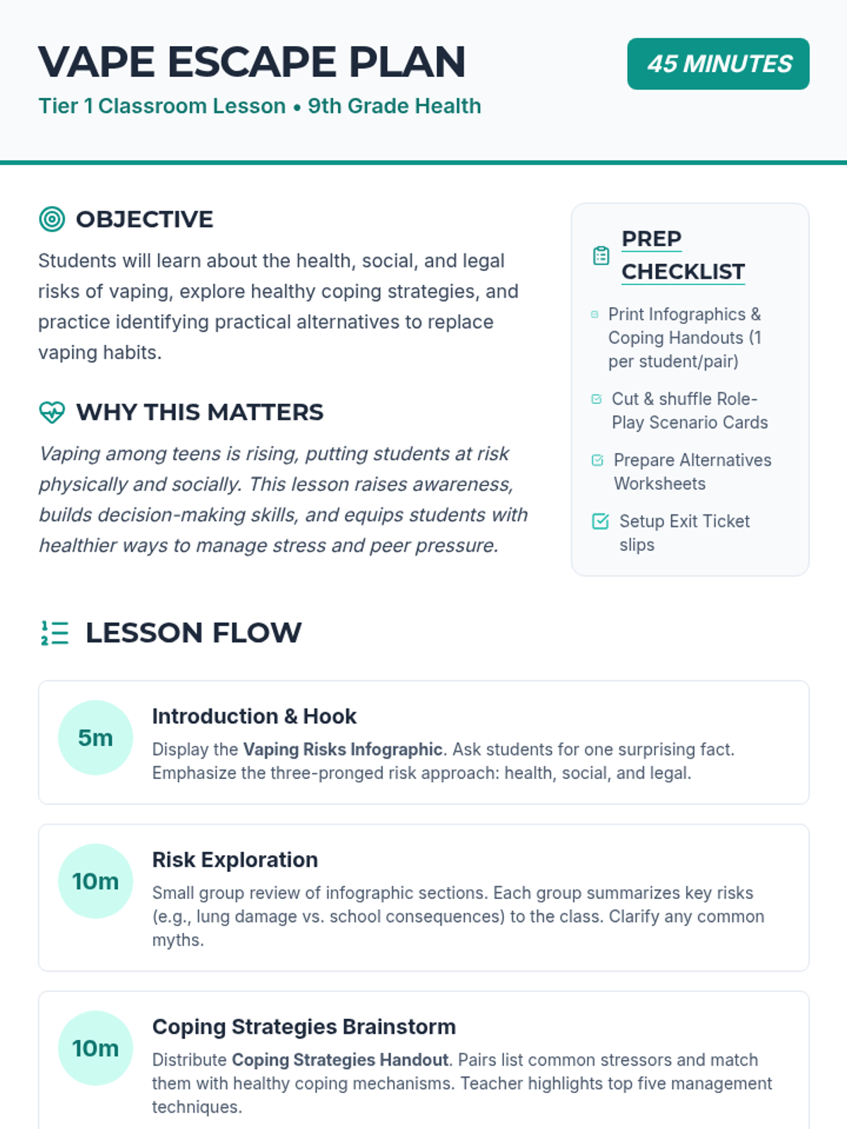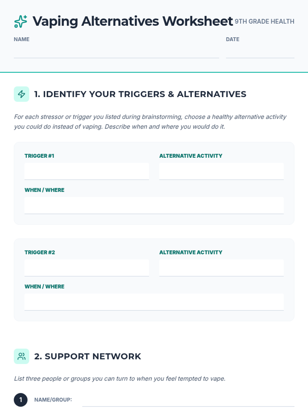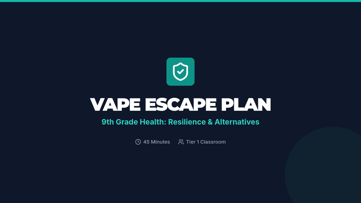 In this 45-minute 9th grade lesson, students explore the risks of vaping, develop healthy coping mechanisms for stress, and identify practical lifestyle alternatives to build resilience and peer pressure resistance.