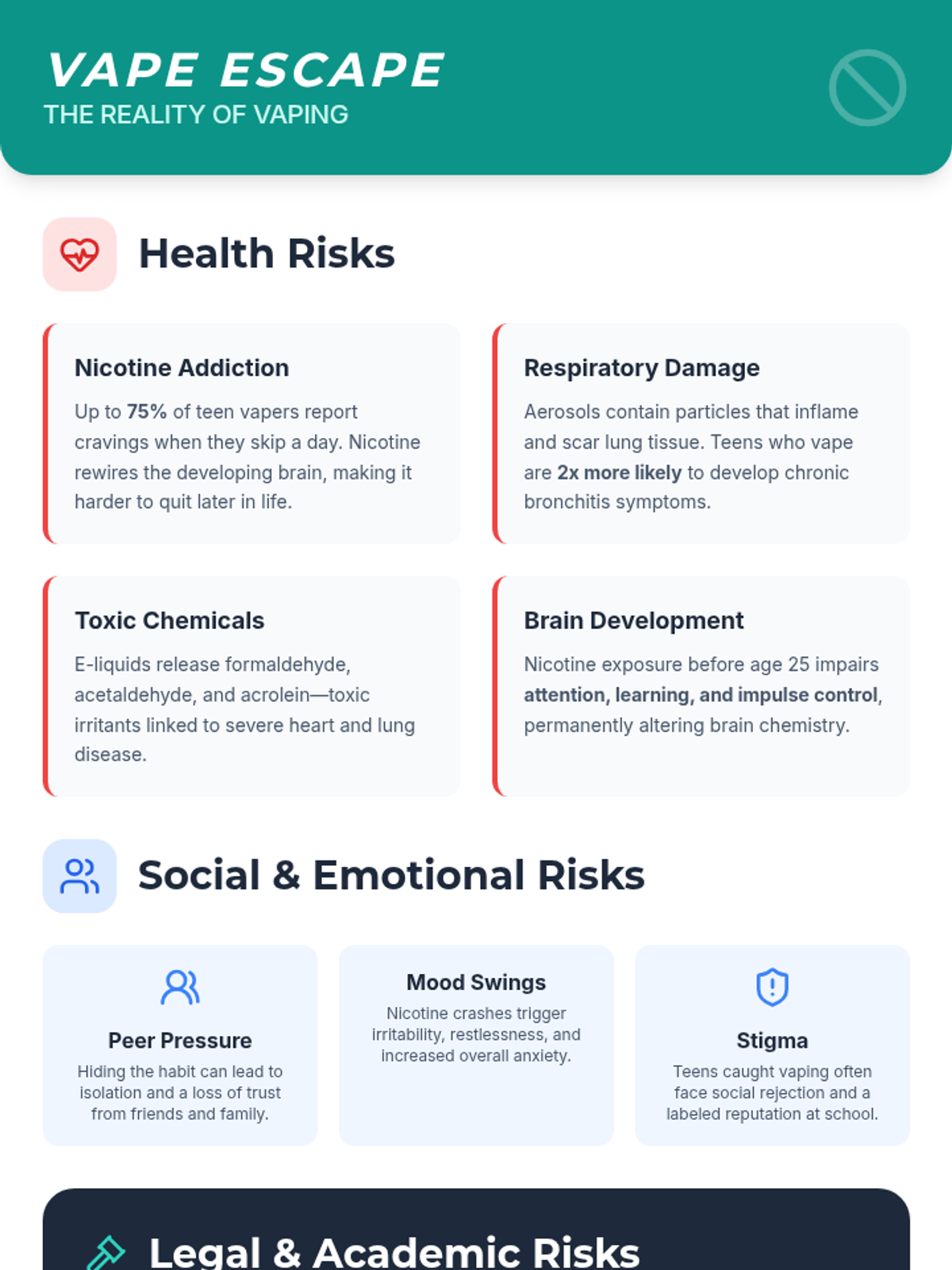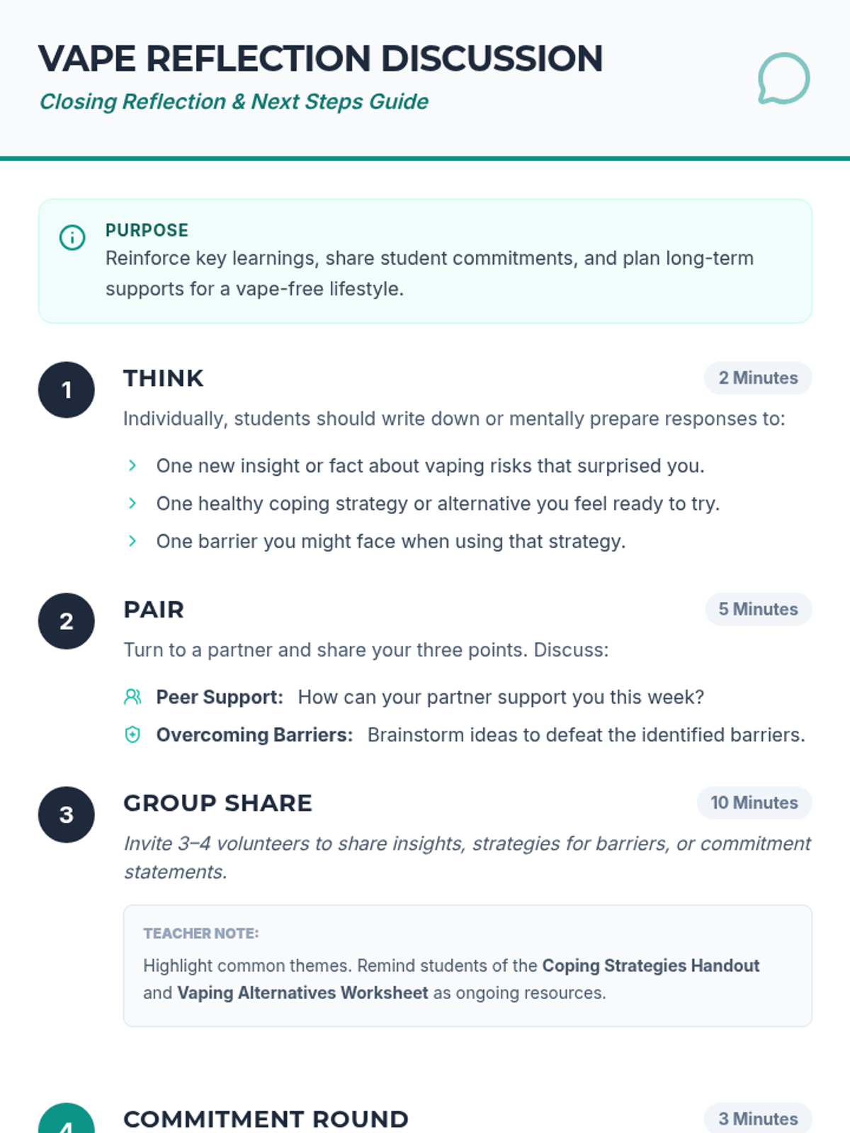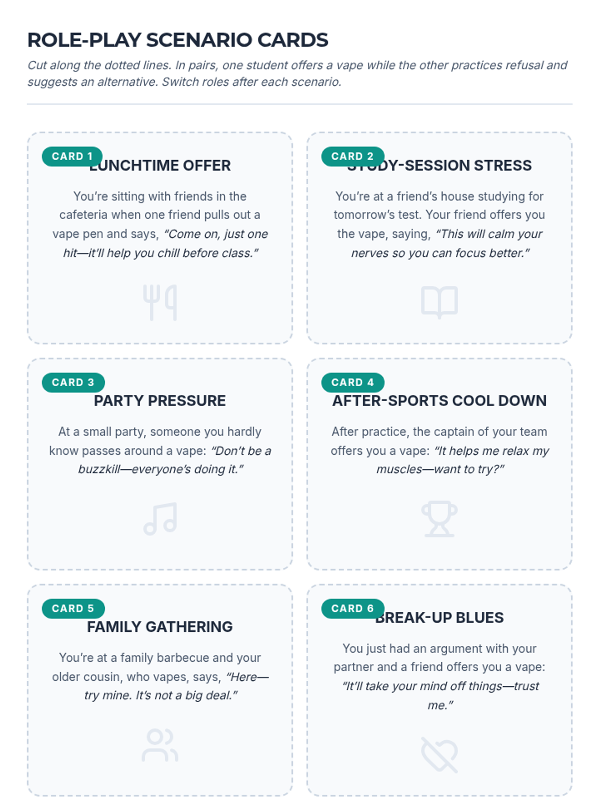 In this 45-minute 9th grade lesson, students explore the risks of vaping, develop healthy coping mechanisms for stress, and identify practical lifestyle alternatives to build resilience and peer pressure resistance.