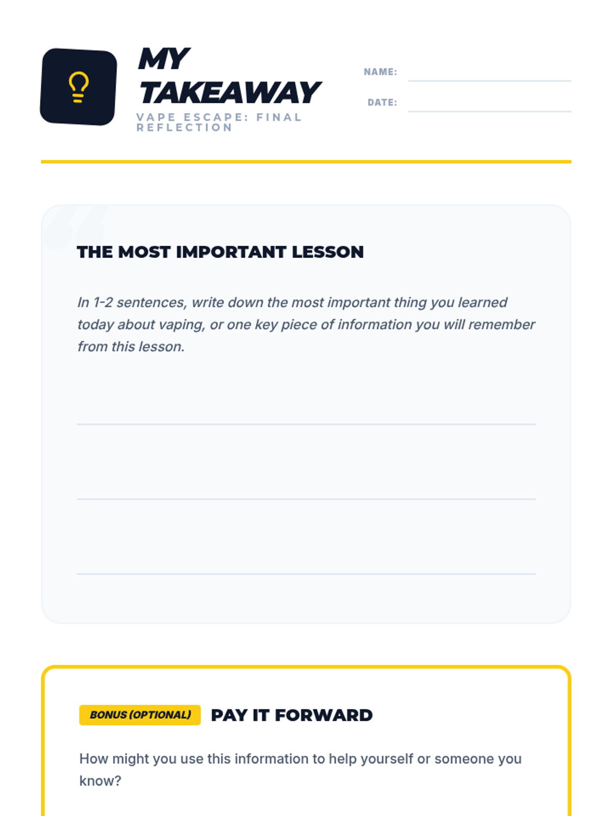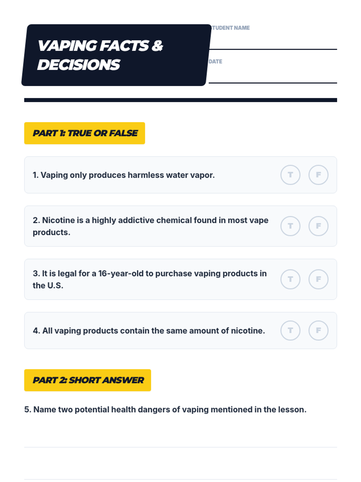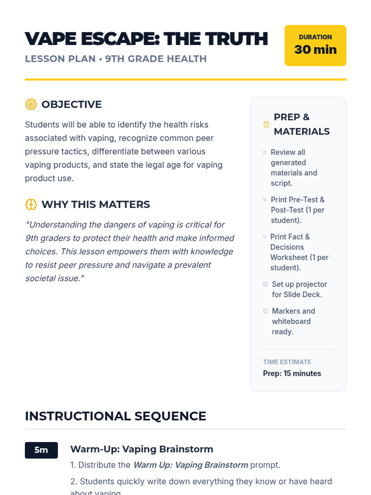 This lesson educates 9th-grade students on the serious dangers of vaping, the pressures of peer influence, the various types of vaping products, and the legal restrictions for youth under 21. It aims to equip students with crucial knowledge to make informed decisions regarding their health and well-being.