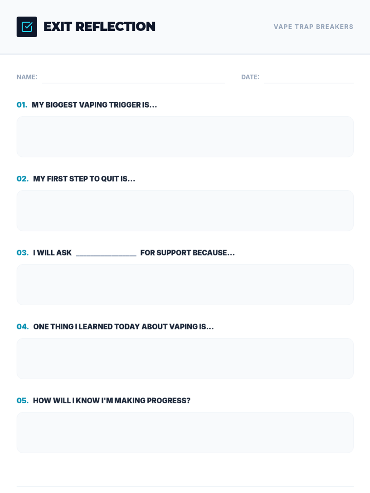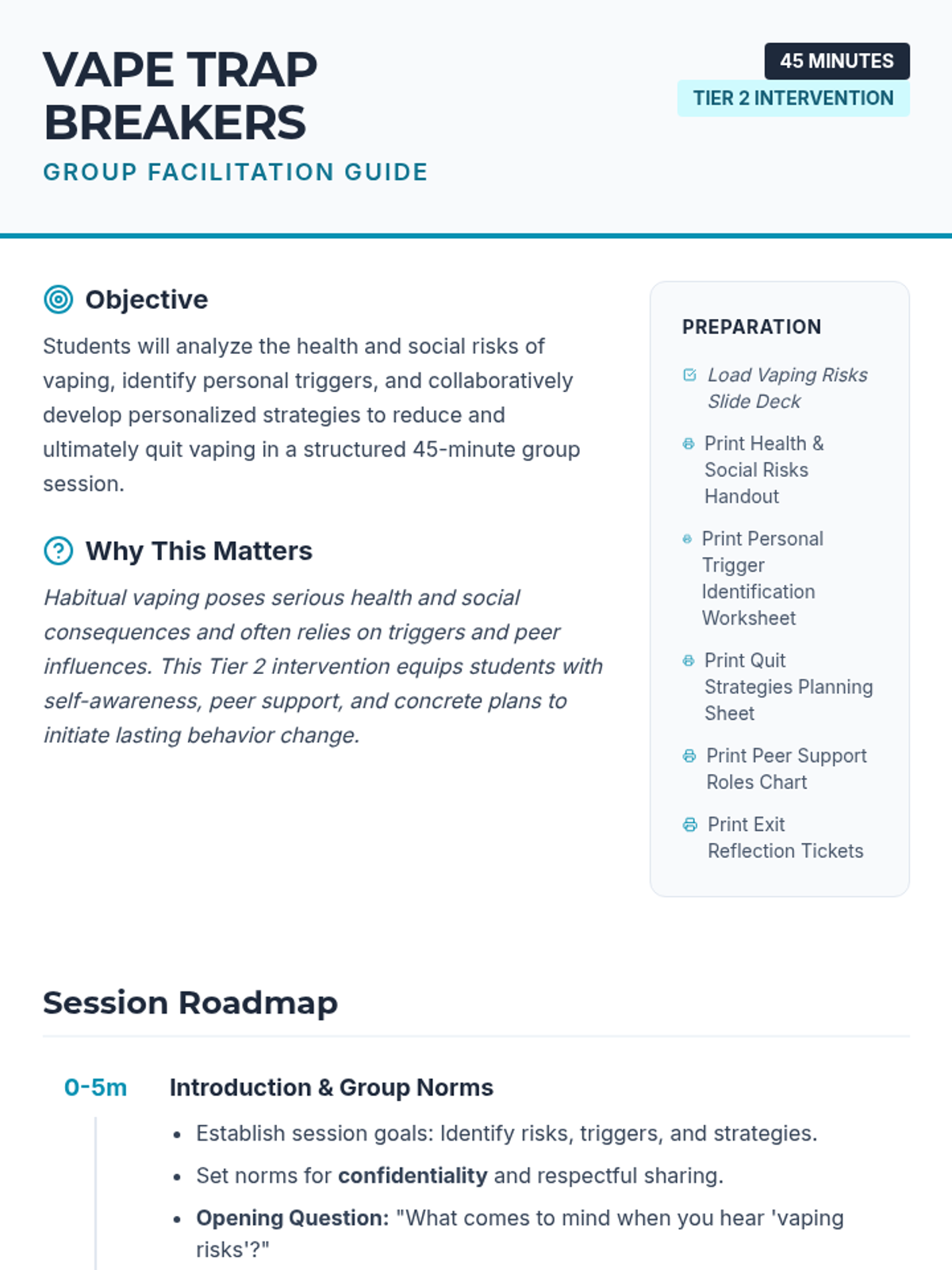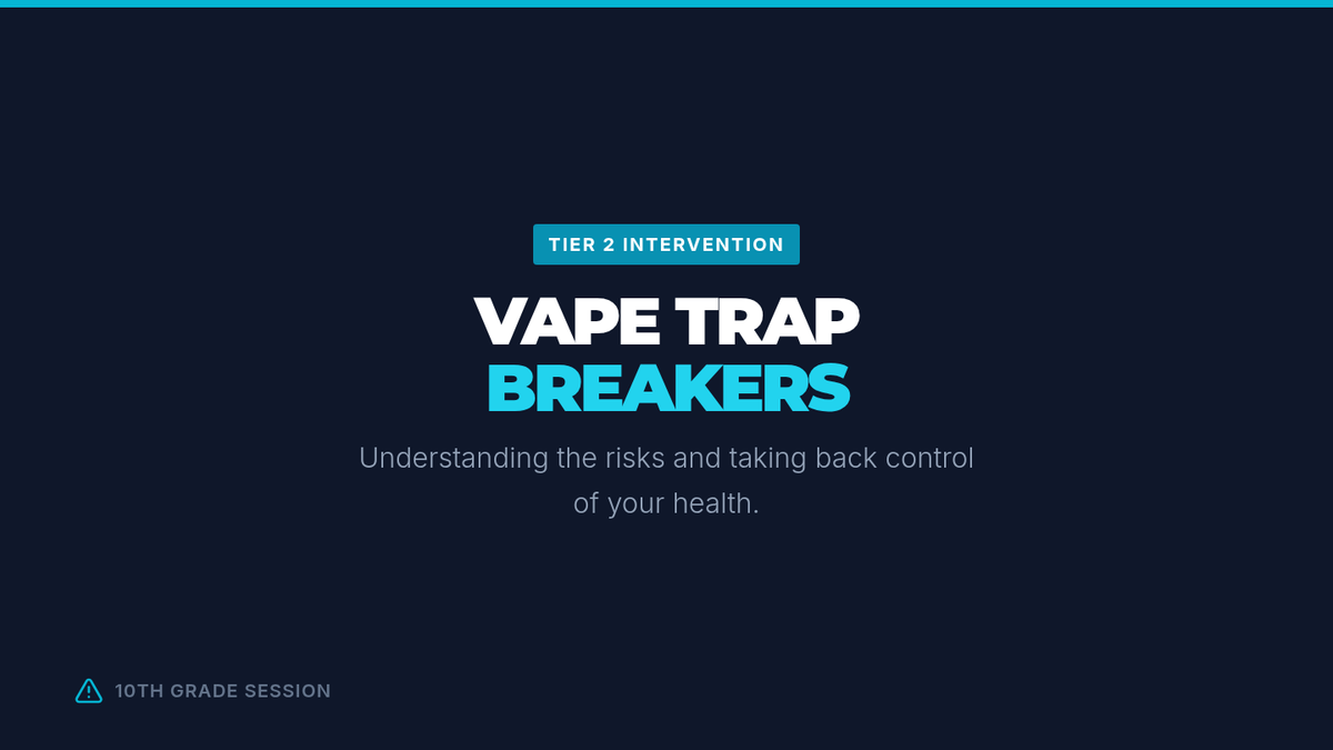 A 45-minute Tier 2 intervention for 10th graders to identify vaping risks, personal triggers, and actionable quit strategies through peer support and reflection.