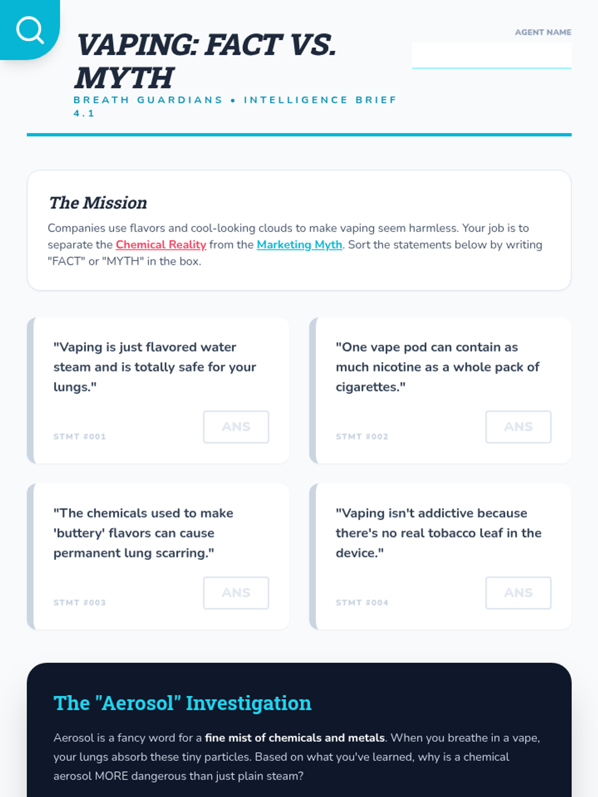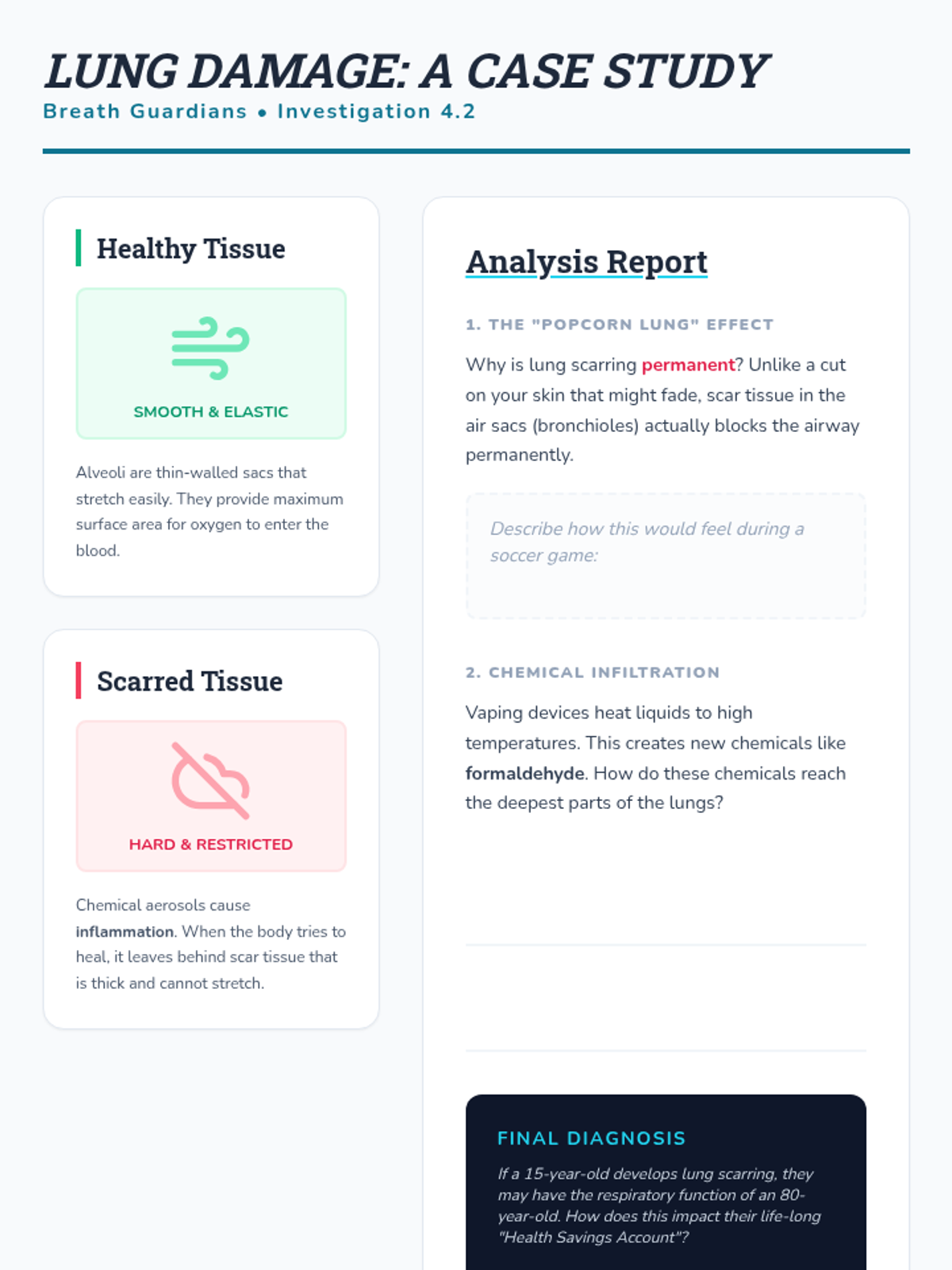 This lesson debunks vaping myths by examining 'popcorn lung' and the chemical scarring caused by aerosols. Students compare healthy vs. damaged tissue to understand long-term health risks.