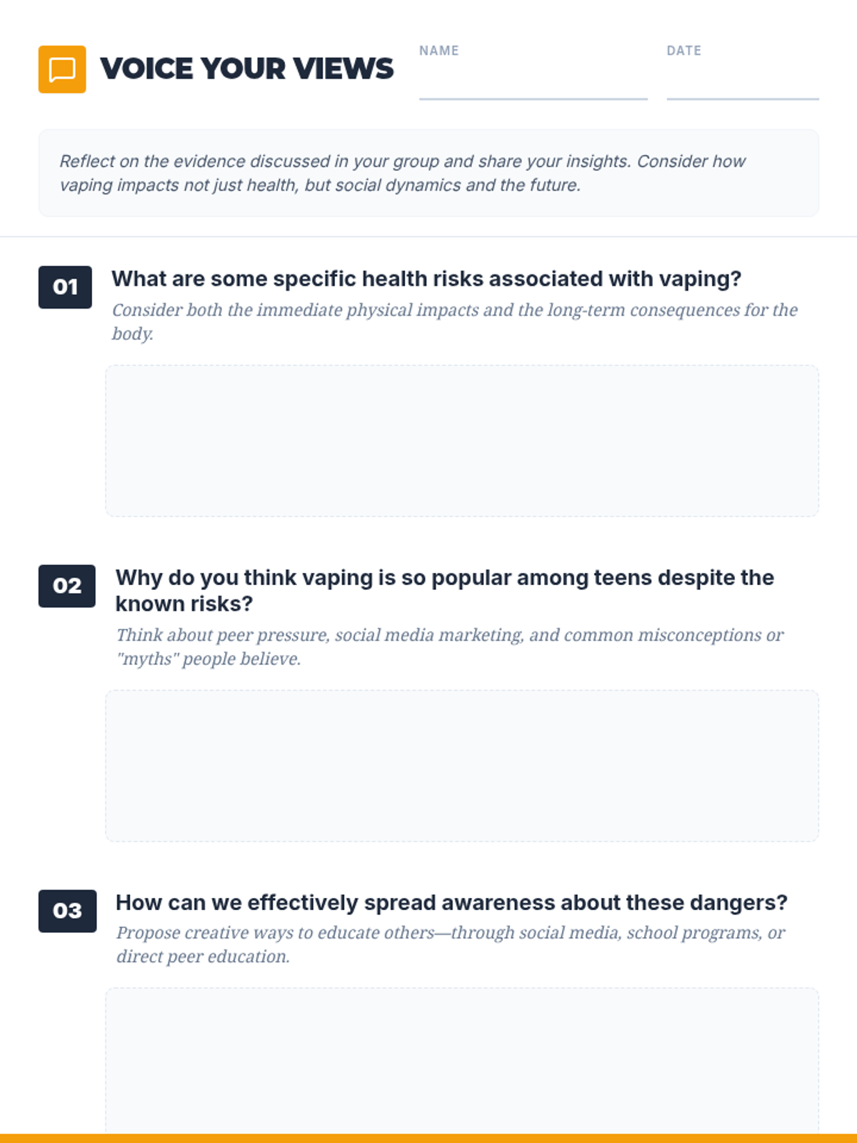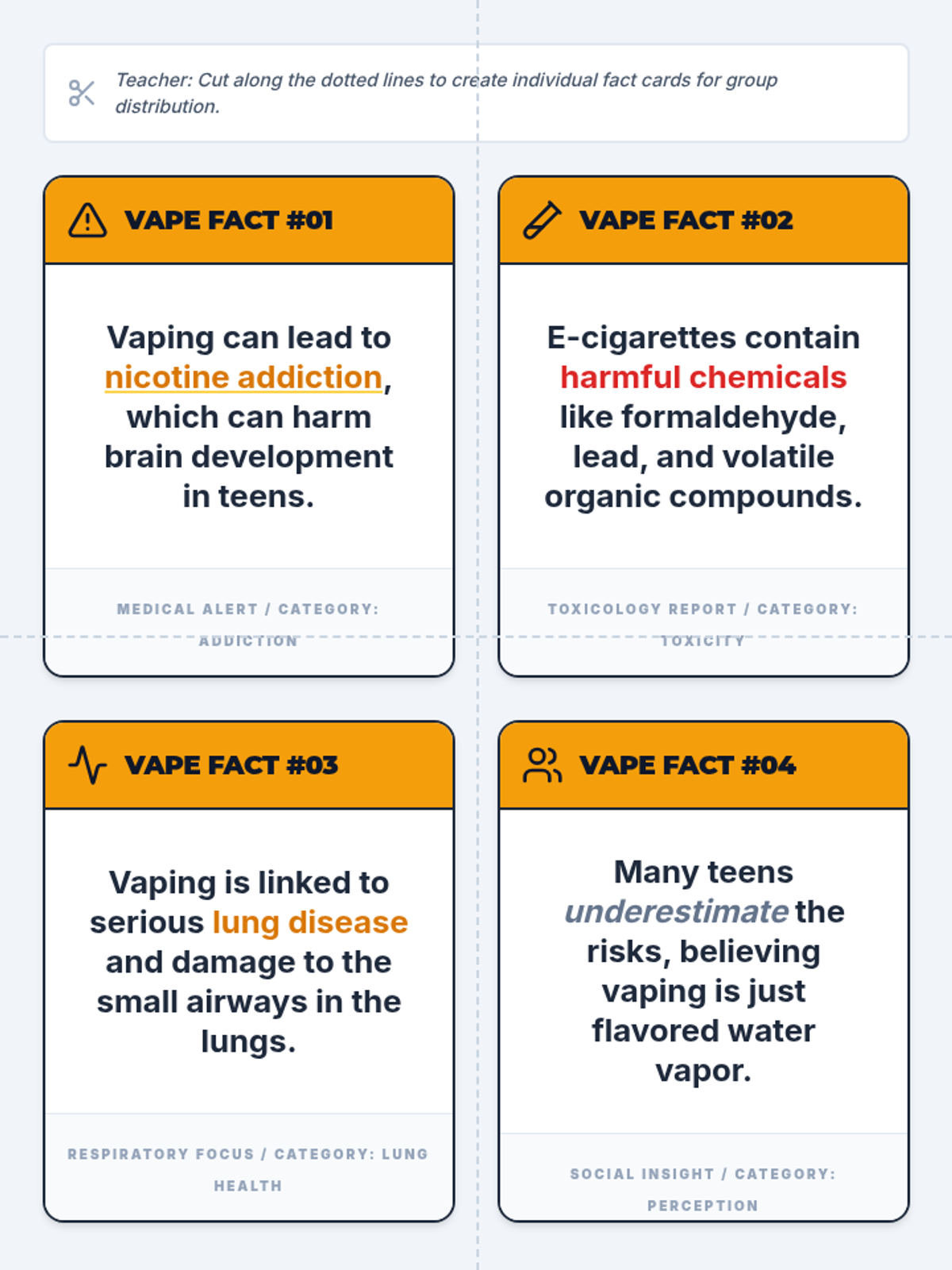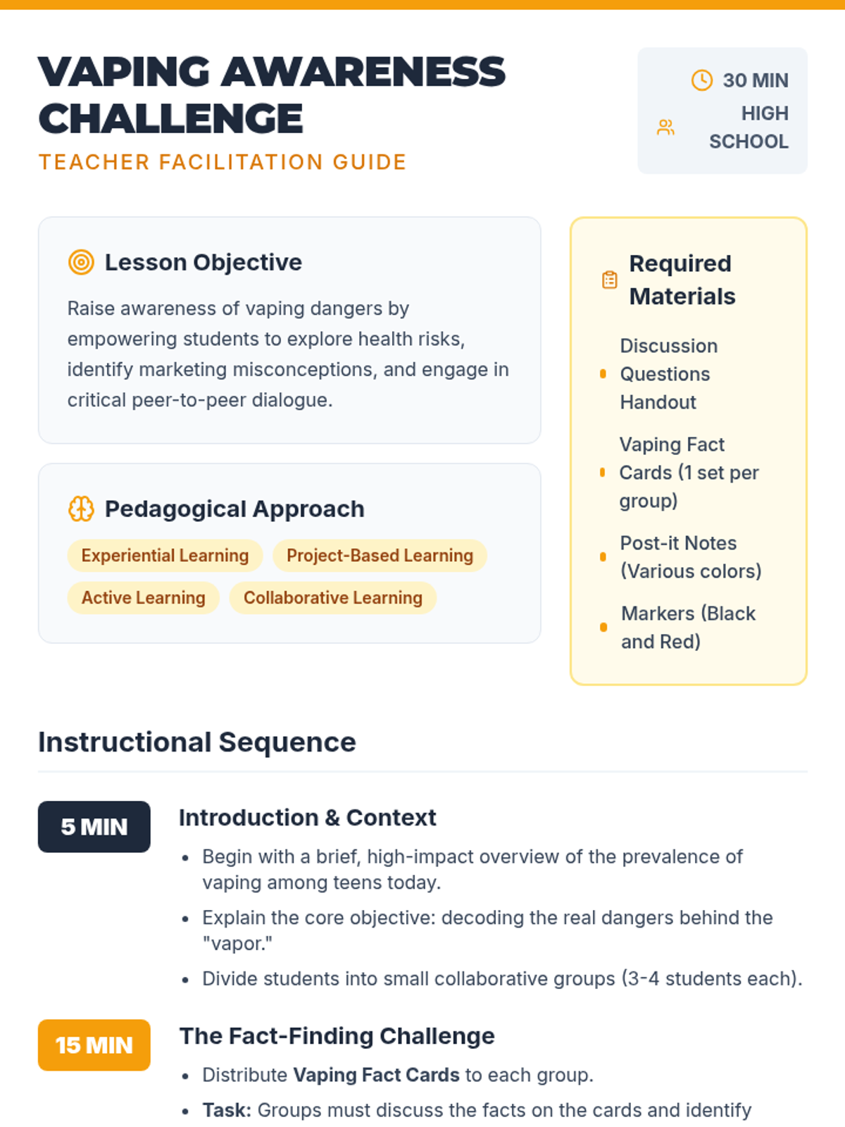 An interactive high school lesson designed to expose the hidden dangers of vaping through collaborative fact-finding and critical discussion. Students will analyze health risks and deconstruct misconceptions to empower informed decision-making.