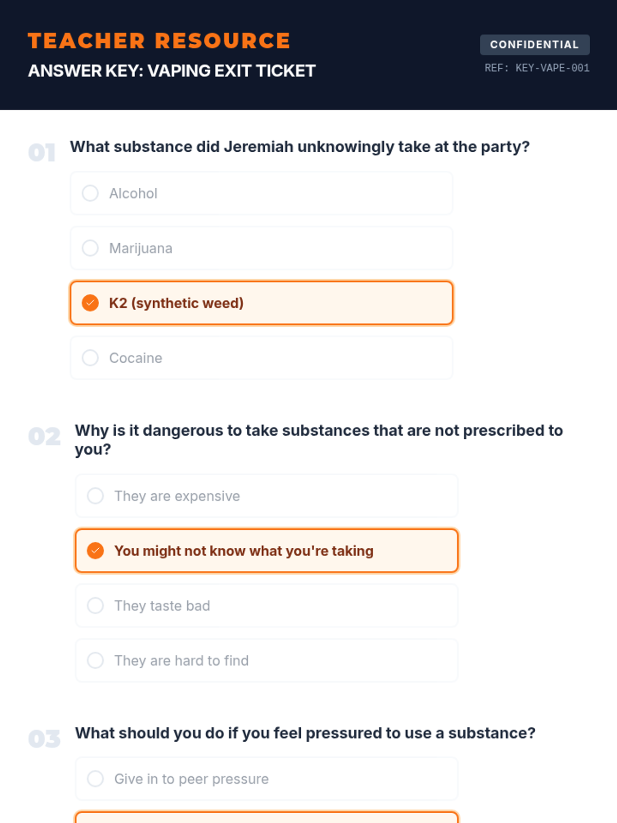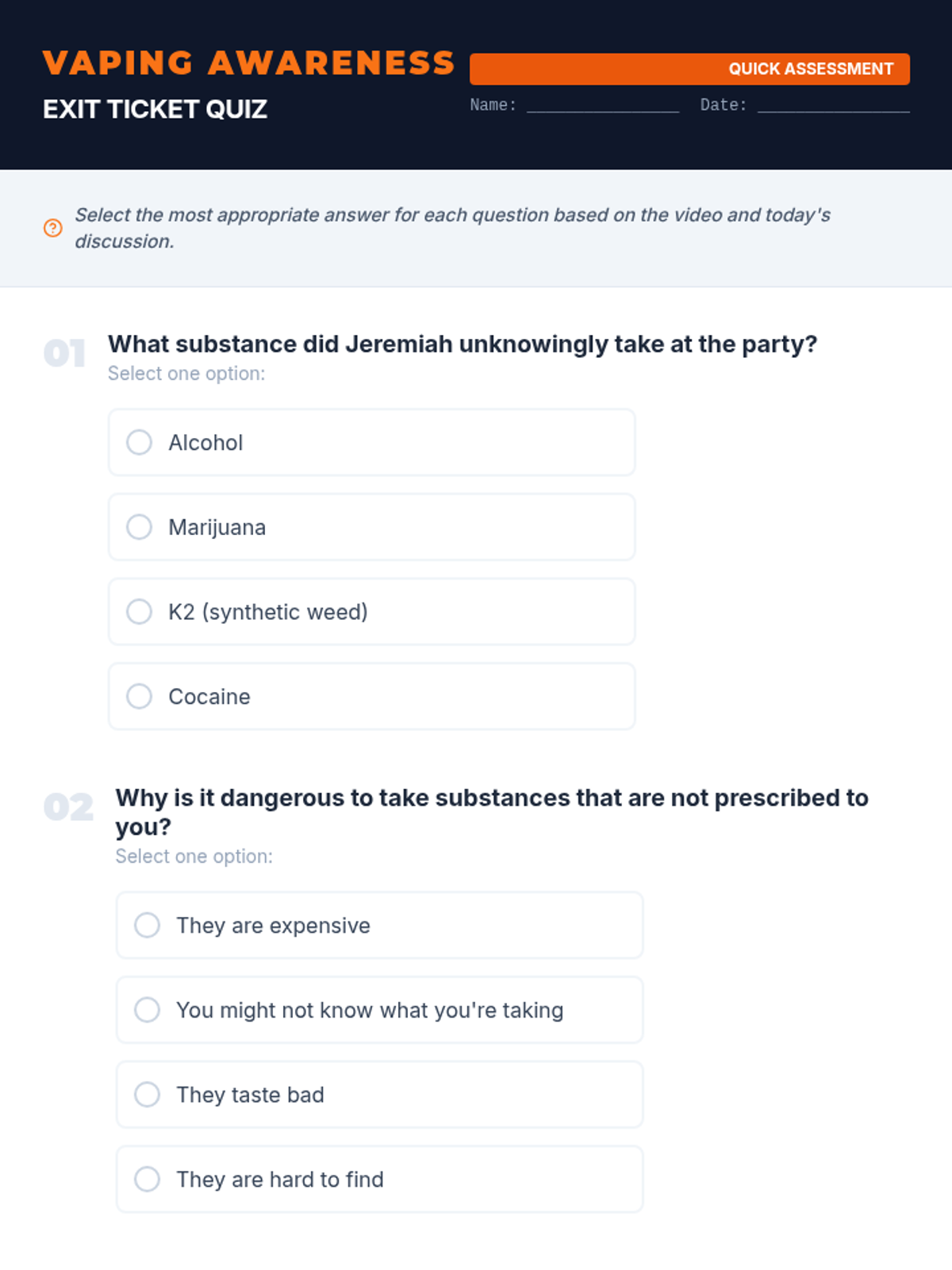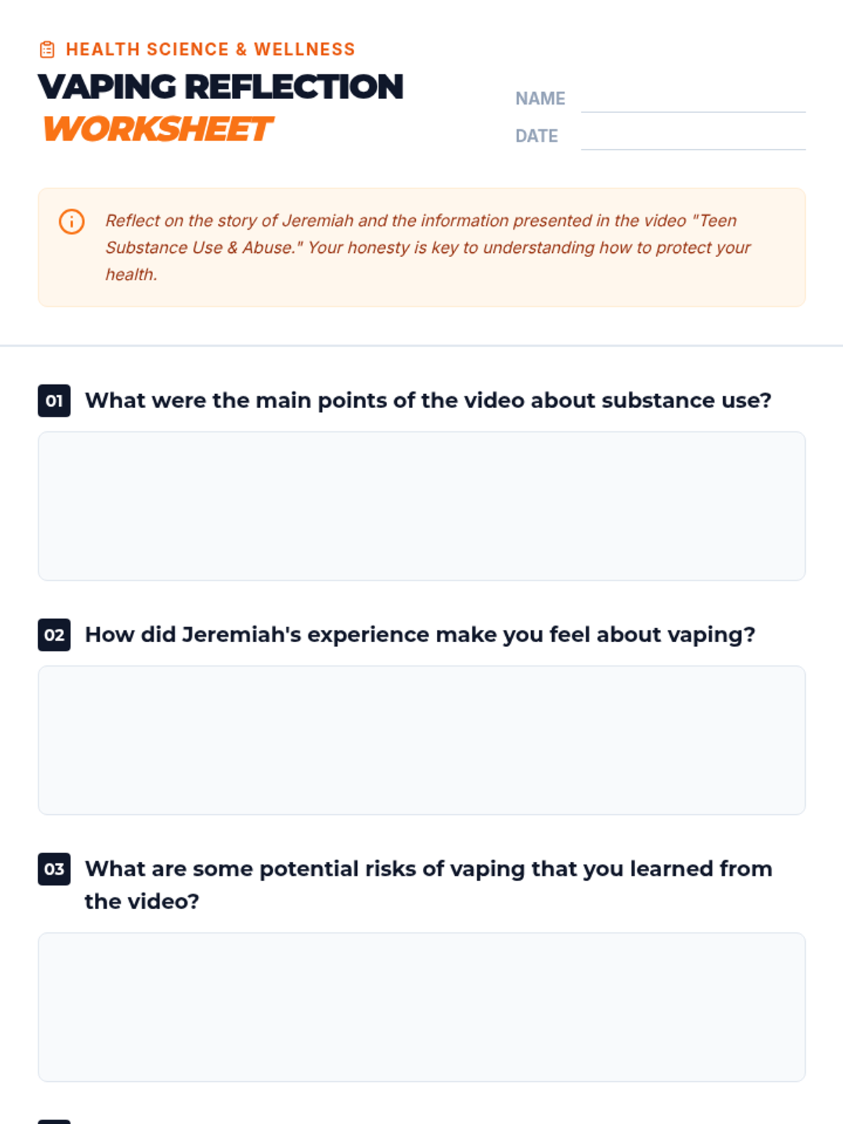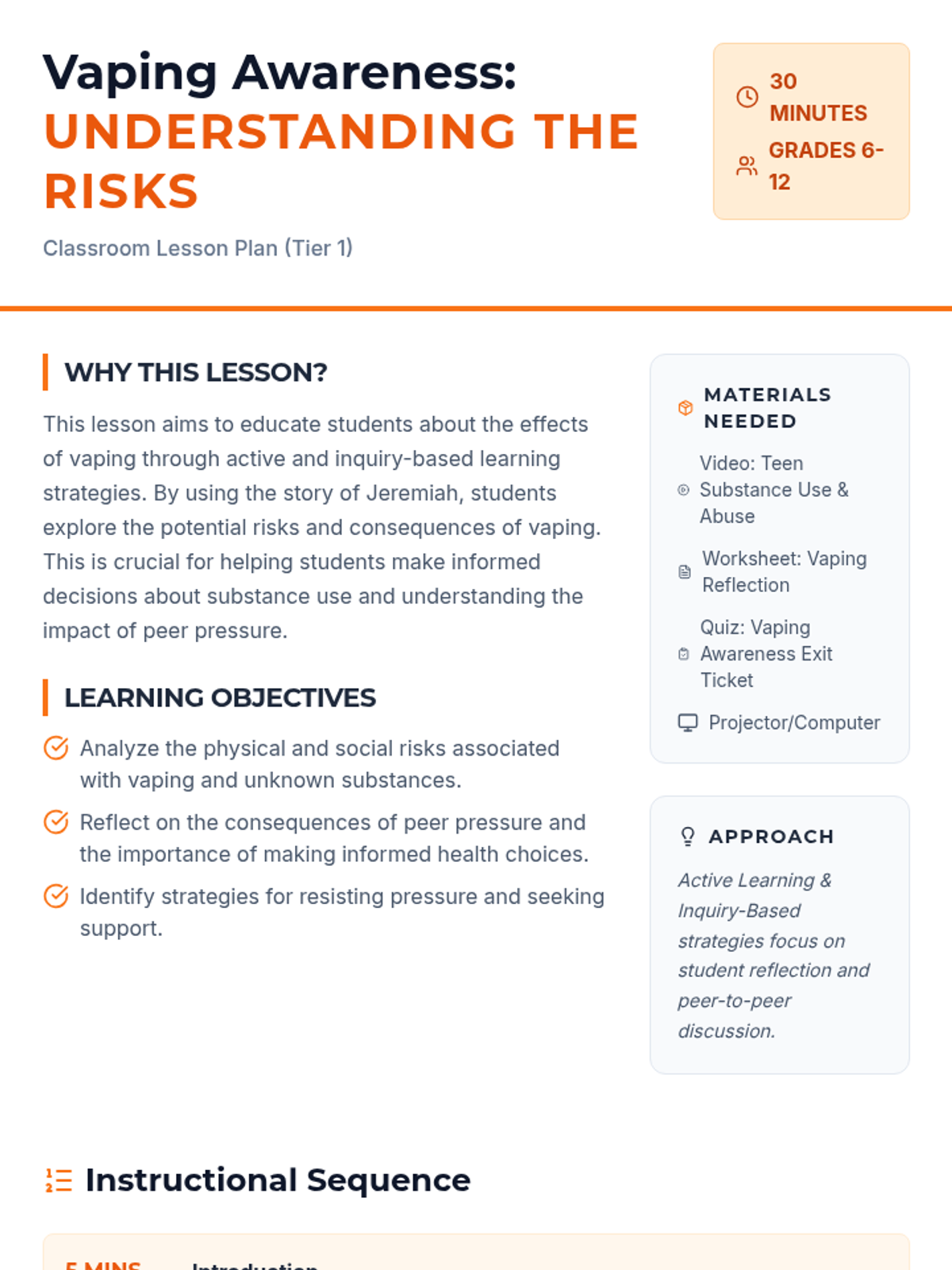 This lesson educates students on the risks of vaping through active inquiry and reflection on real-life consequences. Students will watch a impactful story, engage in group discussions, and reflect on the dangers of unknown substances and peer pressure.