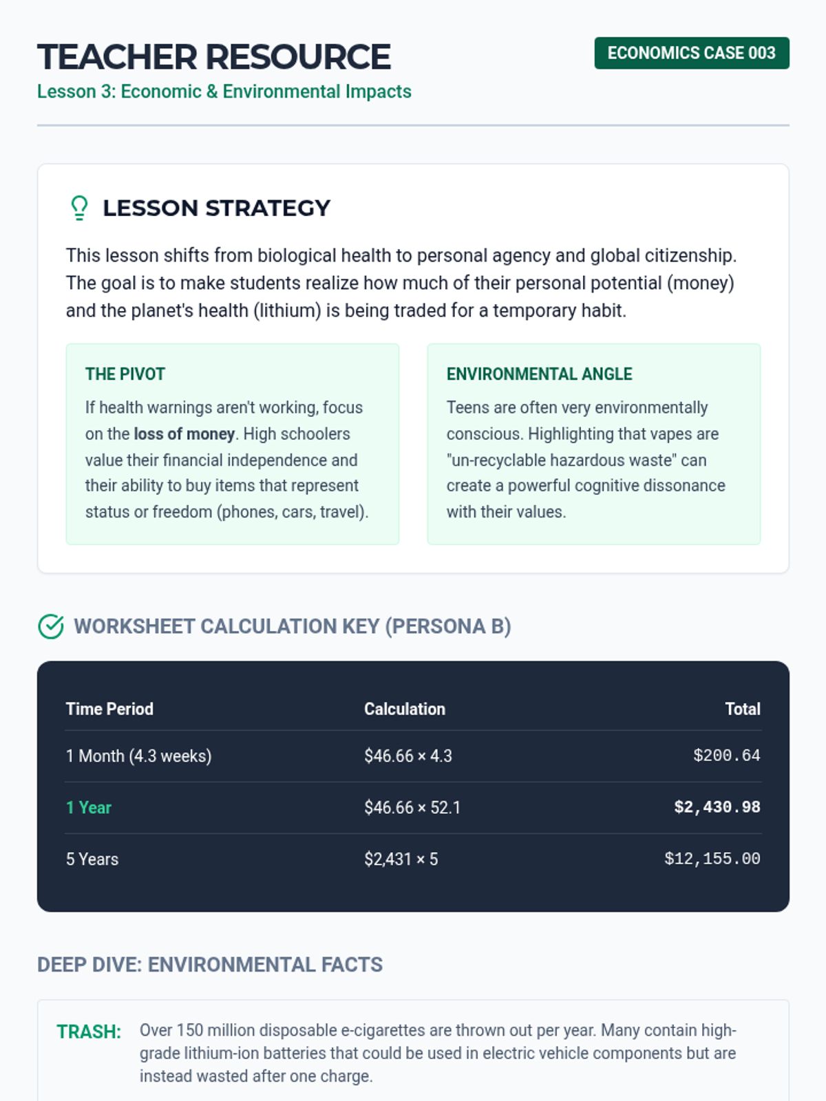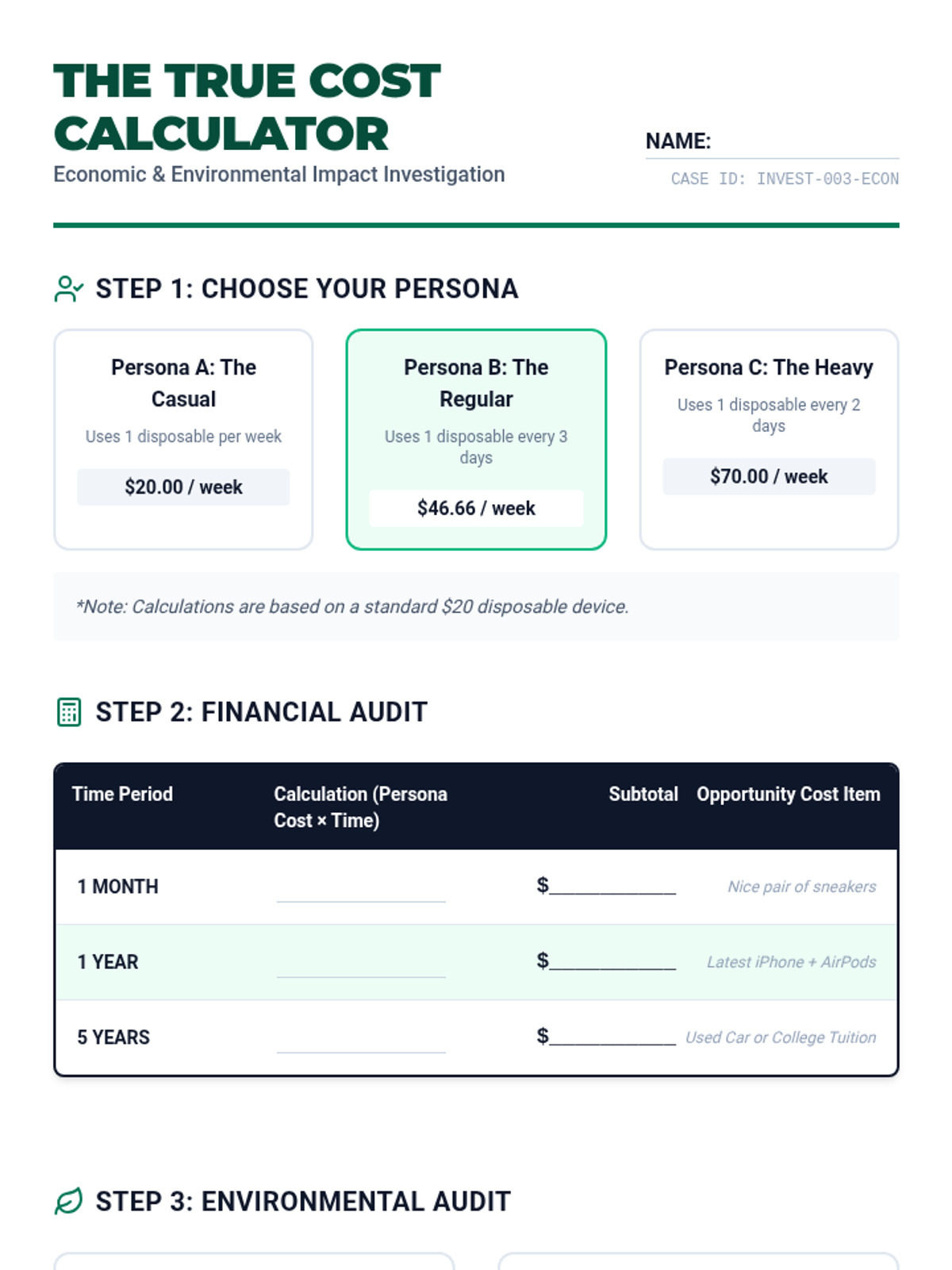 Students calculate the long-term financial costs and evaluate the environmental footprint of disposable vaping products.